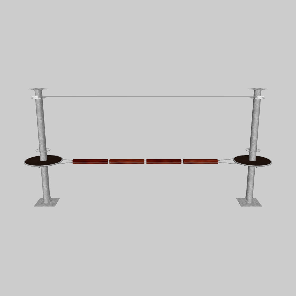 Juego diseñado para parques de aventura, compatible con estructuras de postes de acero o montajes en árboles. Disponible en longitudes estándar de 6 y 7 metros. Para dimensiones personalizadas, consulte con IMN. Anclajes incluidos. Estructura no incluida.