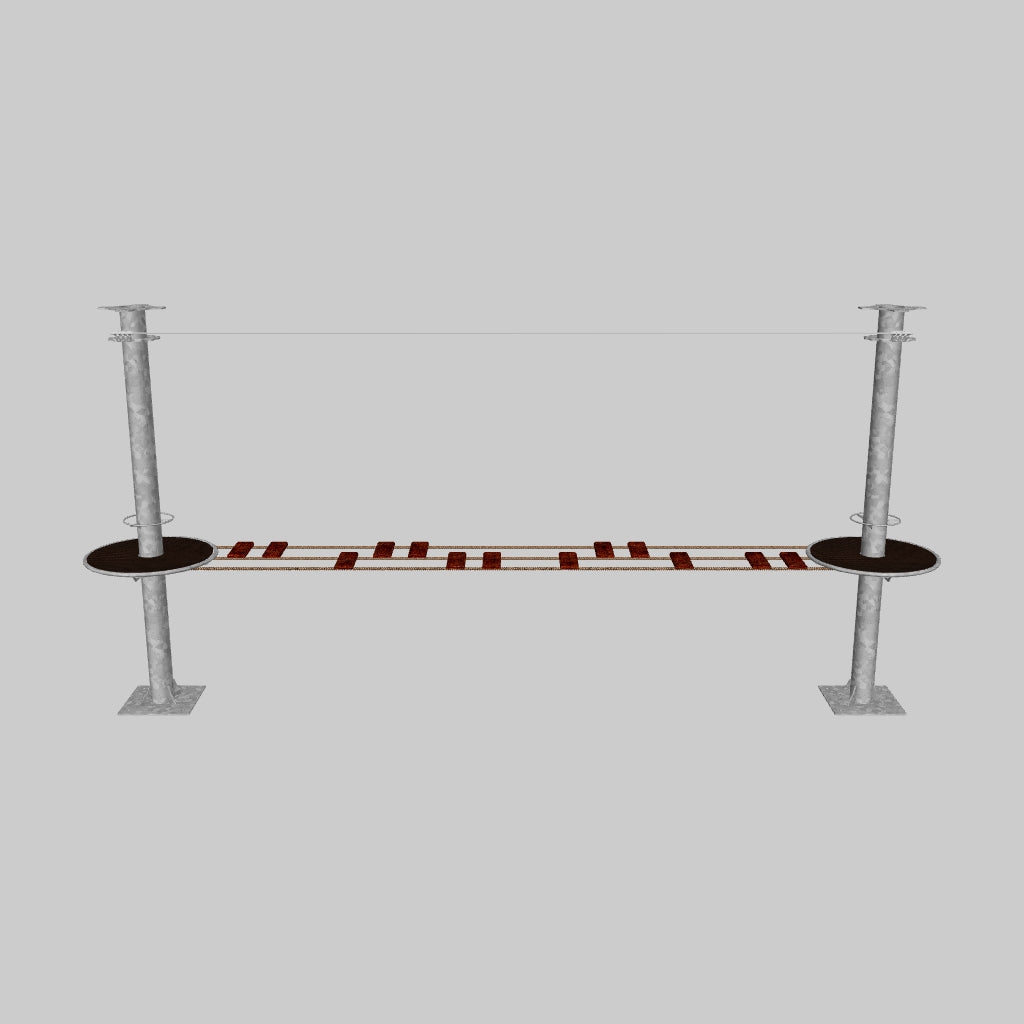Juego diseñado para parques de aventura, compatible con estructuras de postes de acero o montajes en árboles. Disponible en longitudes estándar de 6 y 7 metros. Para dimensiones personalizadas, consulte con IMN. Anclajes incluidos. Estructura no incluida.