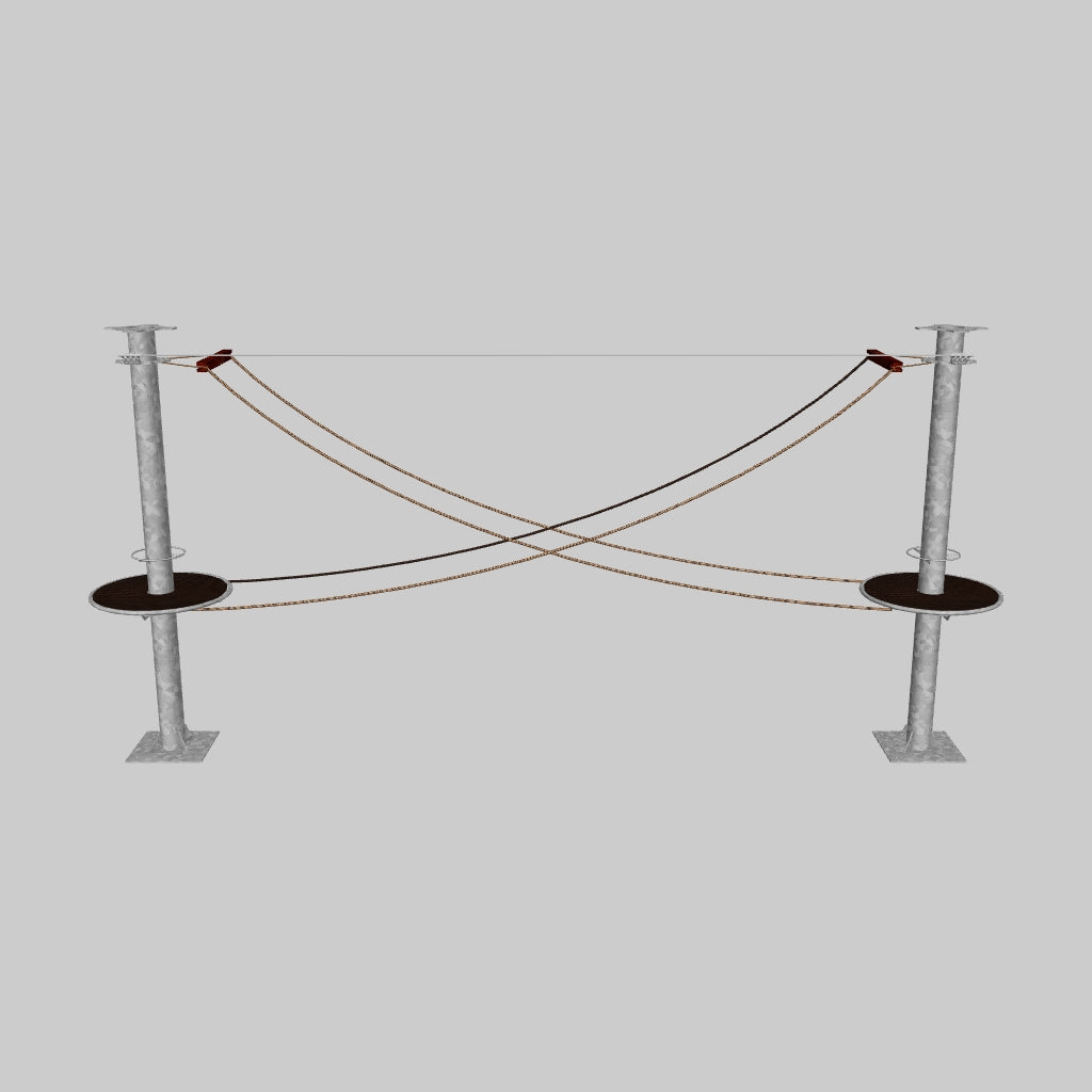 Juego diseñado para parques de aventura, compatible con estructuras de postes de acero o montajes en árboles. Disponible en longitudes estándar de 6 y 7 metros. Para dimensiones personalizadas, consulte con IMN. Anclajes incluidos. Estructura no incluida.
