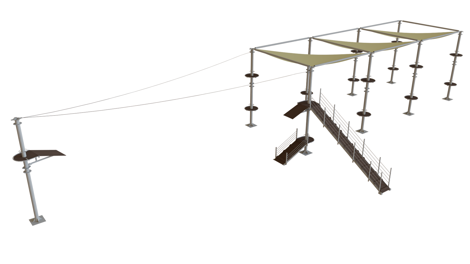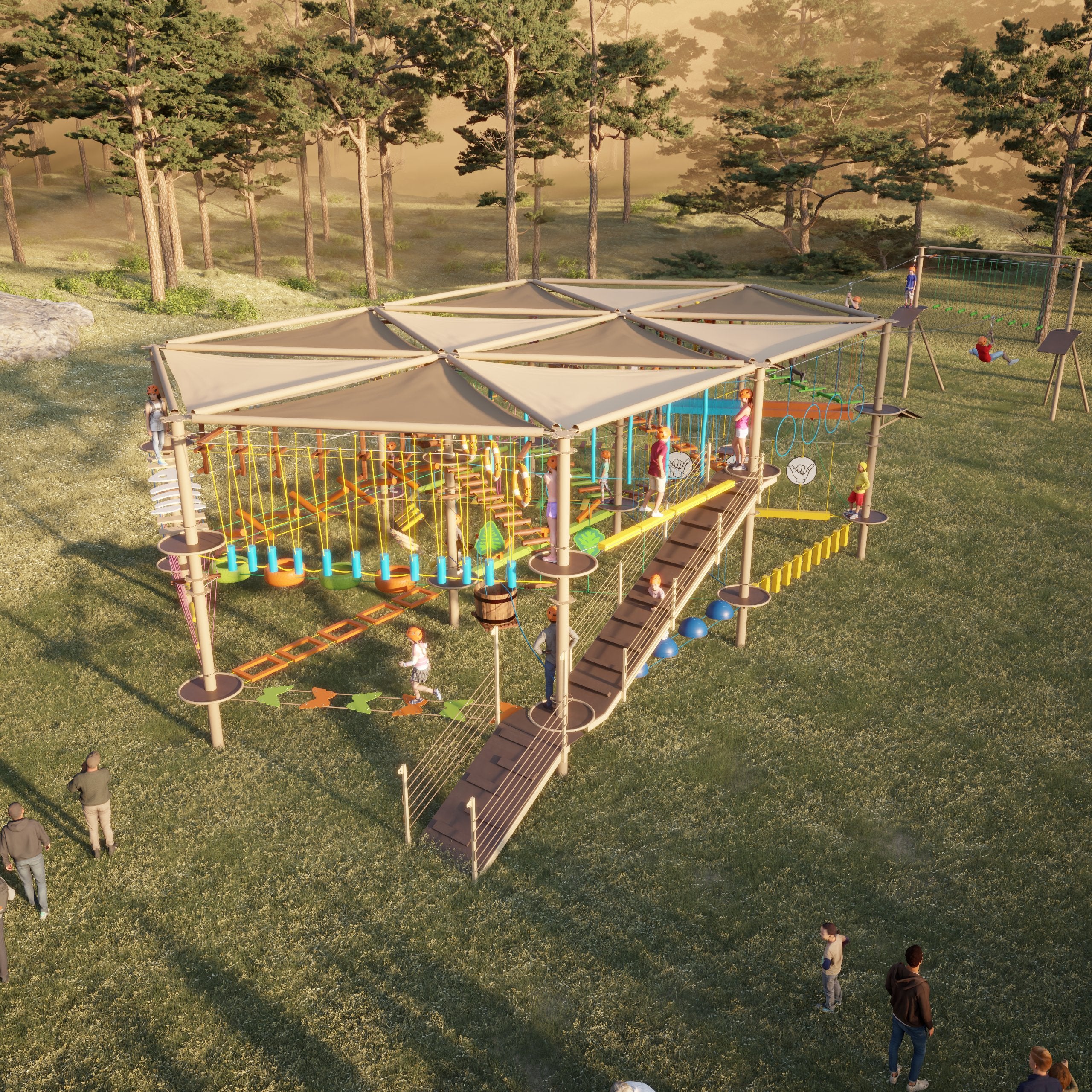 Parque de aventura formado por 8 postes ,2 niveles de juego más dos tirolinas y 16 juegos entre pasarelas, puentes, elementos colgantes y muchos más.