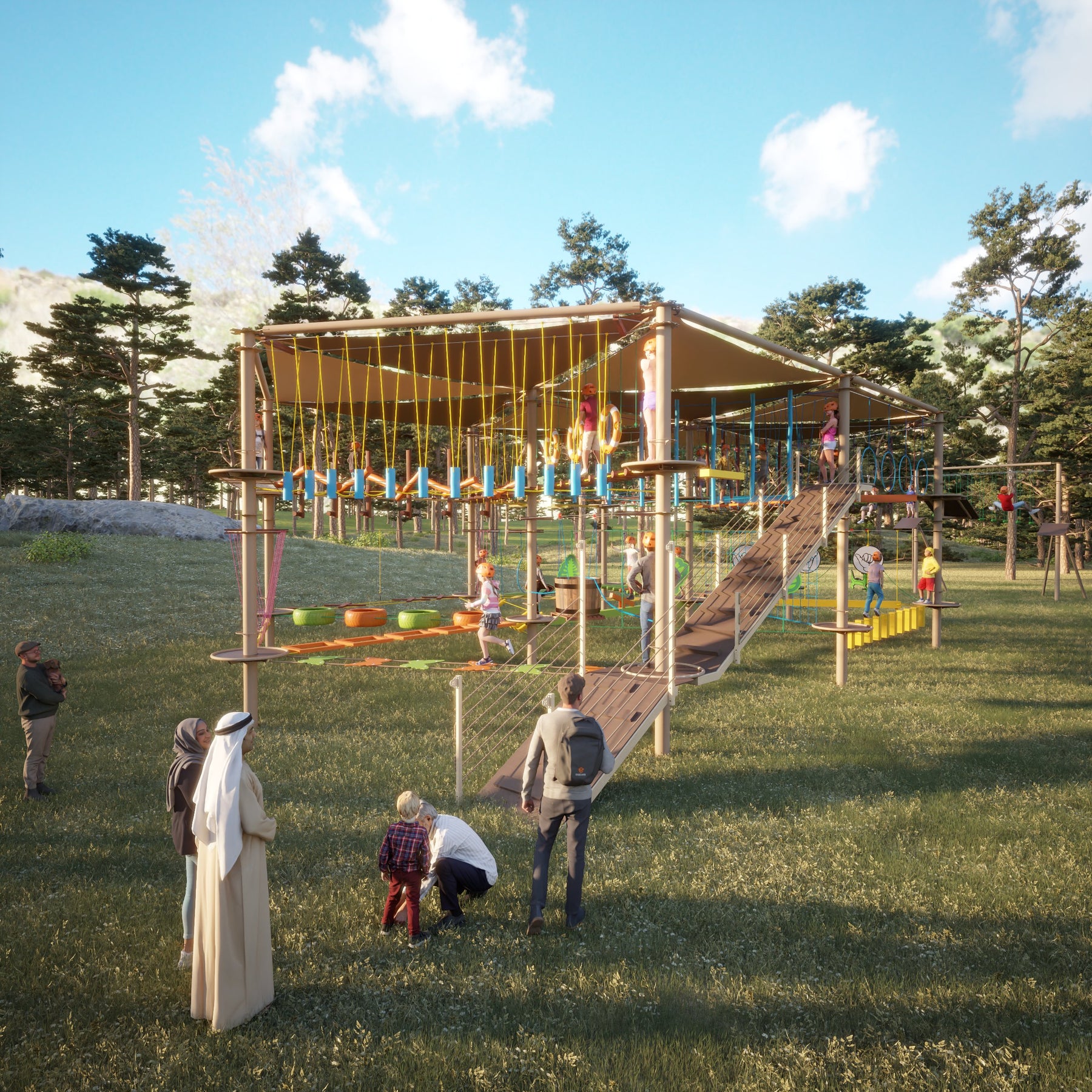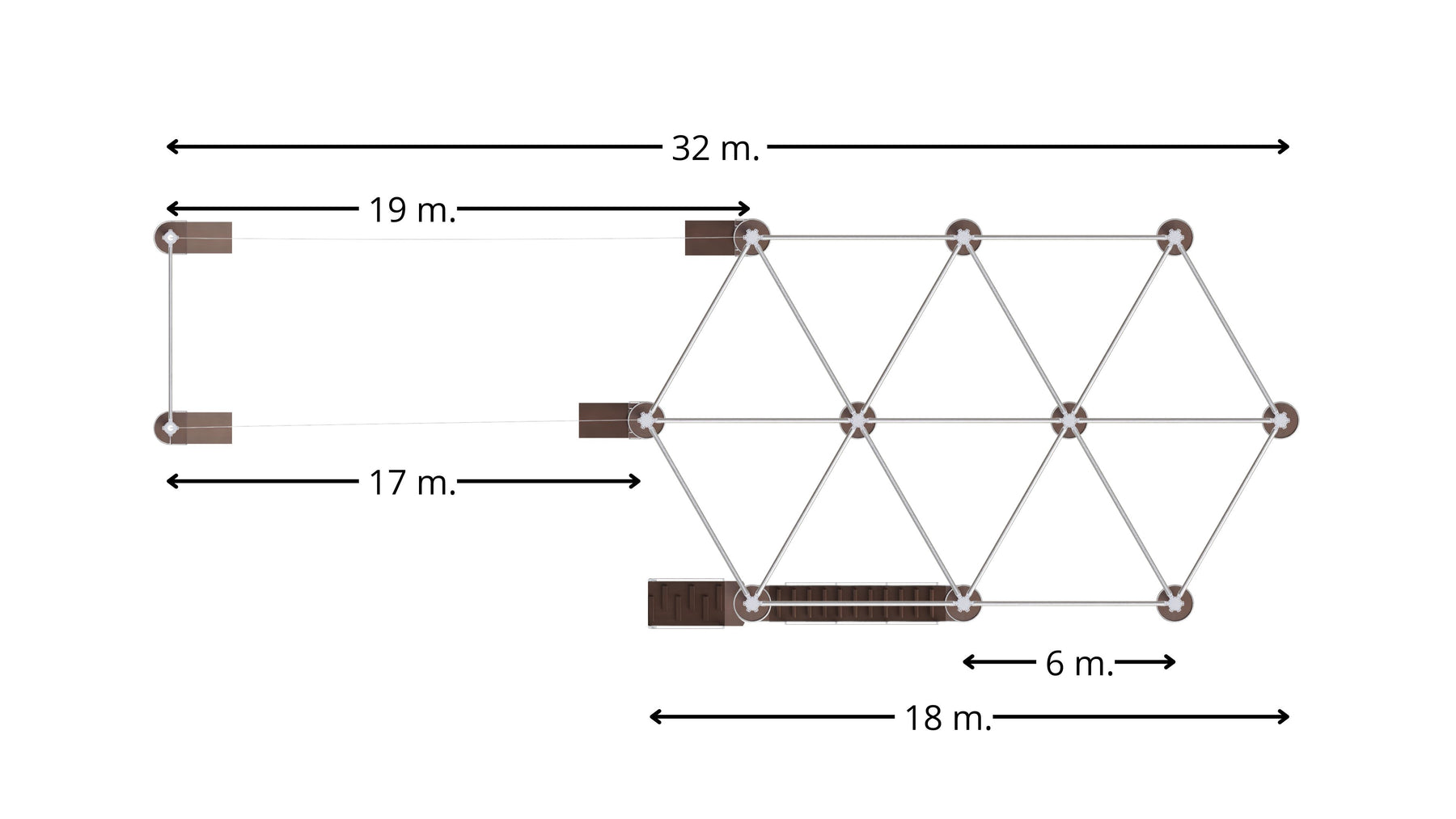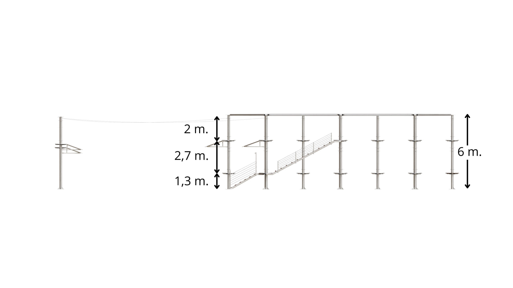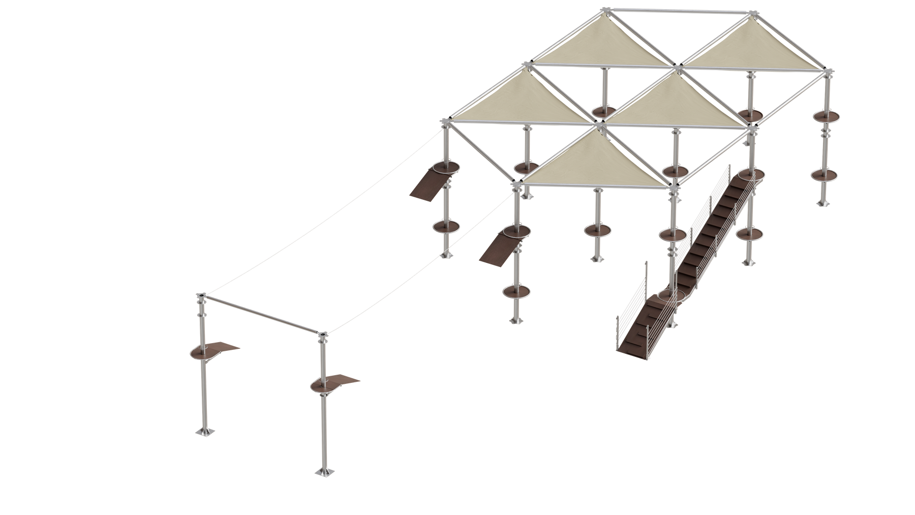 Parque de aventura formado por 12 postes , dos niveles de juegos ,más dos tirolinas y 24 juegos entre pasarelas, puentes, elementos colgantes y muchos más.