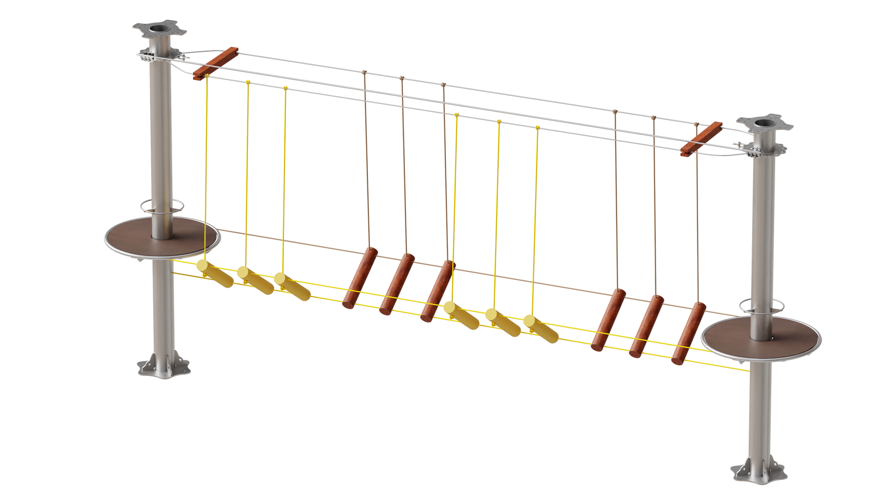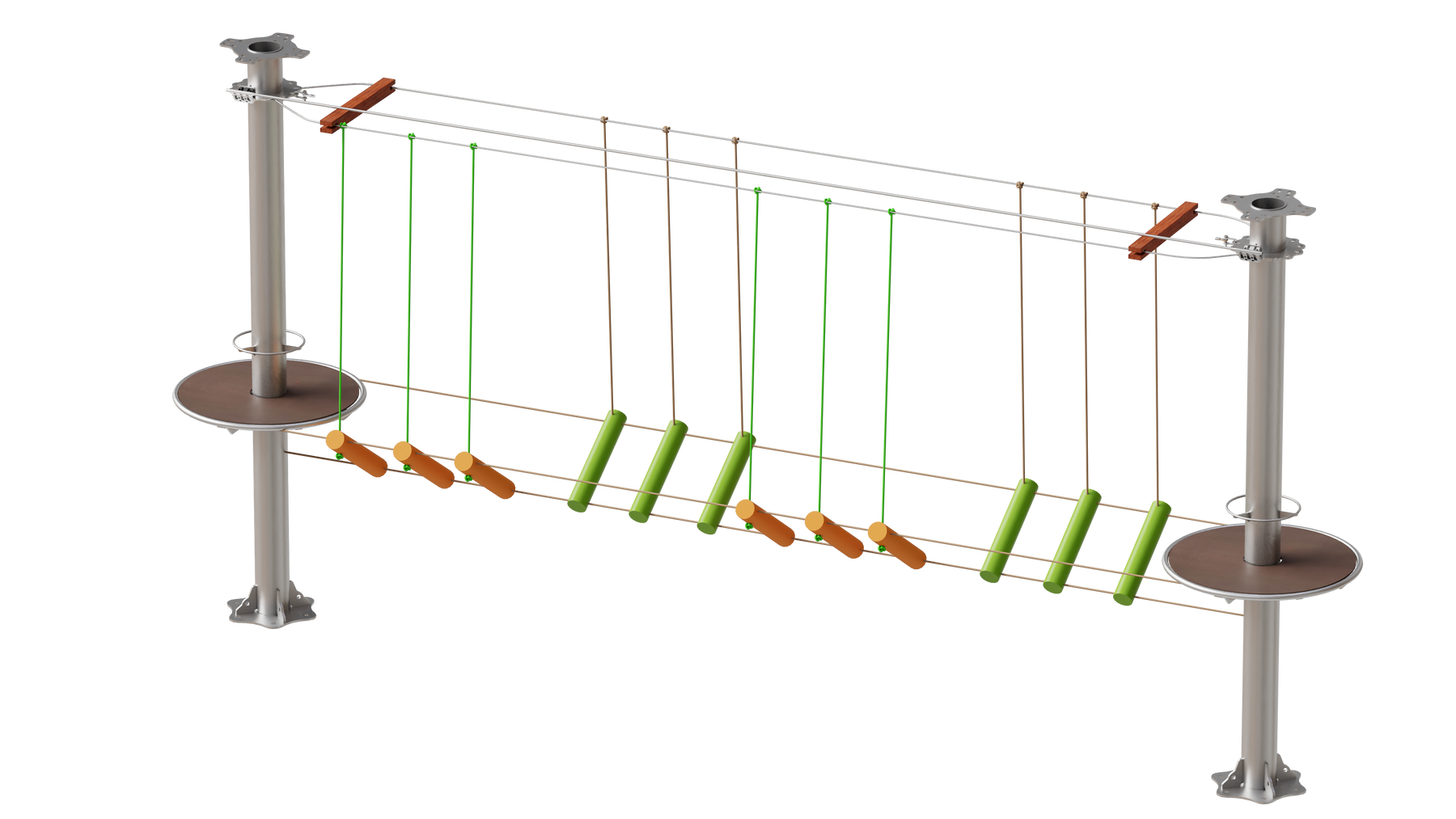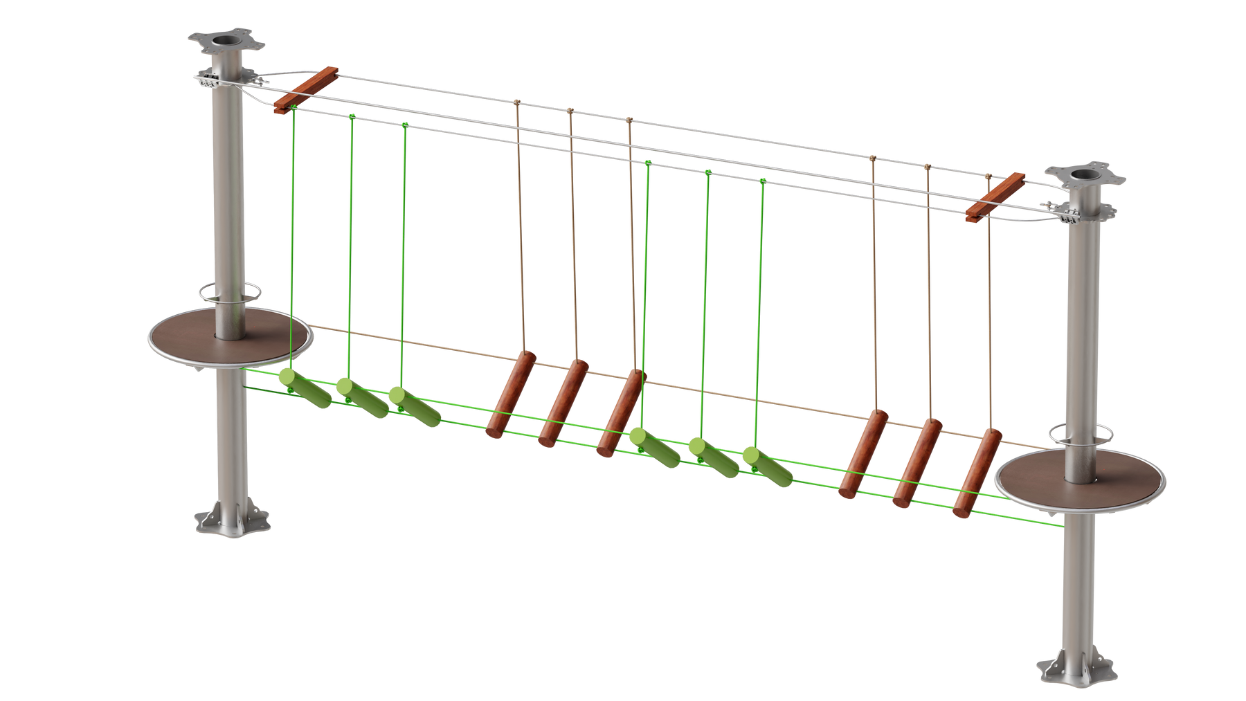 Juego diseñado para parques de aventura, compatible con estructuras de postes de acero o montajes en árboles. Disponible en longitudes estándar de 6 y 7 metros. Para dimensiones personalizadas, consulte con IMN. Anclajes incluidos. Estructura no incluida.