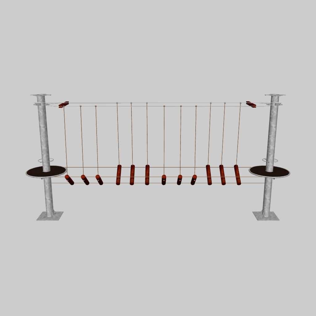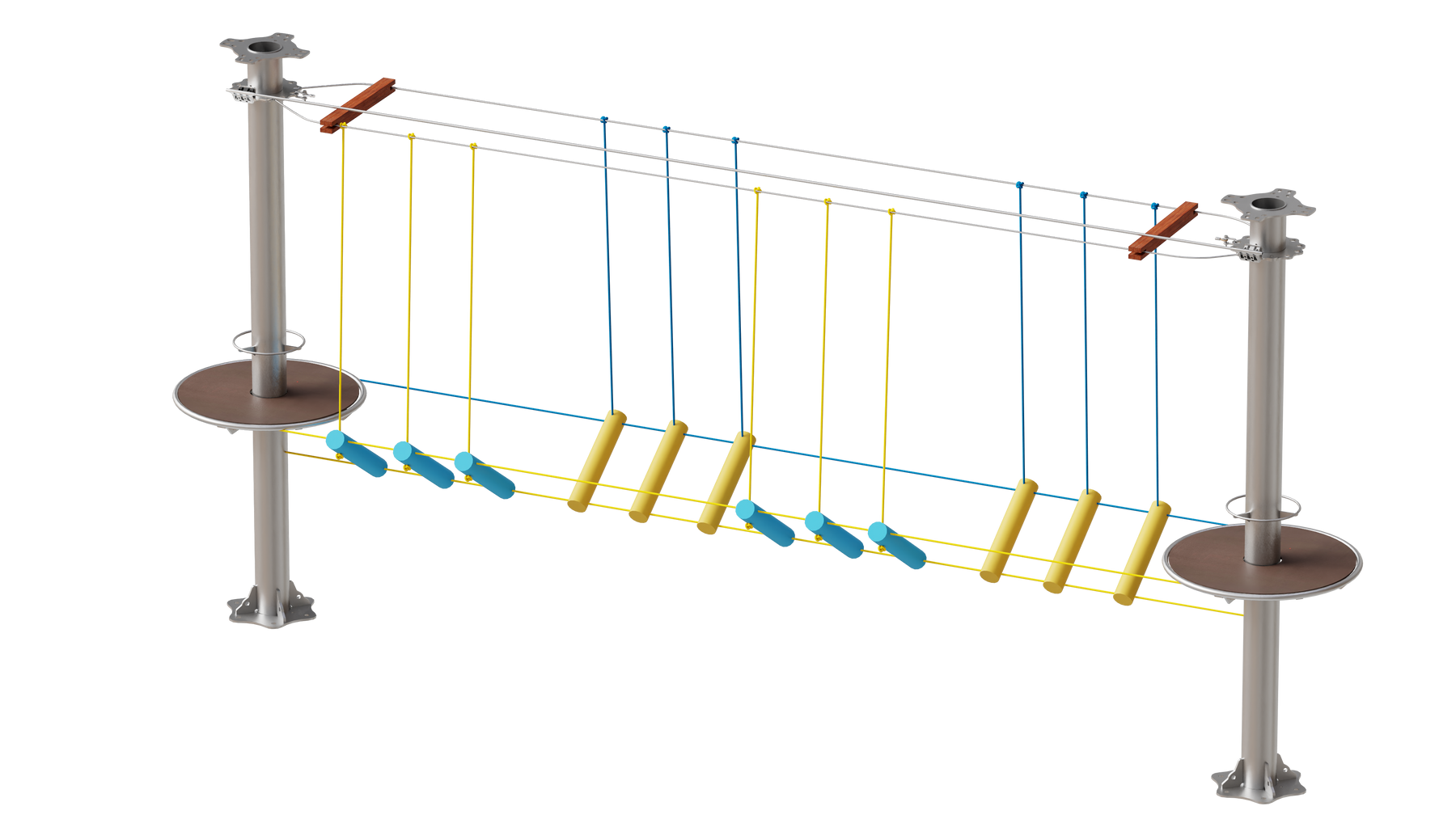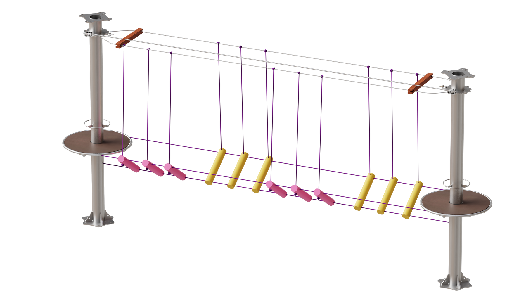 Juego diseñado para parques de aventura, compatible con estructuras de postes de acero o montajes en árboles. Disponible en longitudes estándar de 6 y 7 metros. Para dimensiones personalizadas, consulte con IMN. Anclajes incluidos. Estructura no incluida.