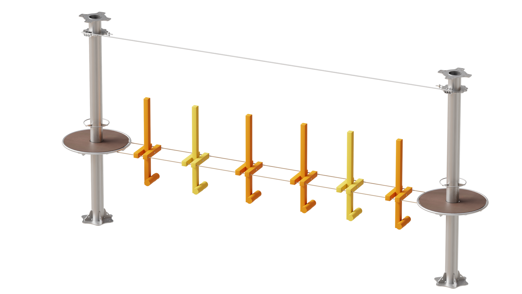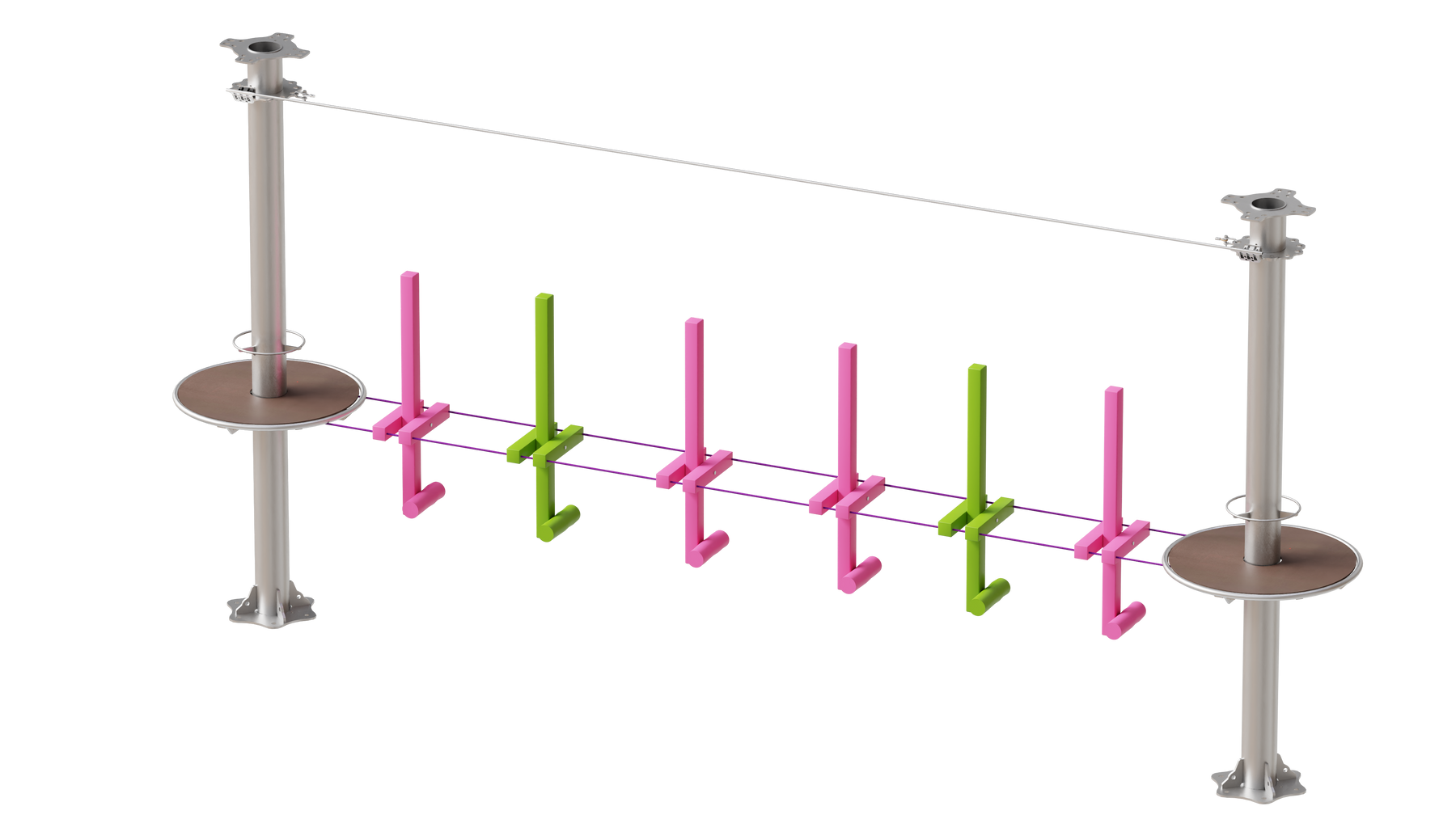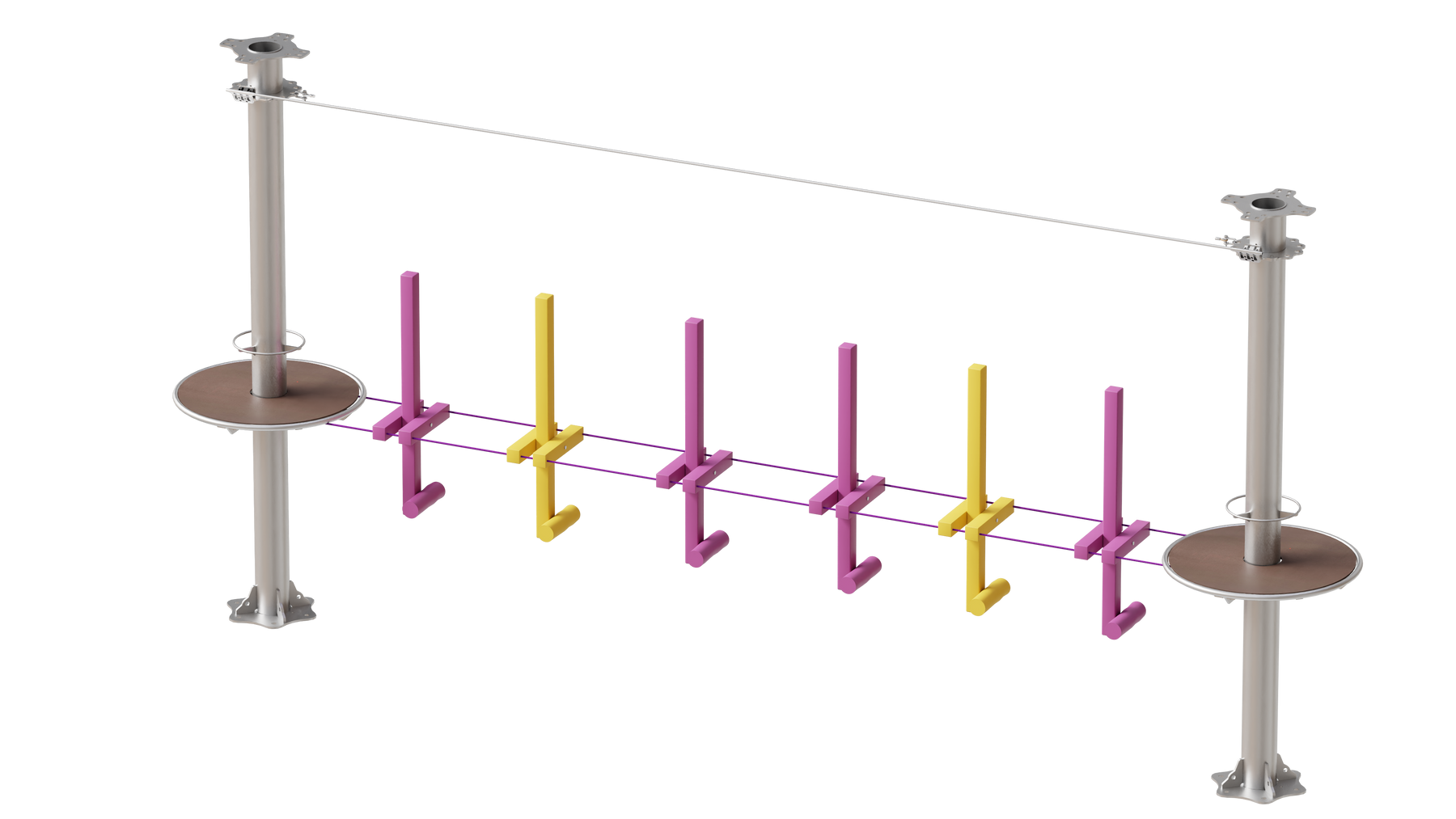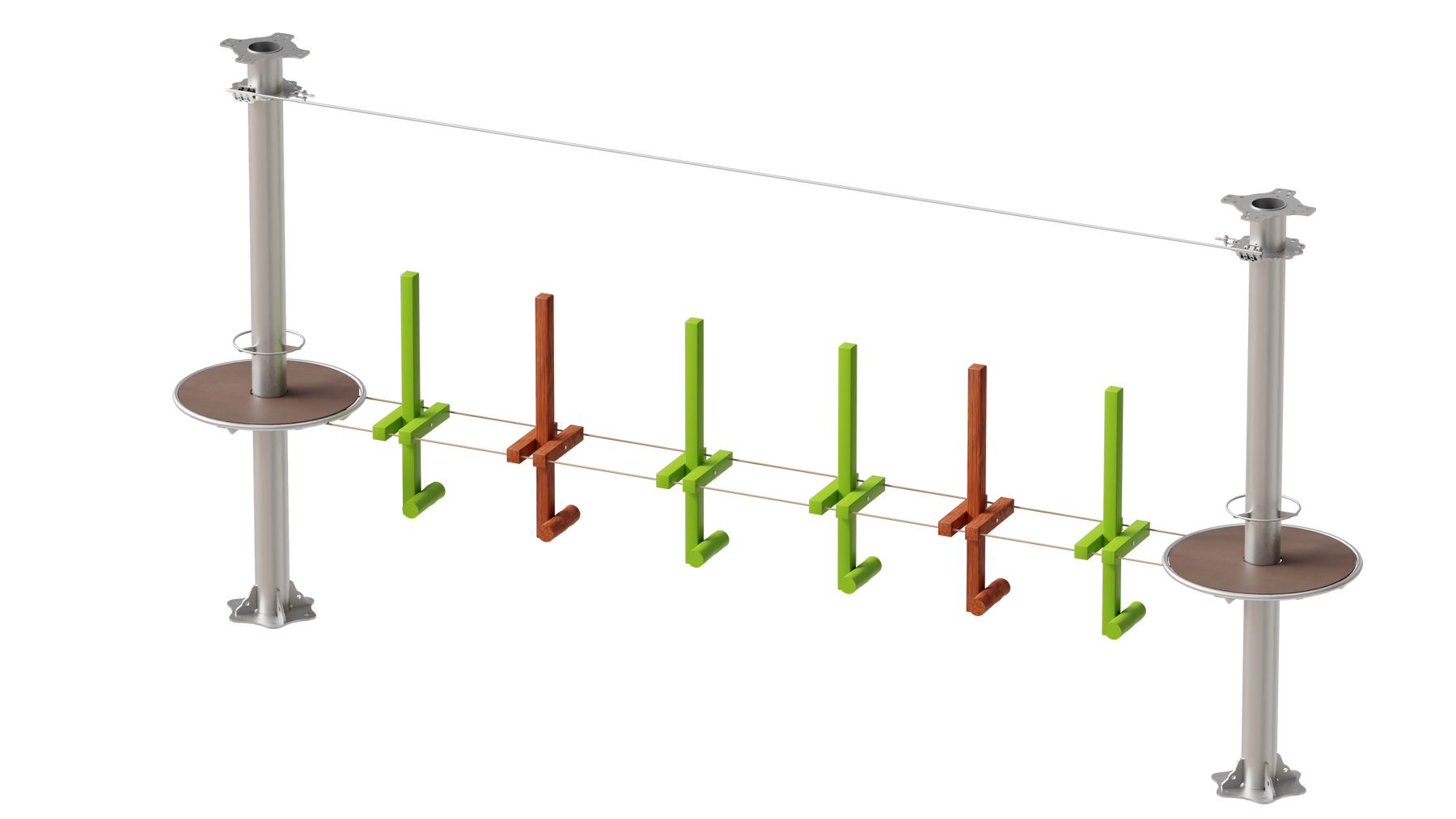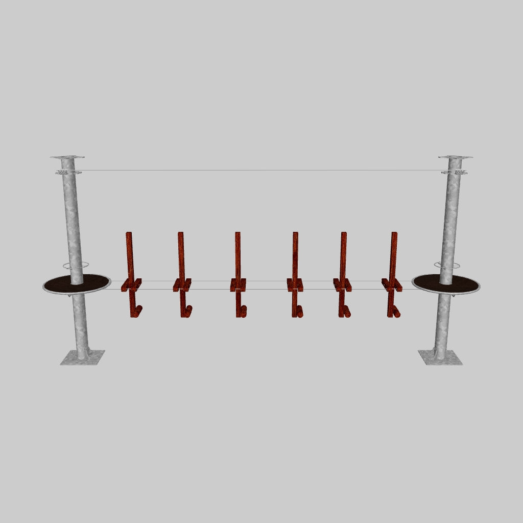 Juego diseñado para parques de aventura, compatible con estructuras de postes de acero o montajes en árboles. Disponible en longitudes estándar de 6 y 7 metros. Para dimensiones personalizadas, consulte con IMN. Anclajes incluidos. Estructura no incluida.