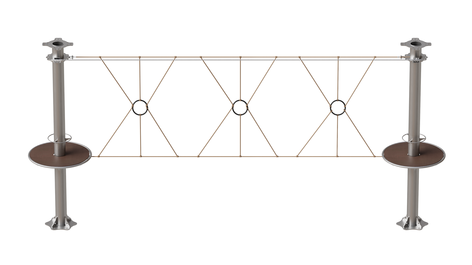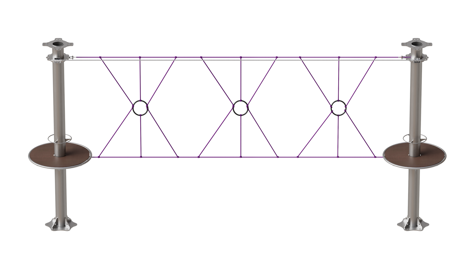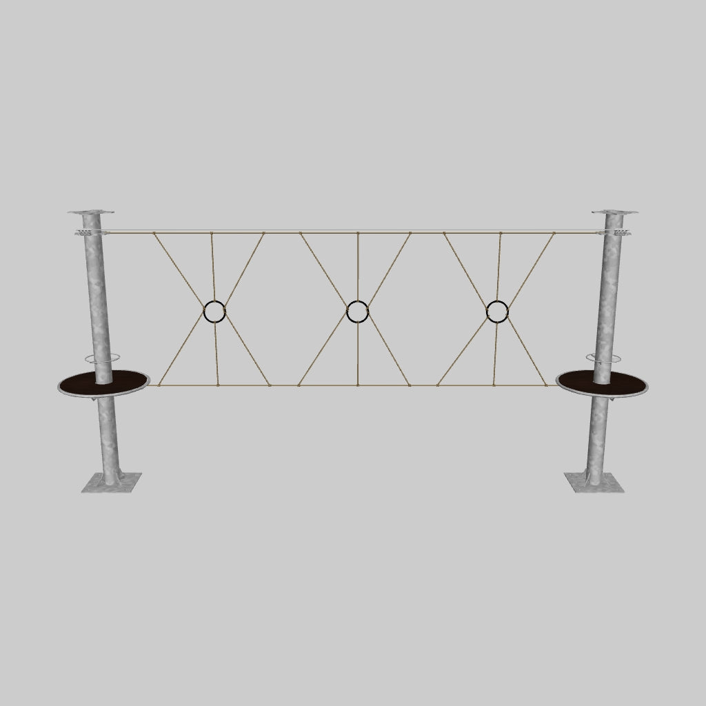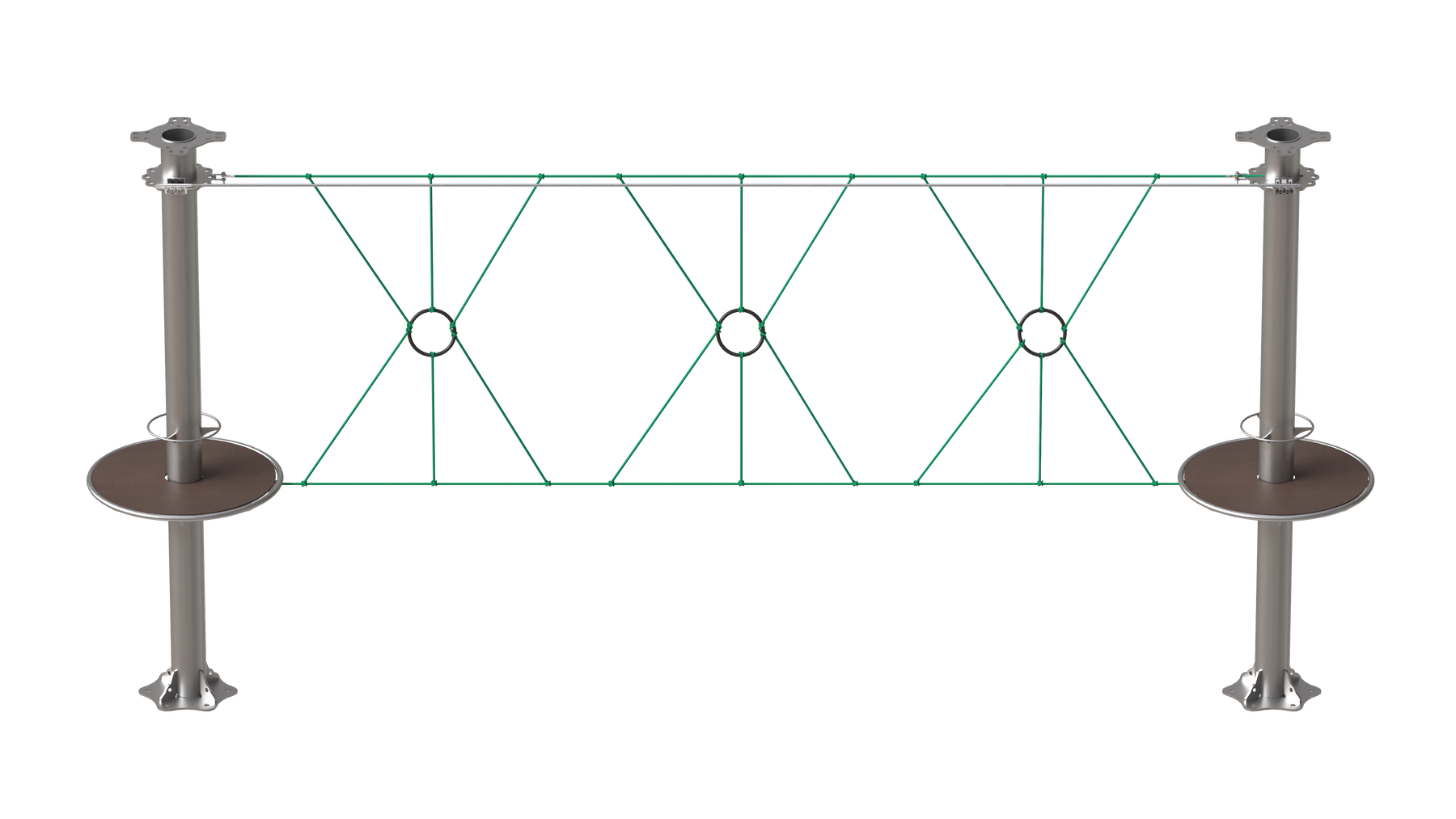 Juego diseñado para parques de aventura, compatible con estructuras de postes de acero o montajes en árboles. Disponible en longitudes estándar de 6 y 7 metros. Para dimensiones personalizadas, consulte con IMN. Anclajes incluidos. Estructura no incluida.