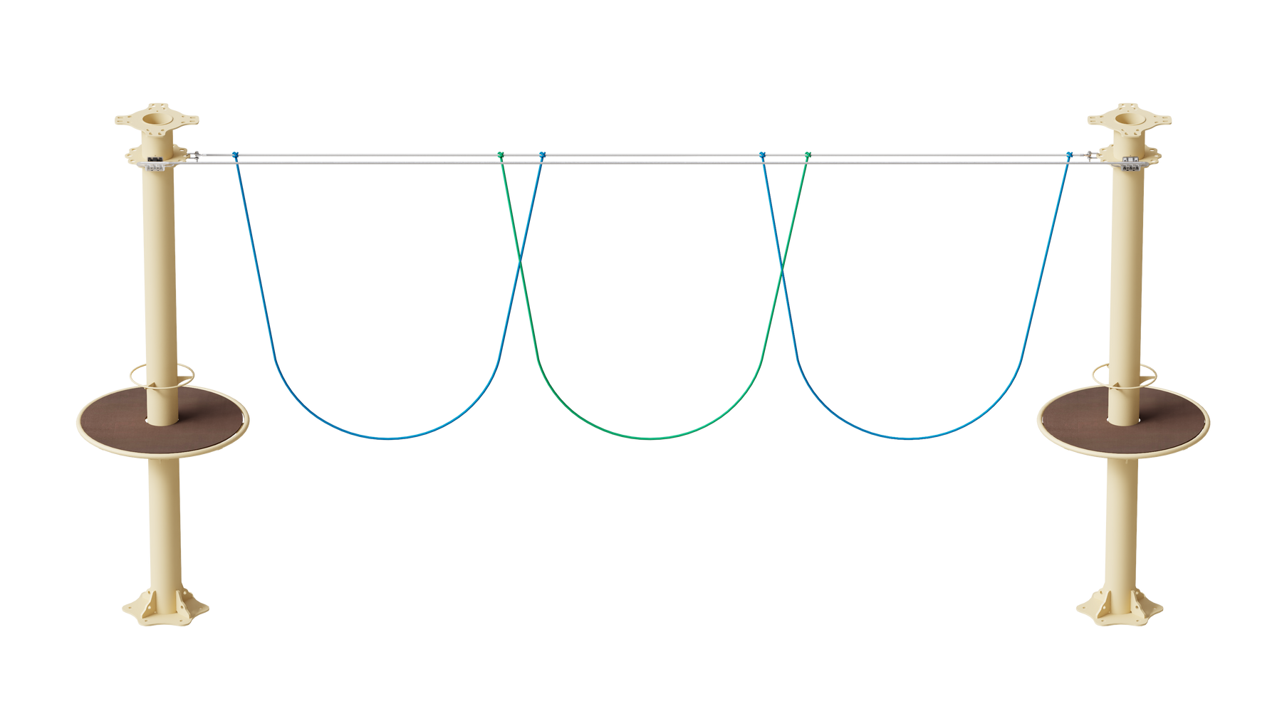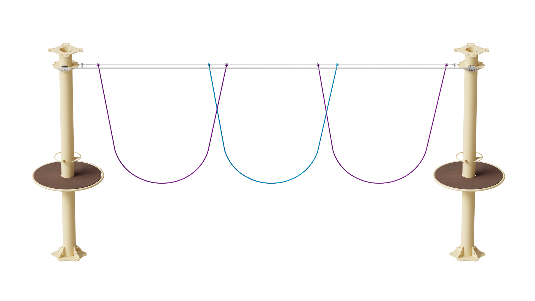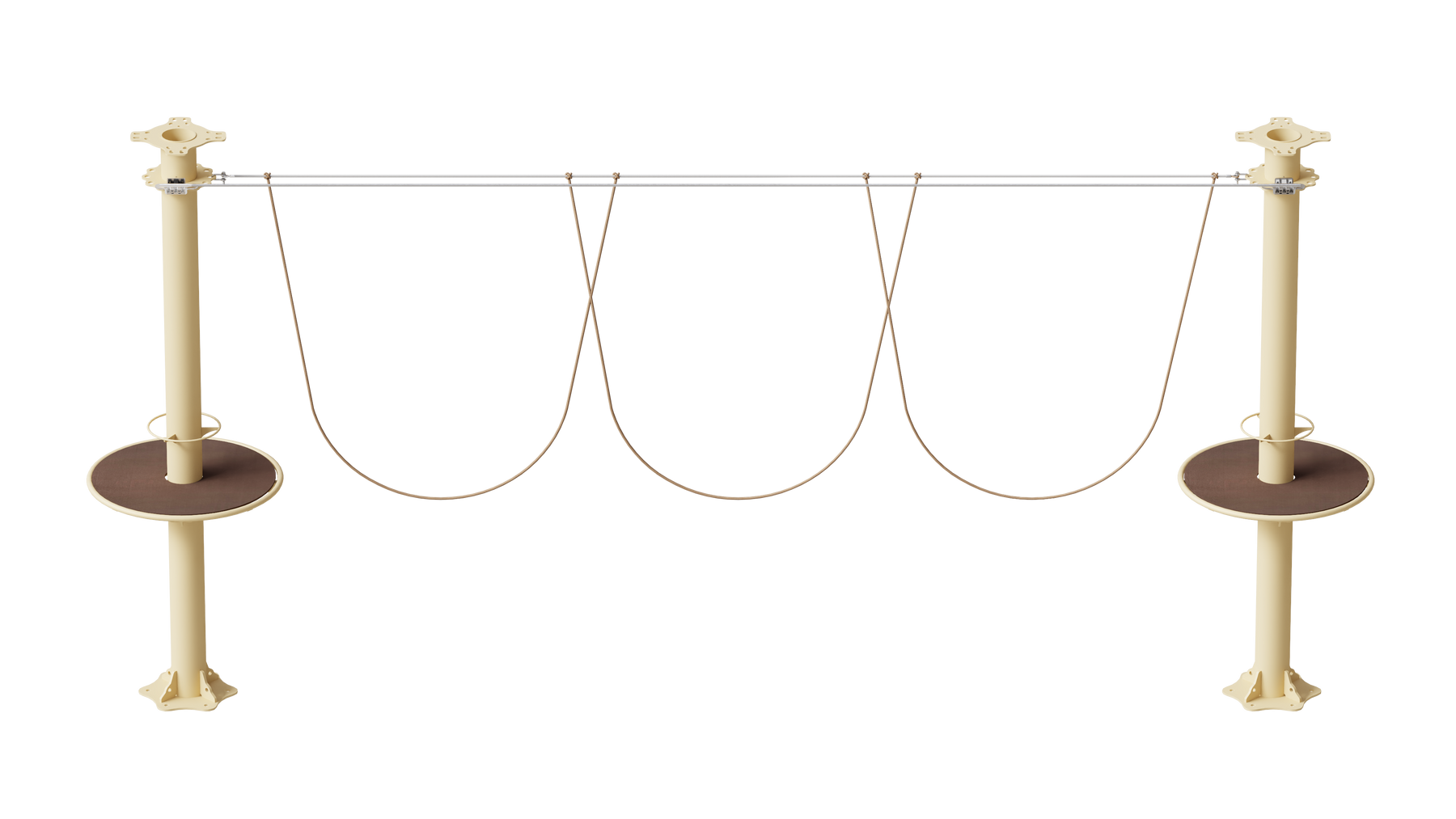 Juego diseñado para parques de aventura, compatible con estructuras de postes de acero o montajes en árboles. Disponible en longitudes estándar de 6 y 7 metros. Para dimensiones personalizadas, consulte con IMN. Anclajes incluidos. Estructura no incluida.