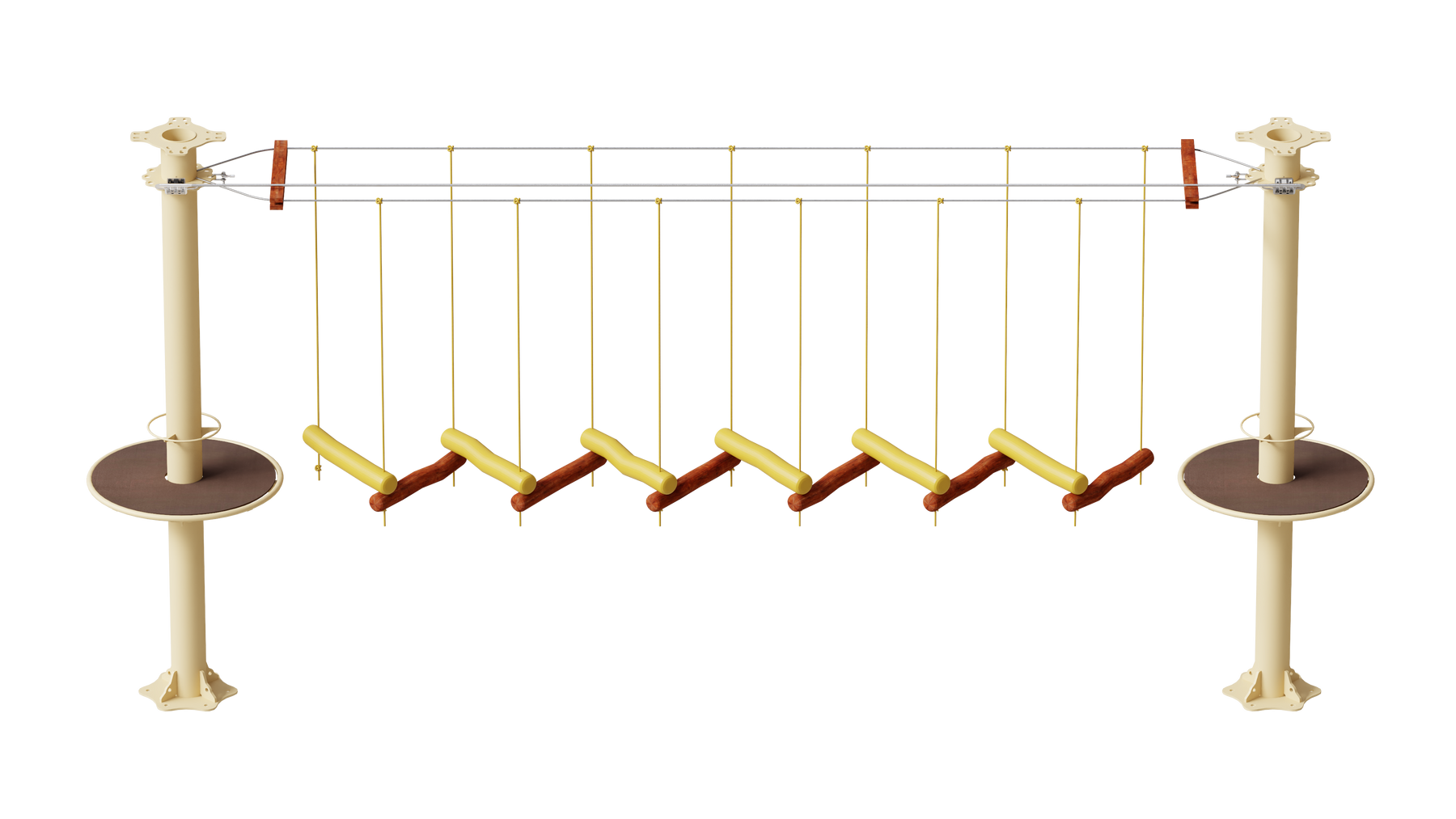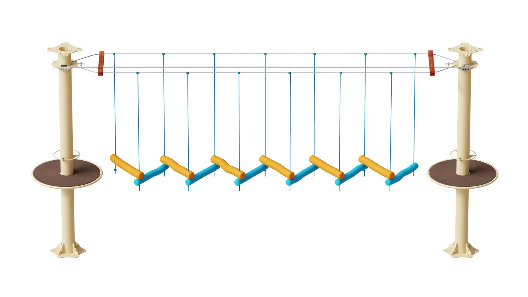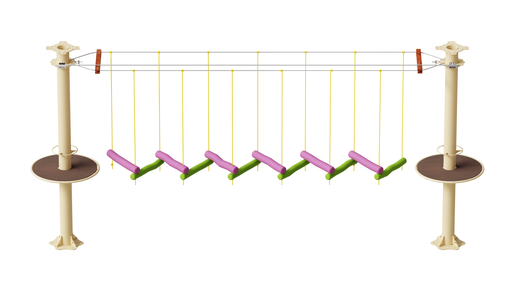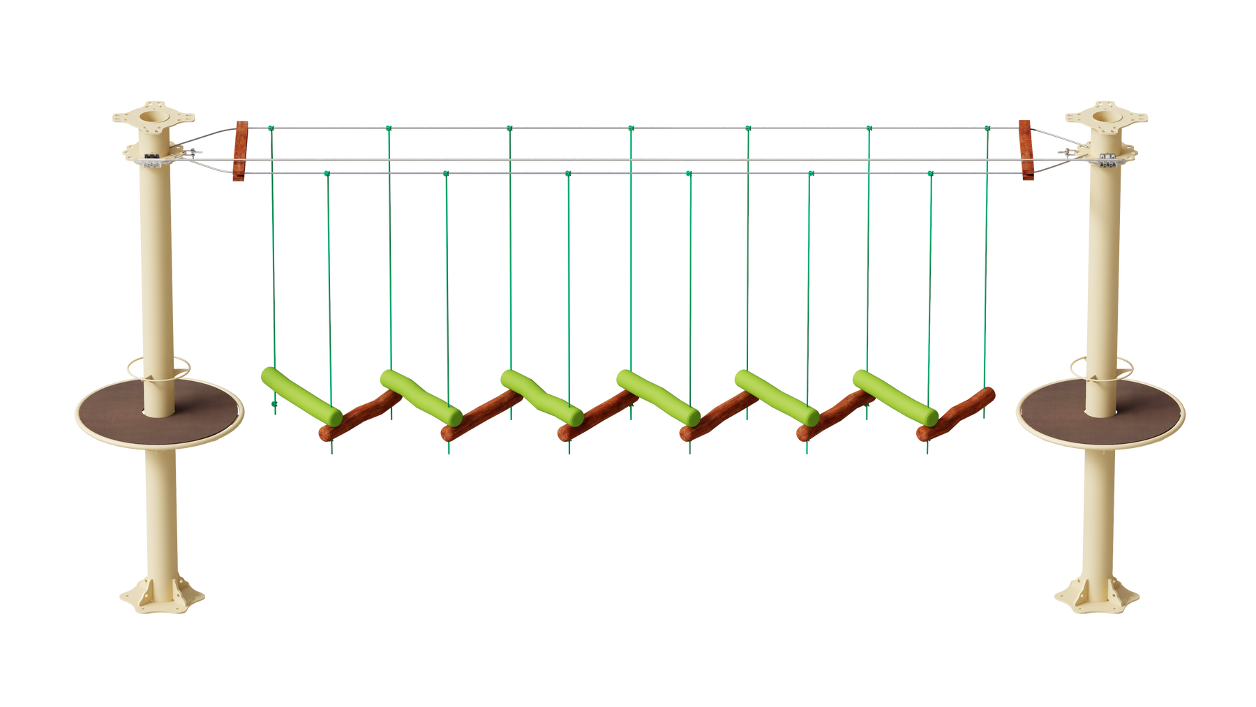Juego diseñado para parques de aventura, compatible con estructuras de postes de acero o montajes en árboles. Disponible en longitudes estándar de 6 y 7 metros. Para dimensiones personalizadas, consulte con IMN. Anclajes incluidos. Estructura no incluida.
