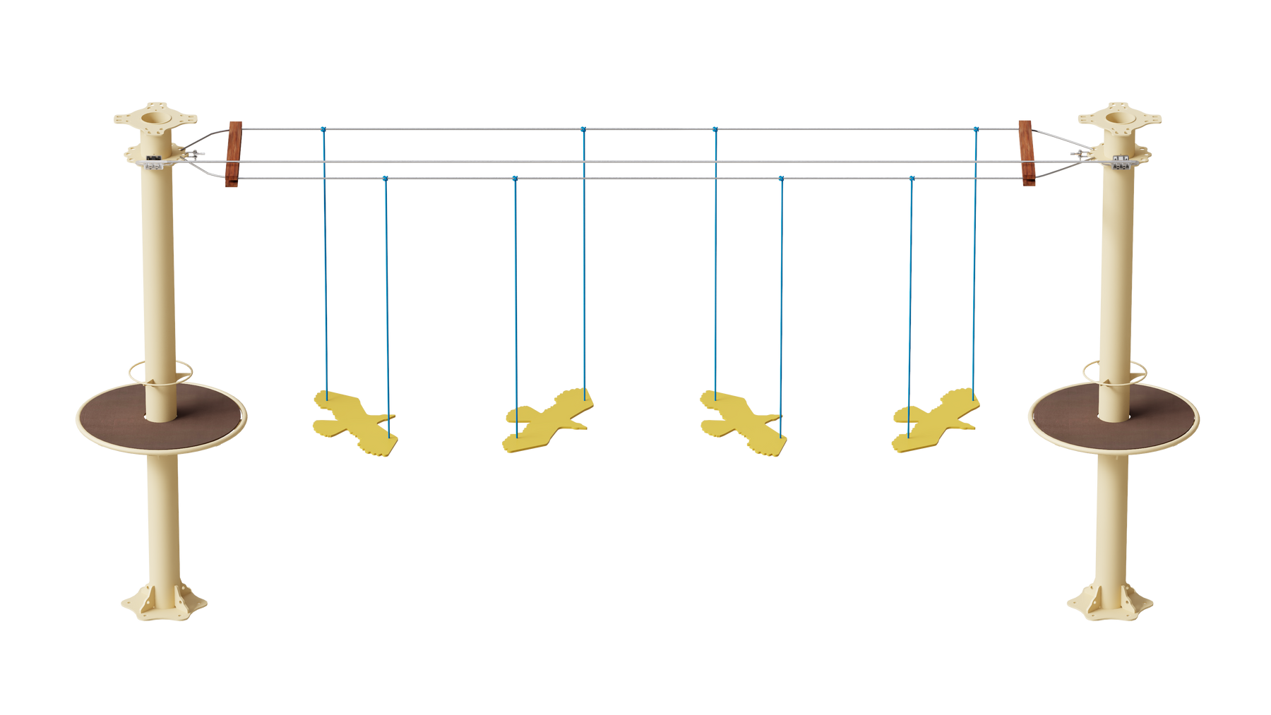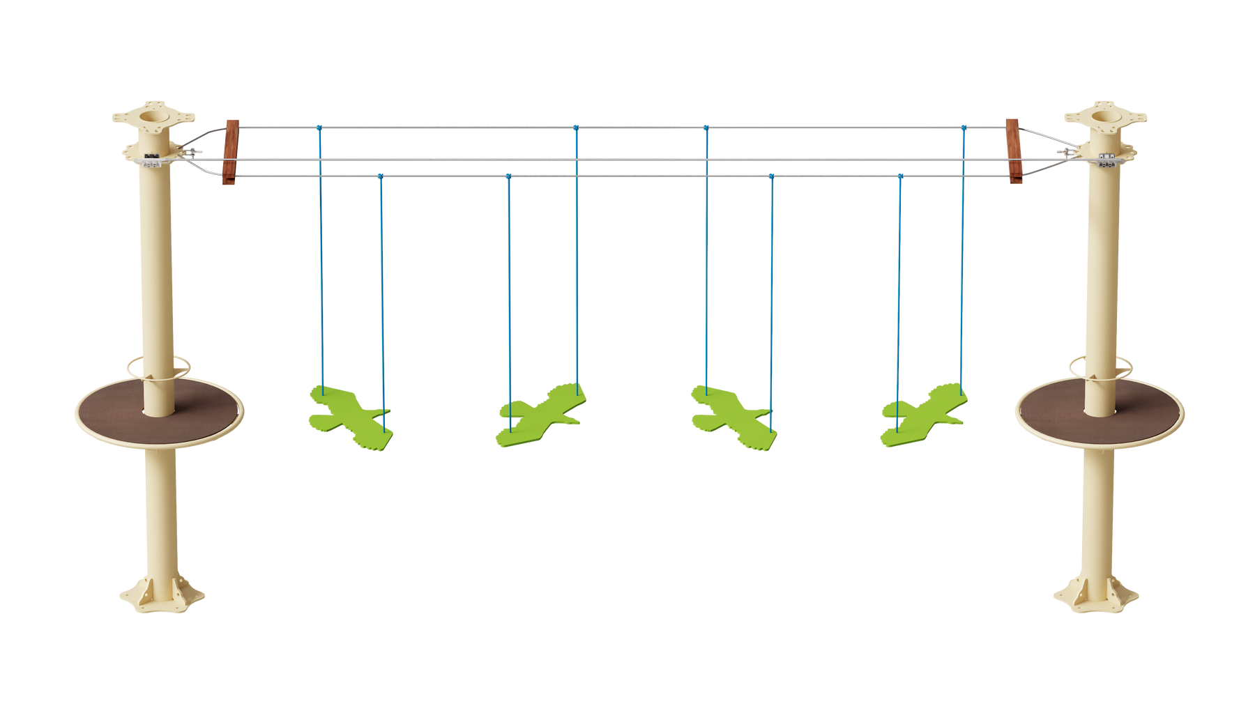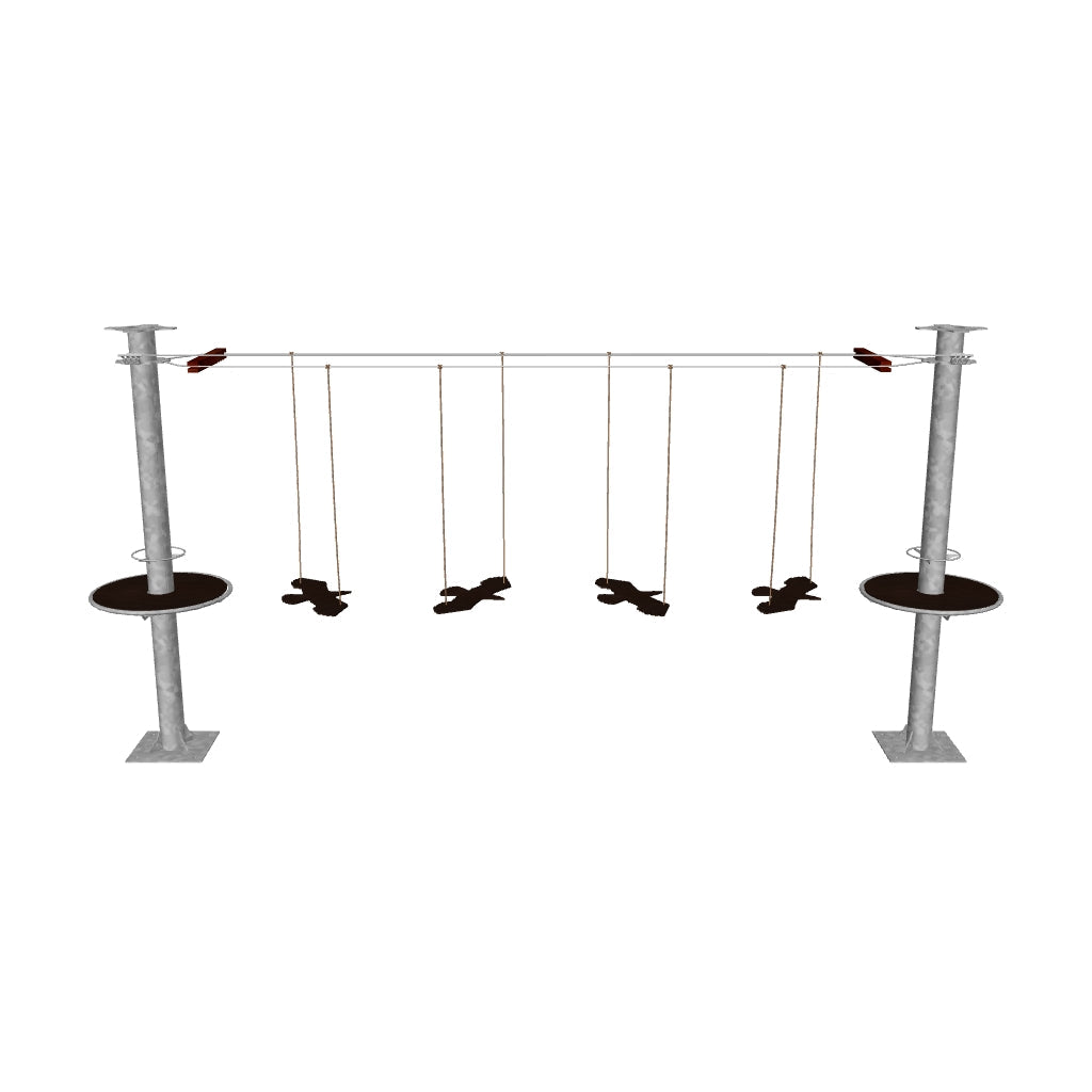 Juego diseñado para parques de aventura, compatible con estructuras de postes de acero o montajes en árboles. Disponible en longitudes estándar de 6 y 7 metros. Para dimensiones personalizadas, consulte con IMN. Anclajes incluidos. Estructura no incluida.