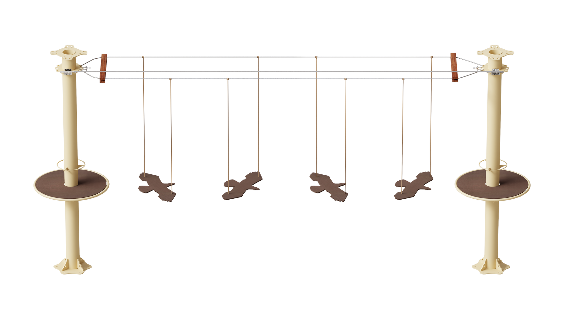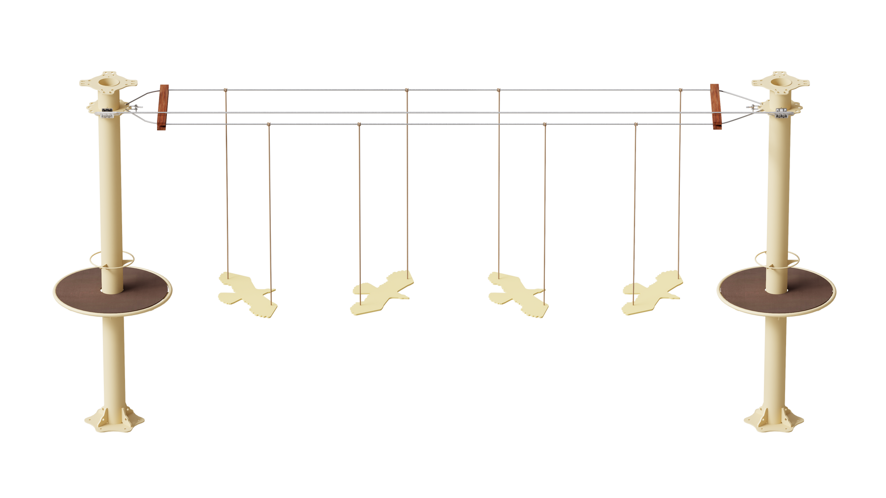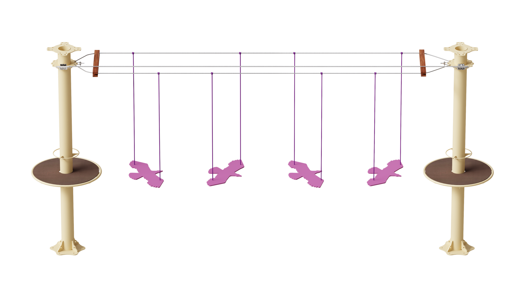 Juego diseñado para parques de aventura, compatible con estructuras de postes de acero o montajes en árboles. Disponible en longitudes estándar de 6 y 7 metros. Para dimensiones personalizadas, consulte con IMN. Anclajes incluidos. Estructura no incluida.