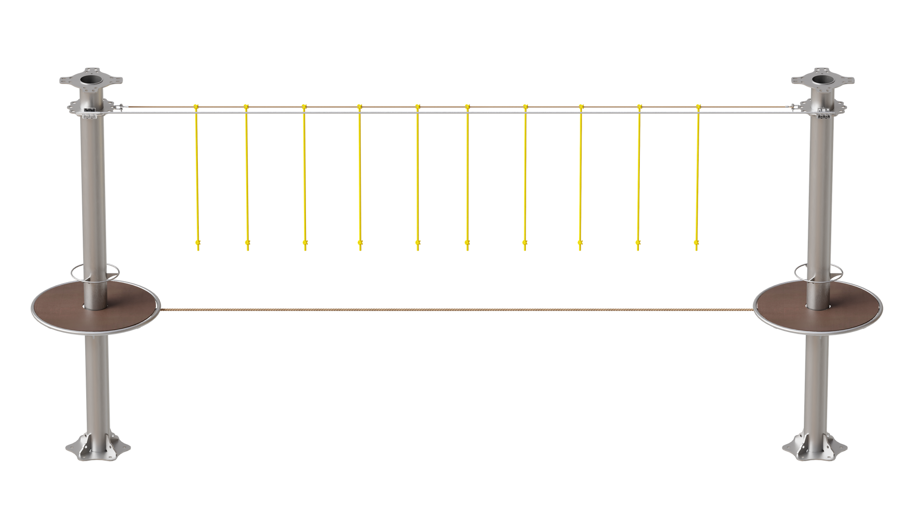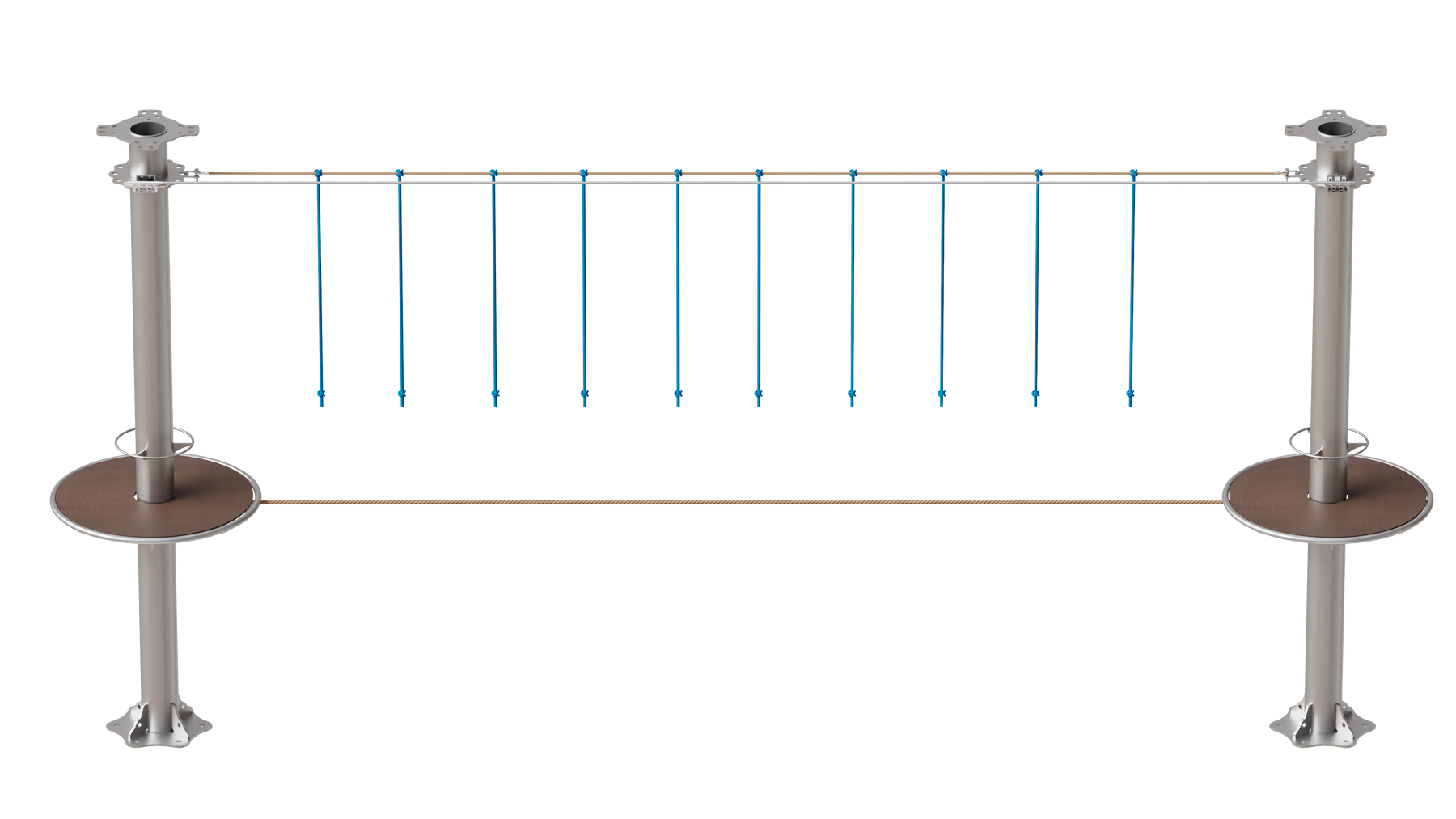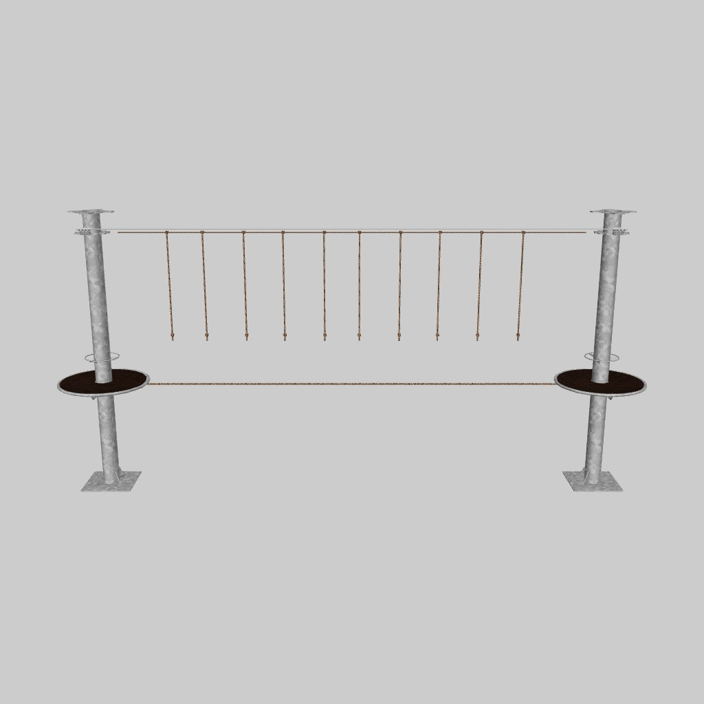 Juego diseñado para parques de aventura, compatible con estructuras de postes de acero o montajes en árboles. Disponible en longitudes estándar de 6 y 7 metros. Para dimensiones personalizadas, consulte con IMN. Anclajes incluidos. Estructura no incluida.