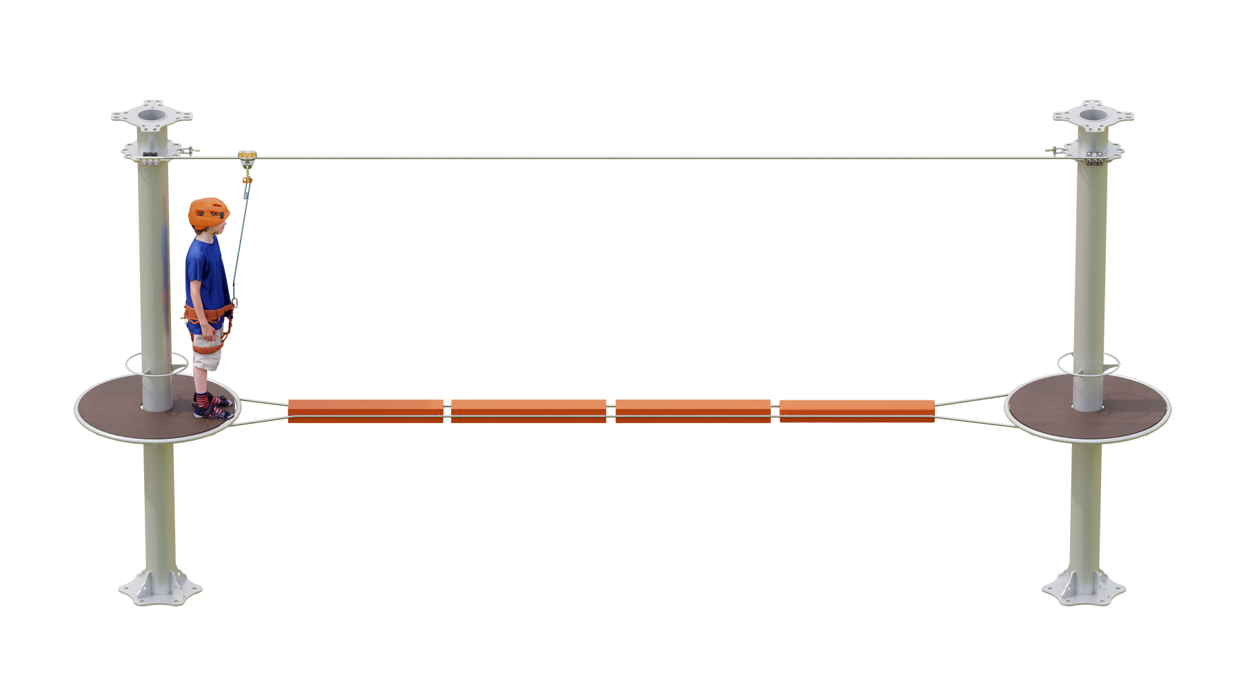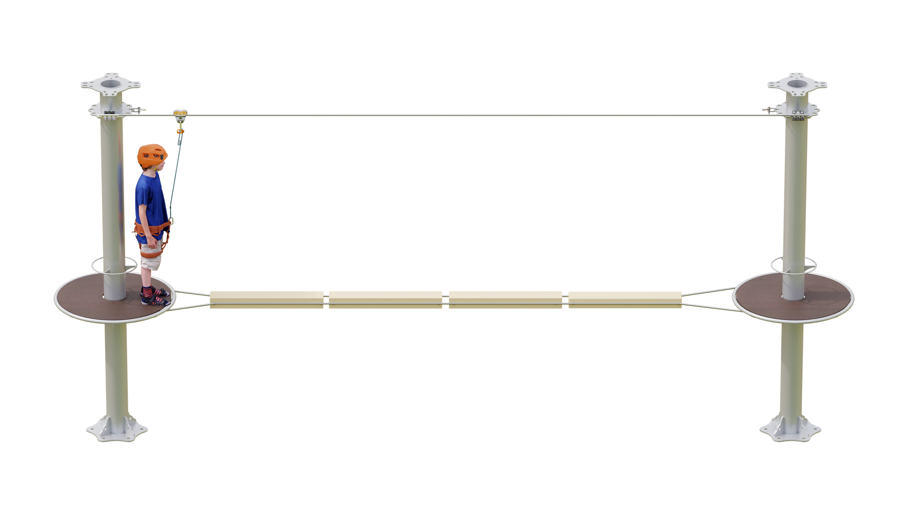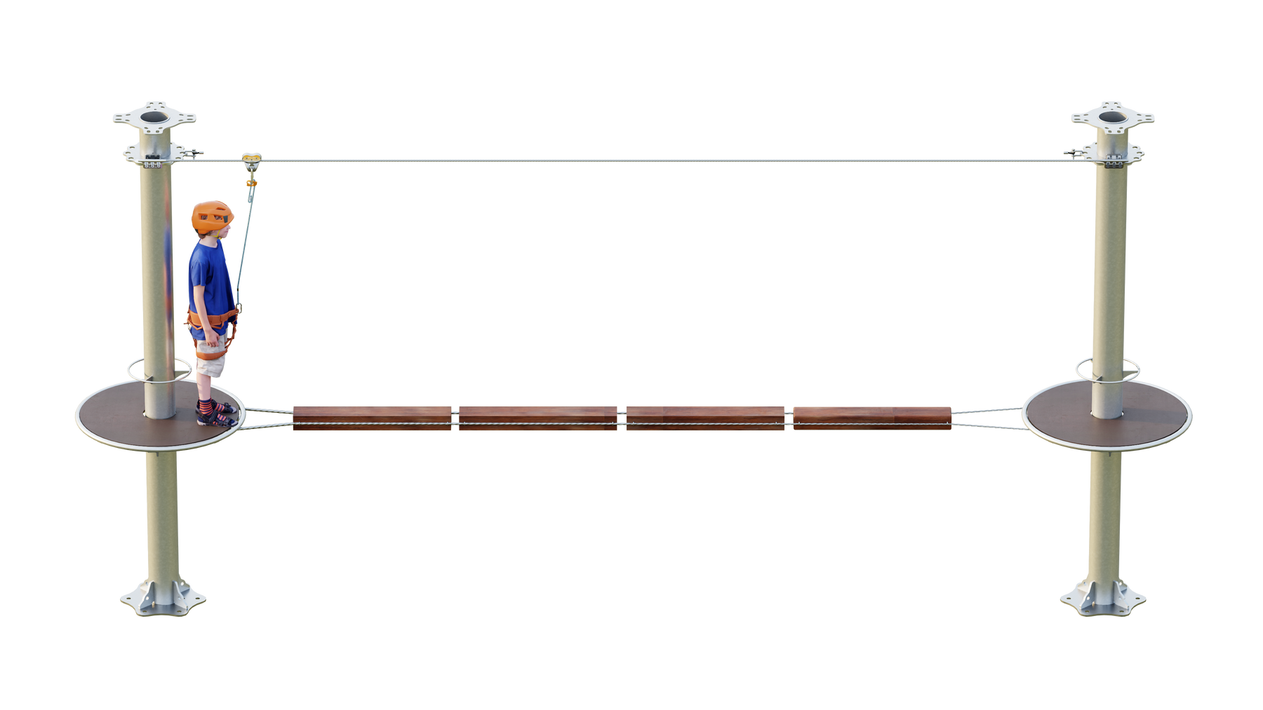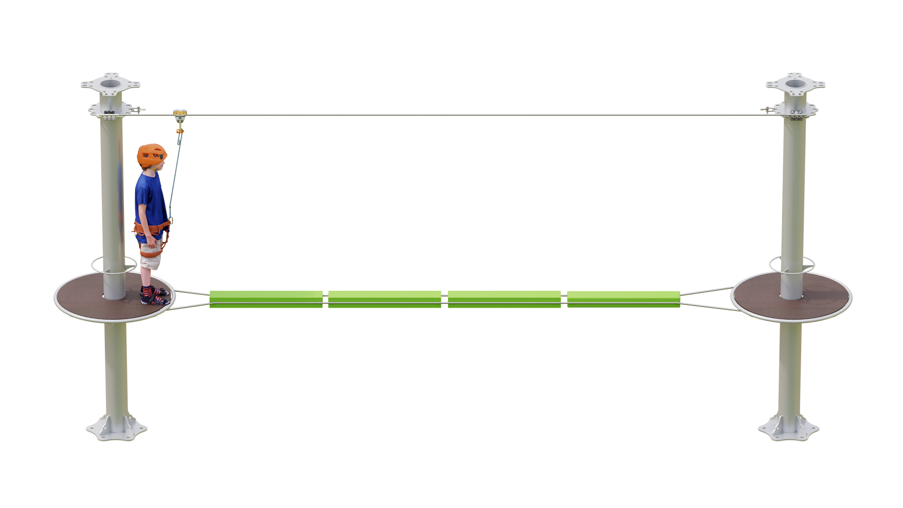 Juego diseñado para parques de aventura, compatible con estructuras de postes de acero o montajes en árboles. Disponible en longitudes estándar de 6 y 7 metros. Para dimensiones personalizadas, consulte con IMN. Anclajes incluidos. Estructura no incluida.