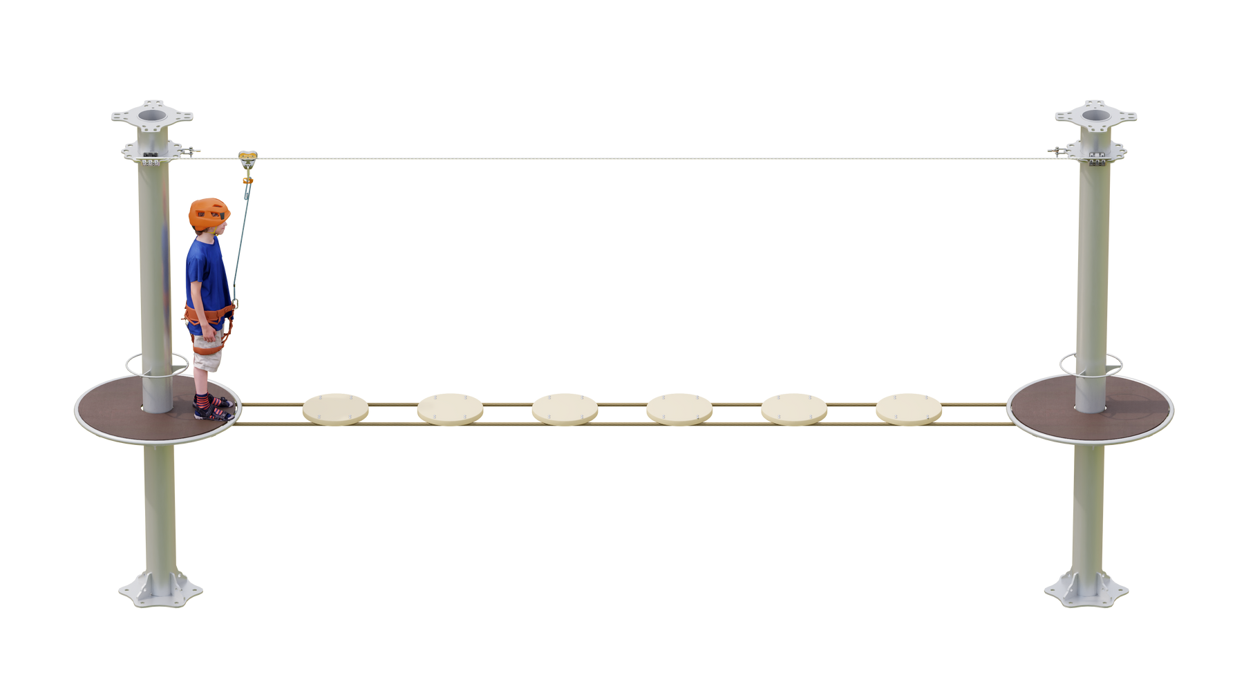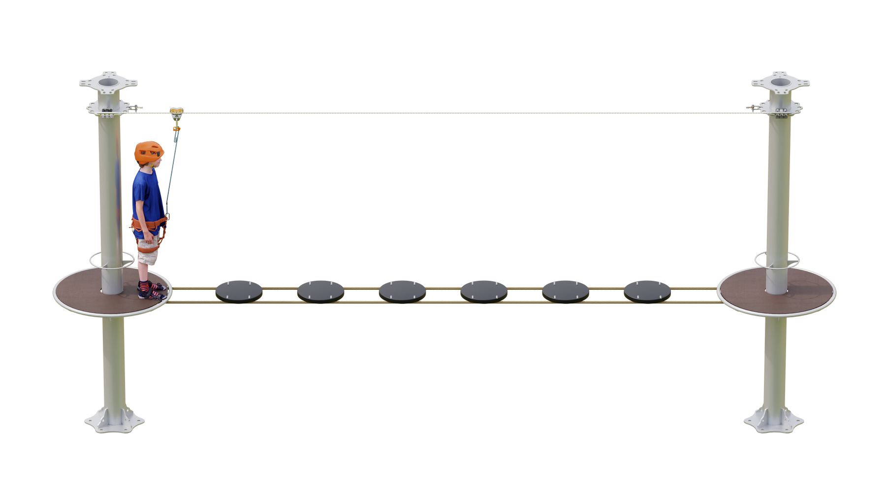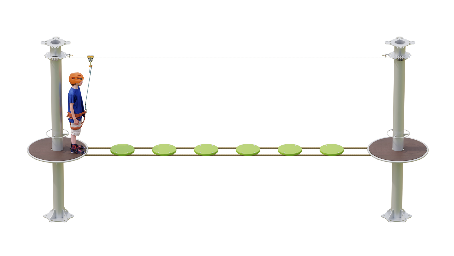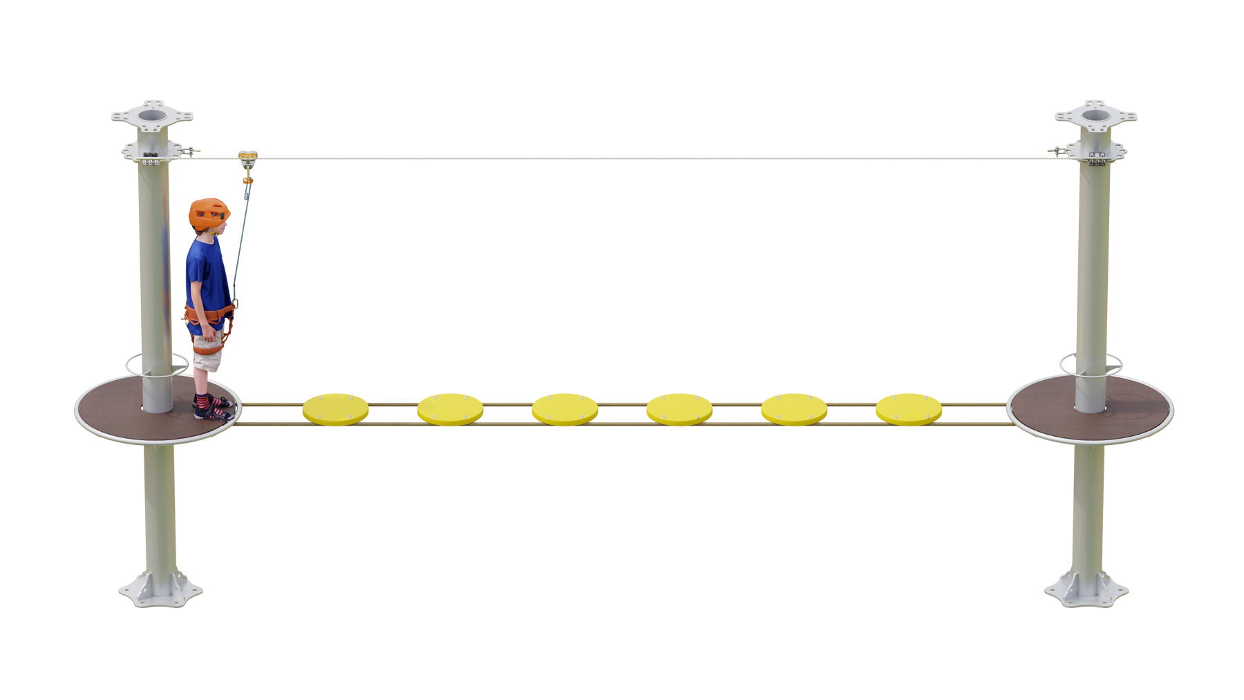 Juego diseñado para parques de aventura, compatible con estructuras de postes de acero o montajes en árboles. Disponible en longitudes estándar de 6 y 7 metros. Para dimensiones personalizadas, consulte con IMN. Anclajes incluidos. Estructura no incluida.
