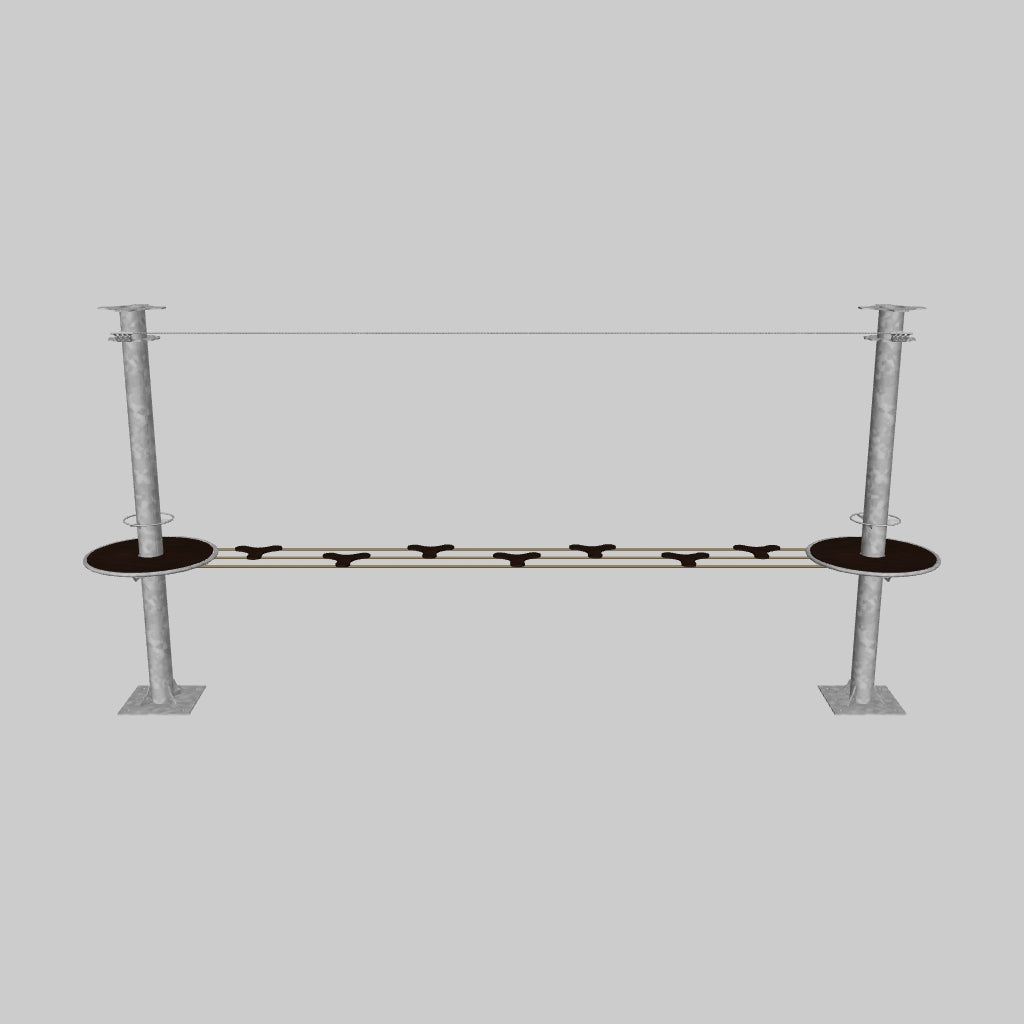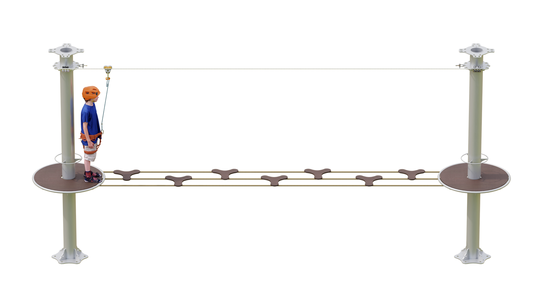 Juego diseñado para parques de aventura, compatible con estructuras de postes de acero o montajes en árboles. Disponible en longitudes estándar de 6 y 7 metros. Para dimensiones personalizadas, consulte con IMN. Anclajes incluidos. Estructura no incluida.