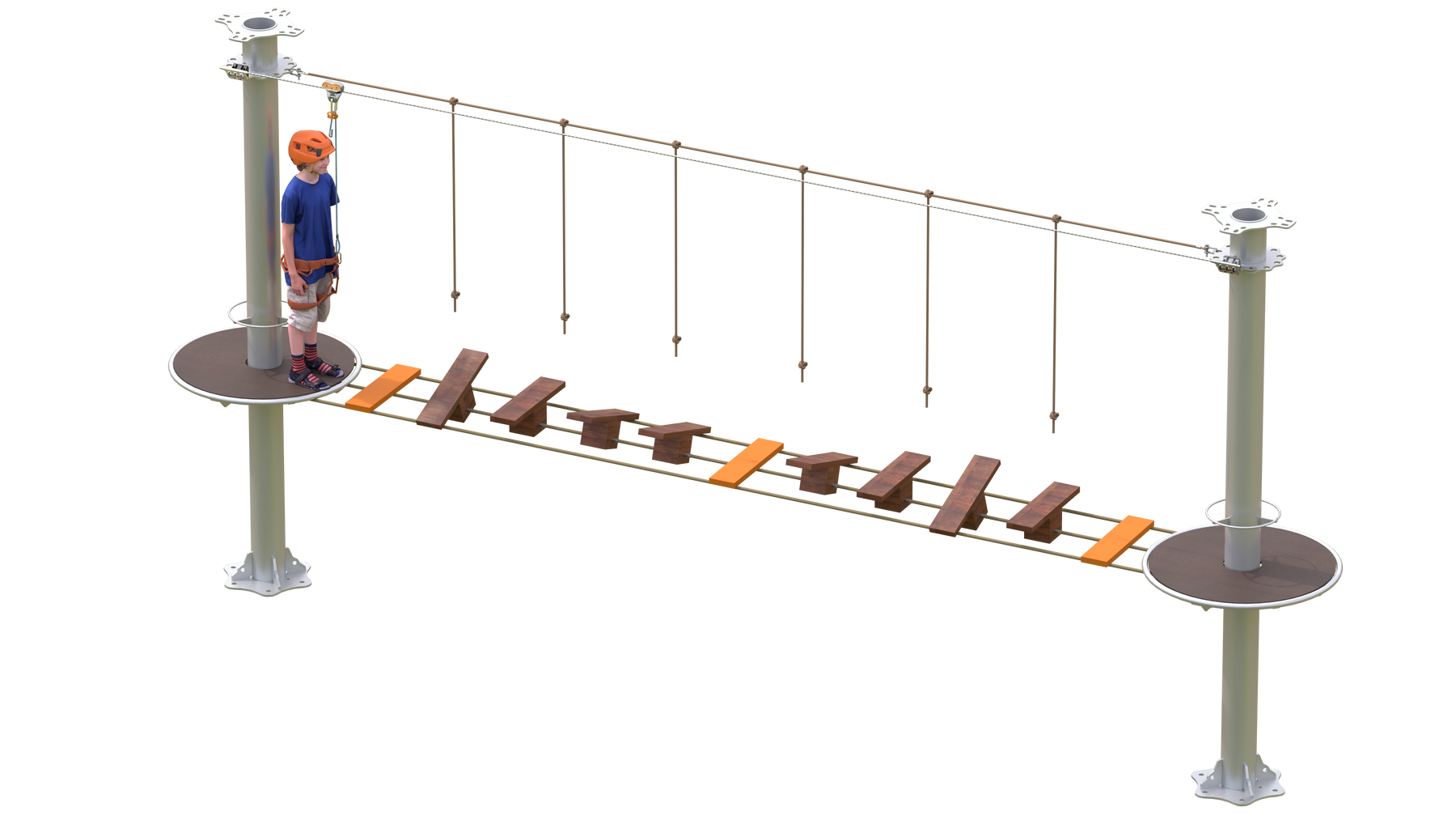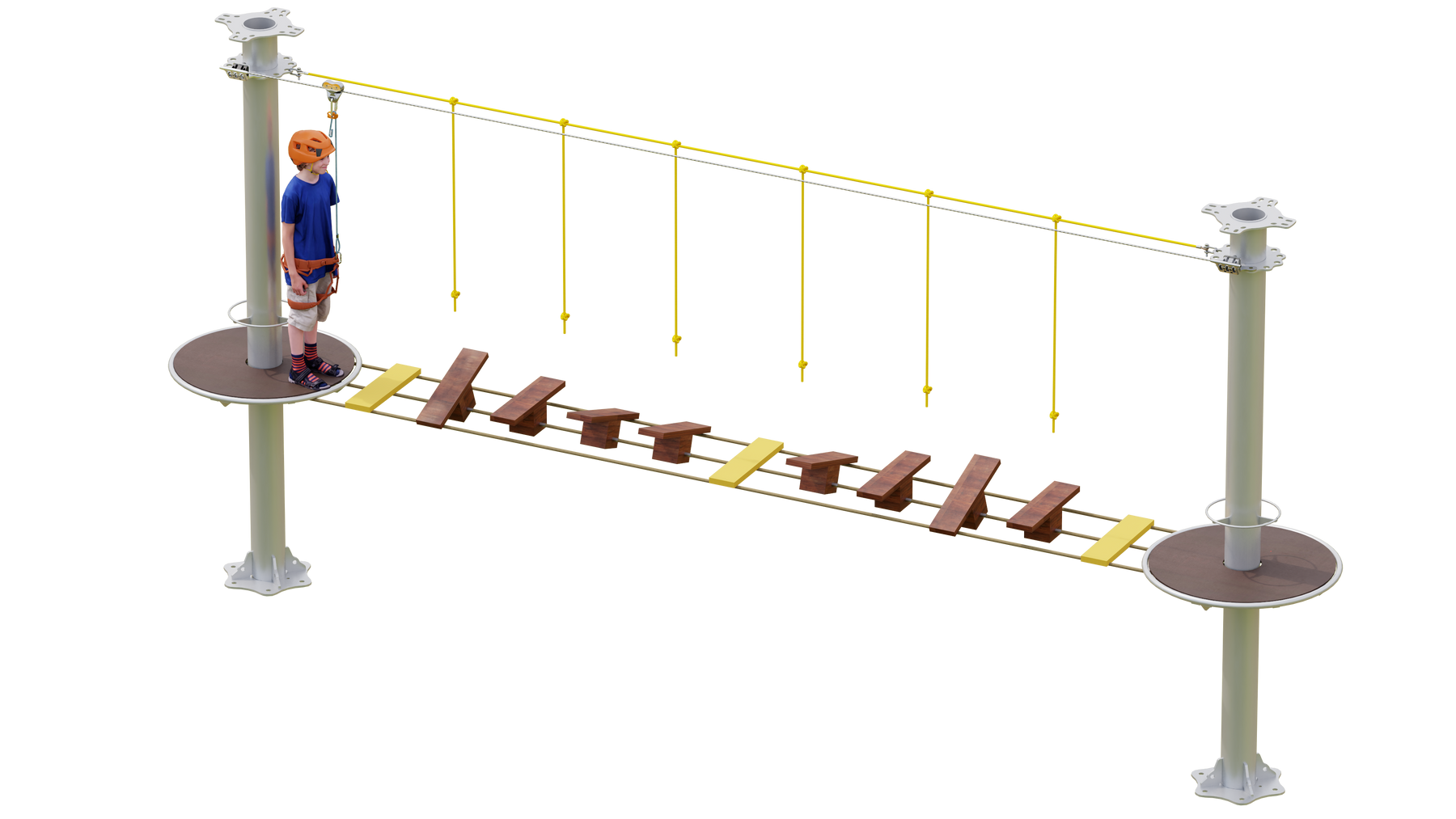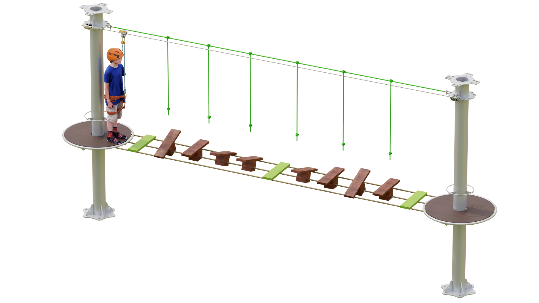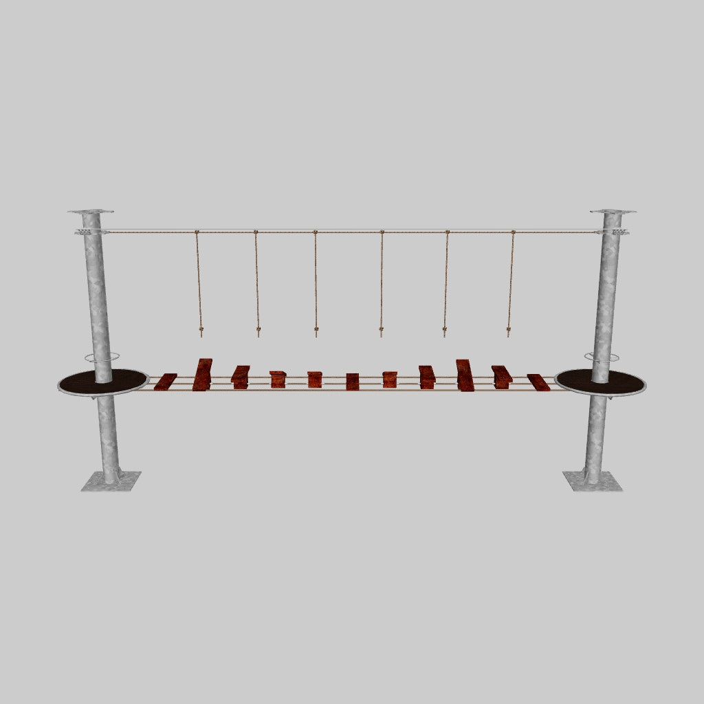 Juego diseñado para parques de aventura, compatible con estructuras de postes de acero o montajes en árboles. Disponible en longitudes estándar de 6 y 7 metros. Para dimensiones personalizadas, consulte con IMN. Anclajes incluidos. Estructura no incluida.