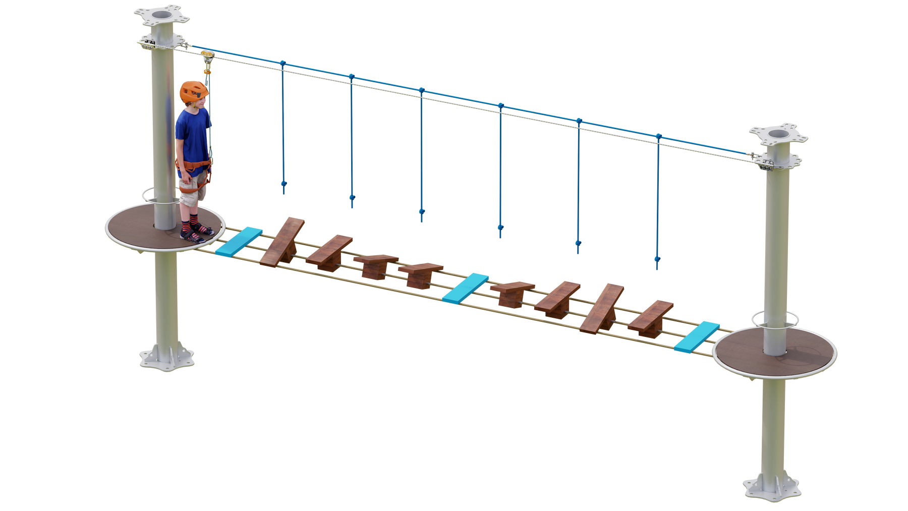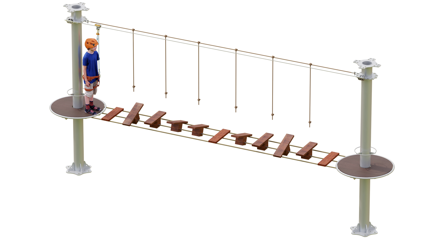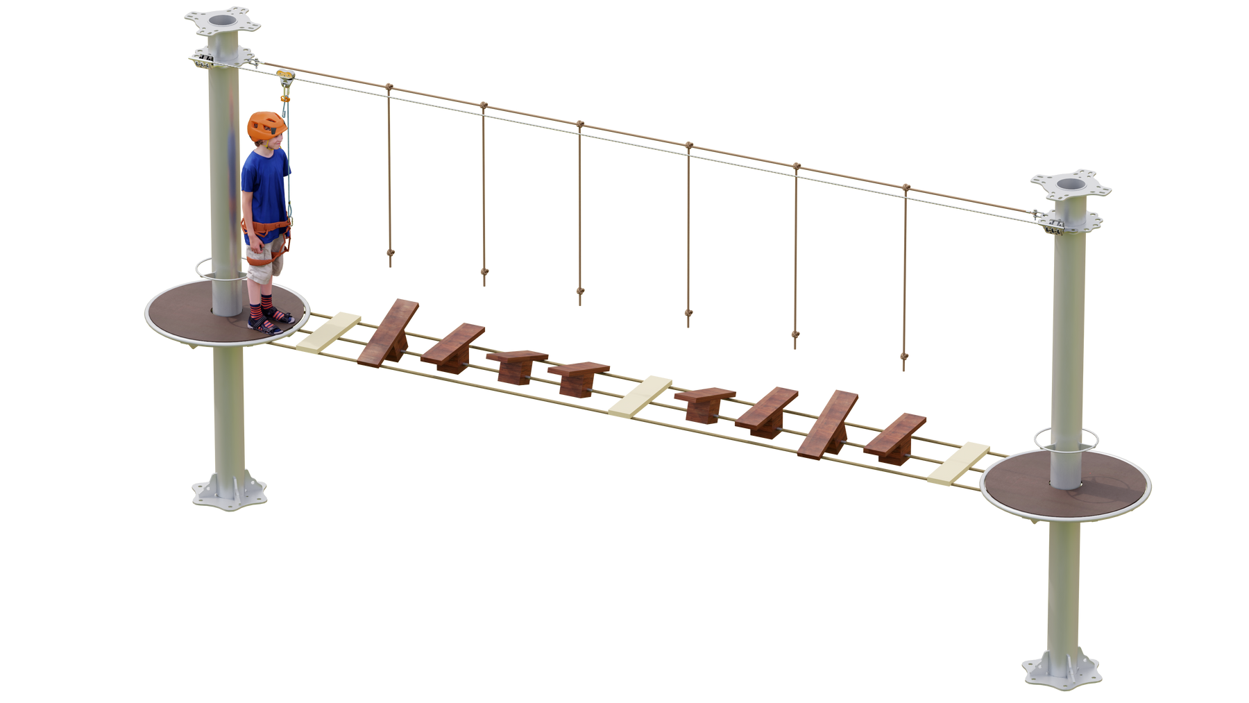 Juego diseñado para parques de aventura, compatible con estructuras de postes de acero o montajes en árboles. Disponible en longitudes estándar de 6 y 7 metros. Para dimensiones personalizadas, consulte con IMN. Anclajes incluidos. Estructura no incluida.