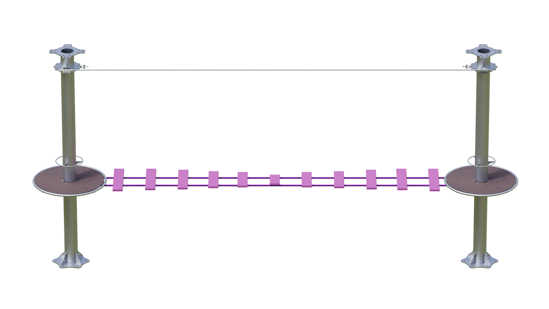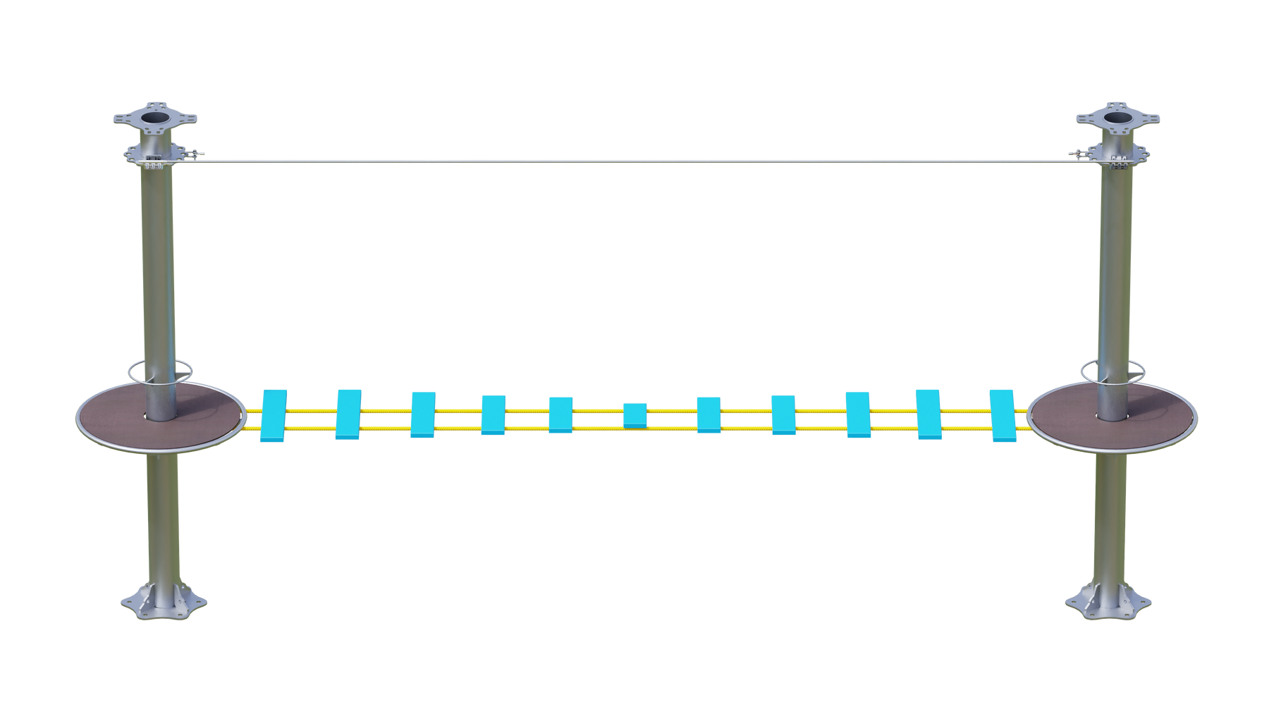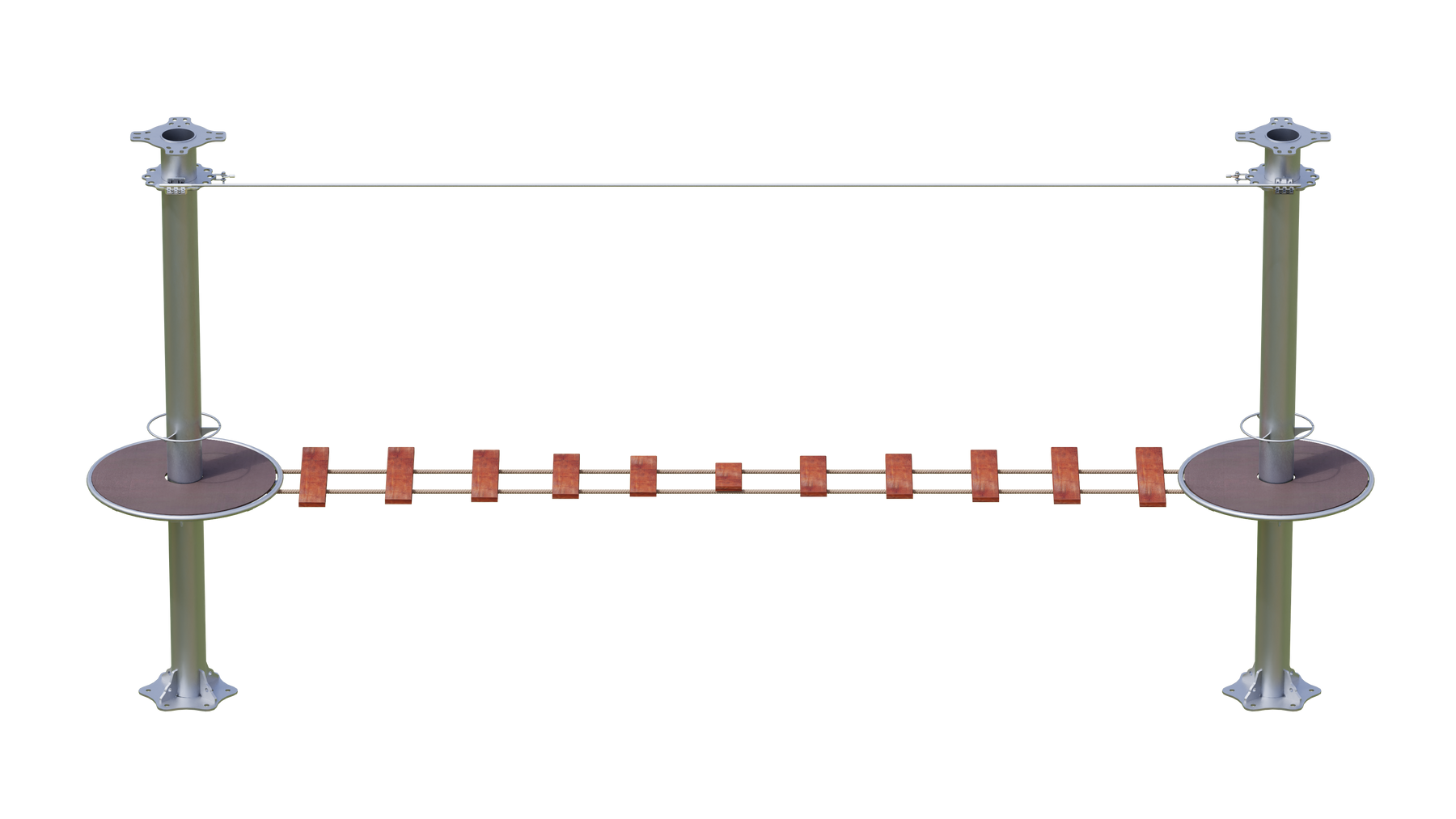 Juego diseñado para parques de aventura, compatible con estructuras de postes de acero o montajes en árboles. Disponible en longitudes estándar de 6 y 7 metros. Para dimensiones personalizadas, consulte con IMN. Anclajes incluidos. Estructura no incluida.