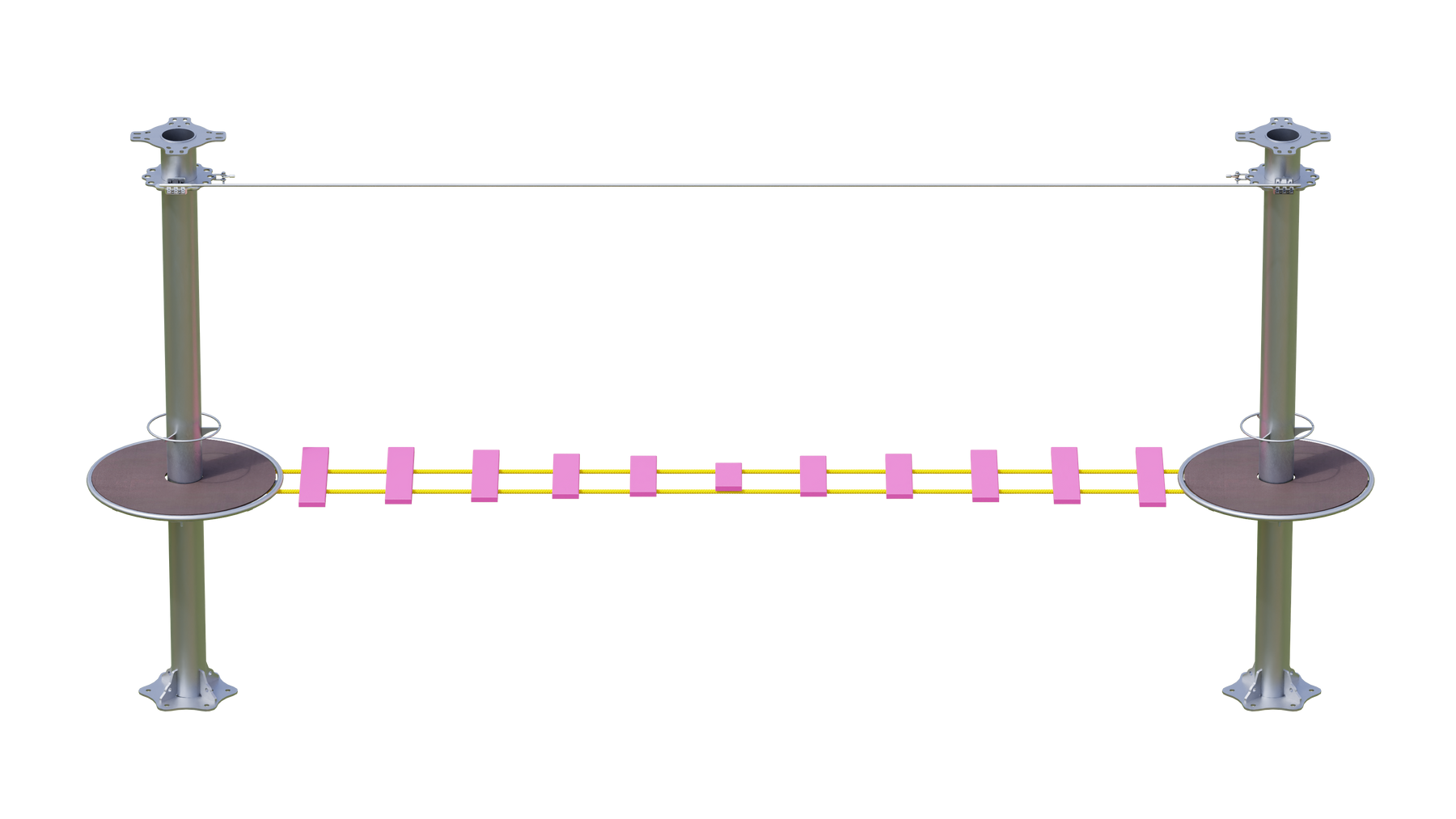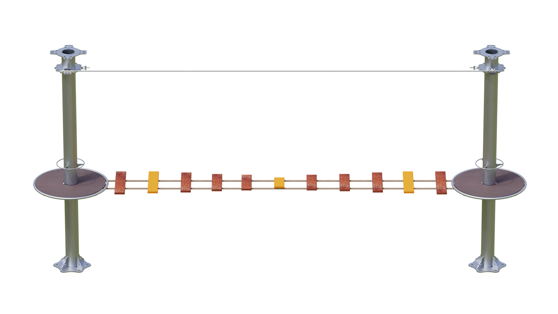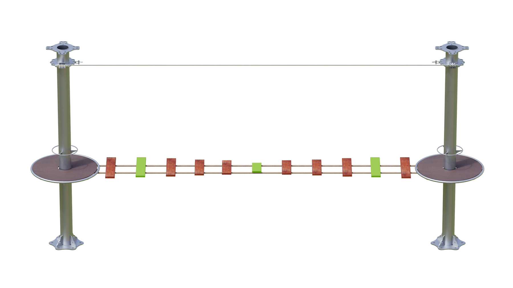 Juego diseñado para parques de aventura, compatible con estructuras de postes de acero o montajes en árboles. Disponible en longitudes estándar de 6 y 7 metros. Para dimensiones personalizadas, consulte con IMN. Anclajes incluidos. Estructura no incluida.