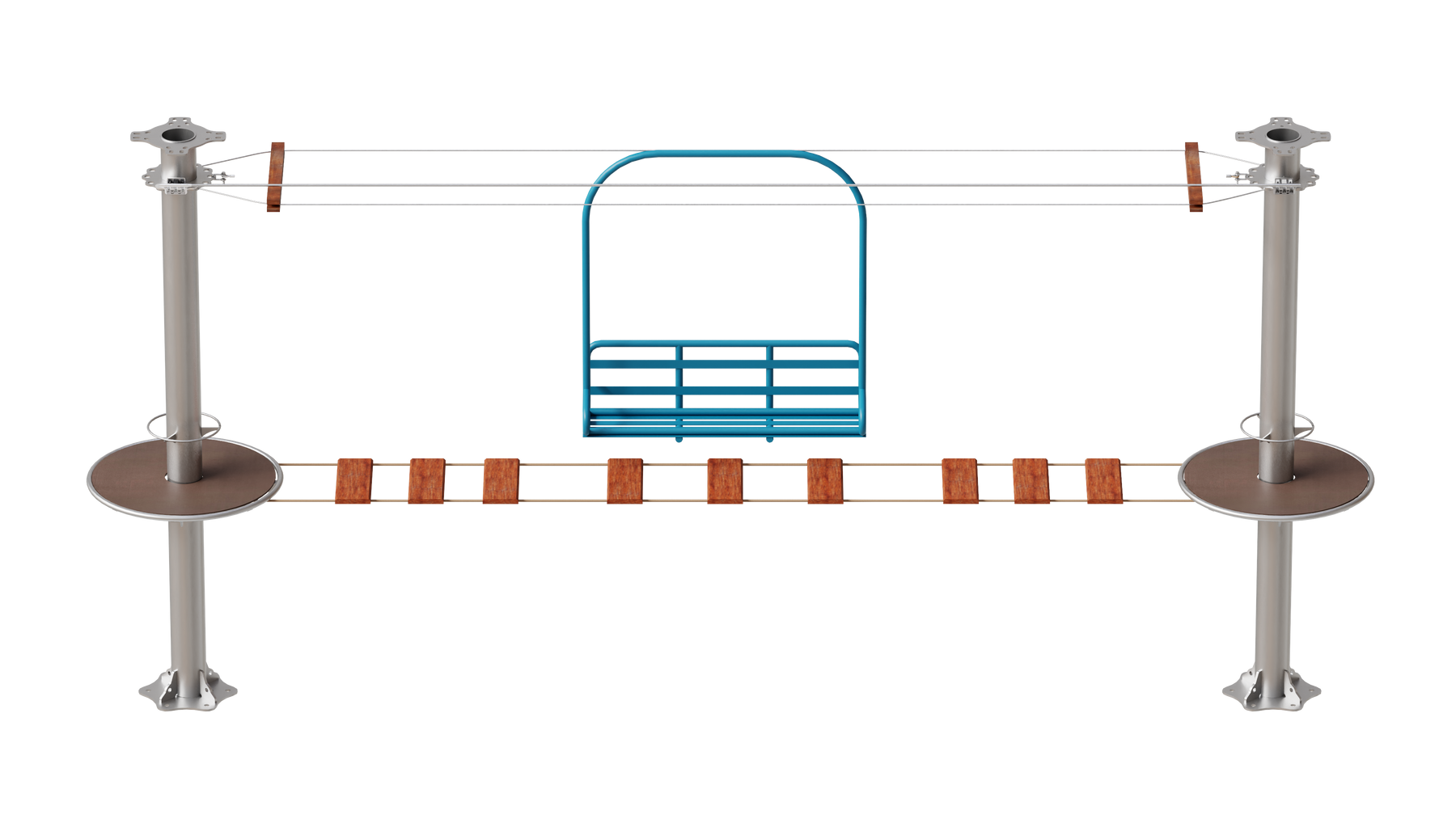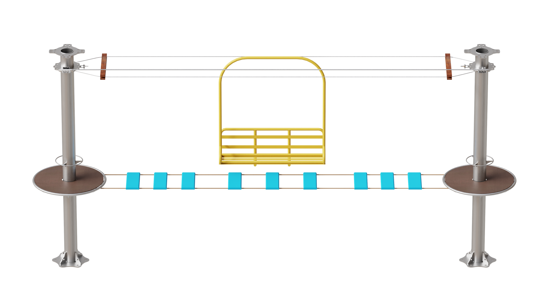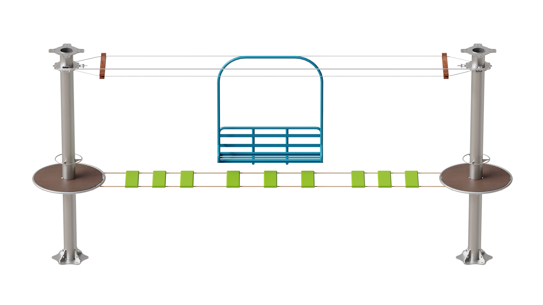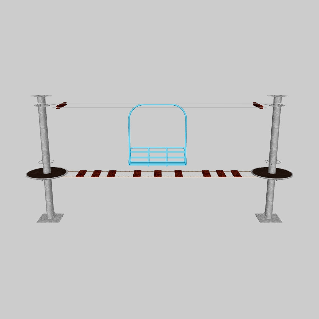 Juego diseñado para parques de aventura, compatible con estructuras de postes de acero o montajes en árboles. Disponible en longitudes estándar de 6 y 7 metros. Para dimensiones personalizadas, consulte con IMN. Anclajes incluidos. Estructura no incluida.