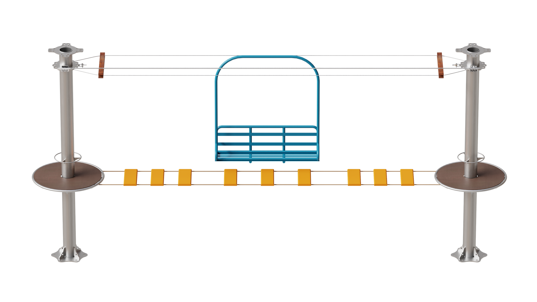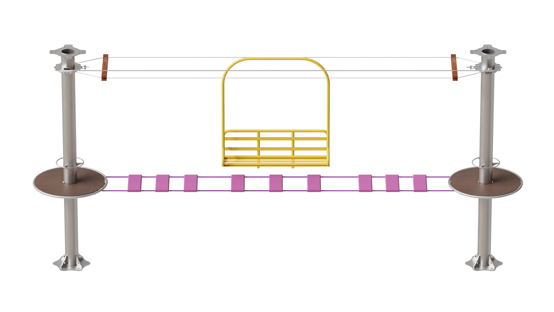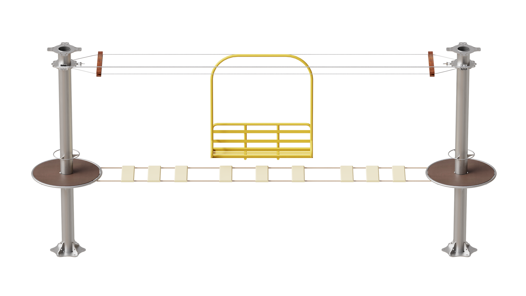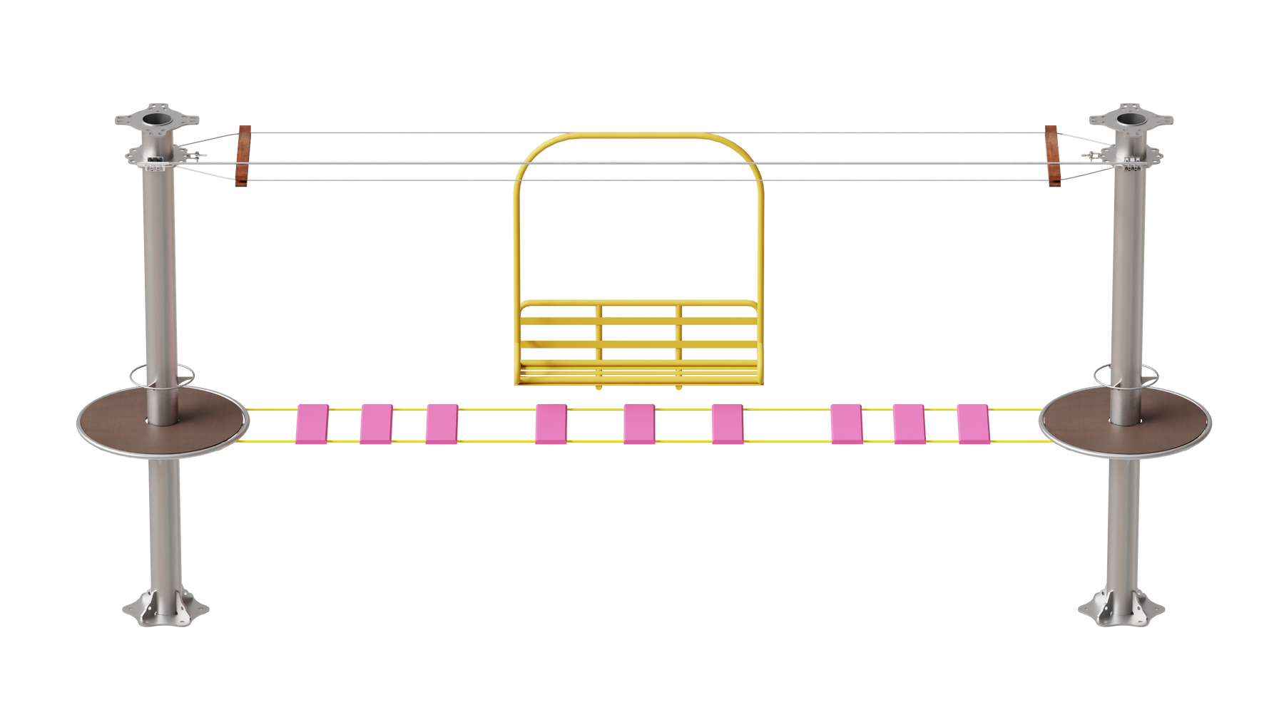 Juego diseñado para parques de aventura, compatible con estructuras de postes de acero o montajes en árboles. Disponible en longitudes estándar de 6 y 7 metros. Para dimensiones personalizadas, consulte con IMN. Anclajes incluidos. Estructura no incluida.
