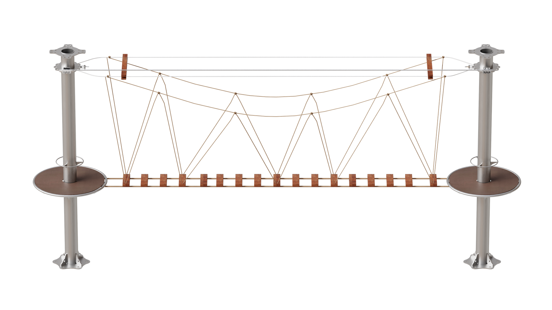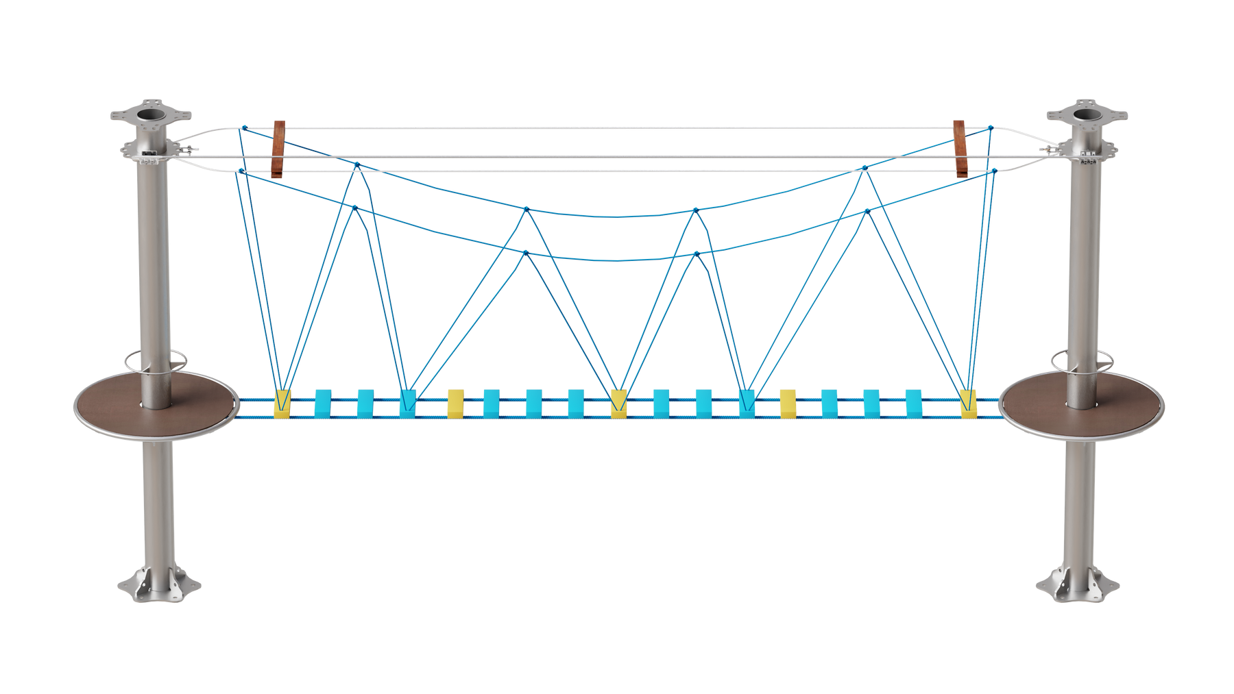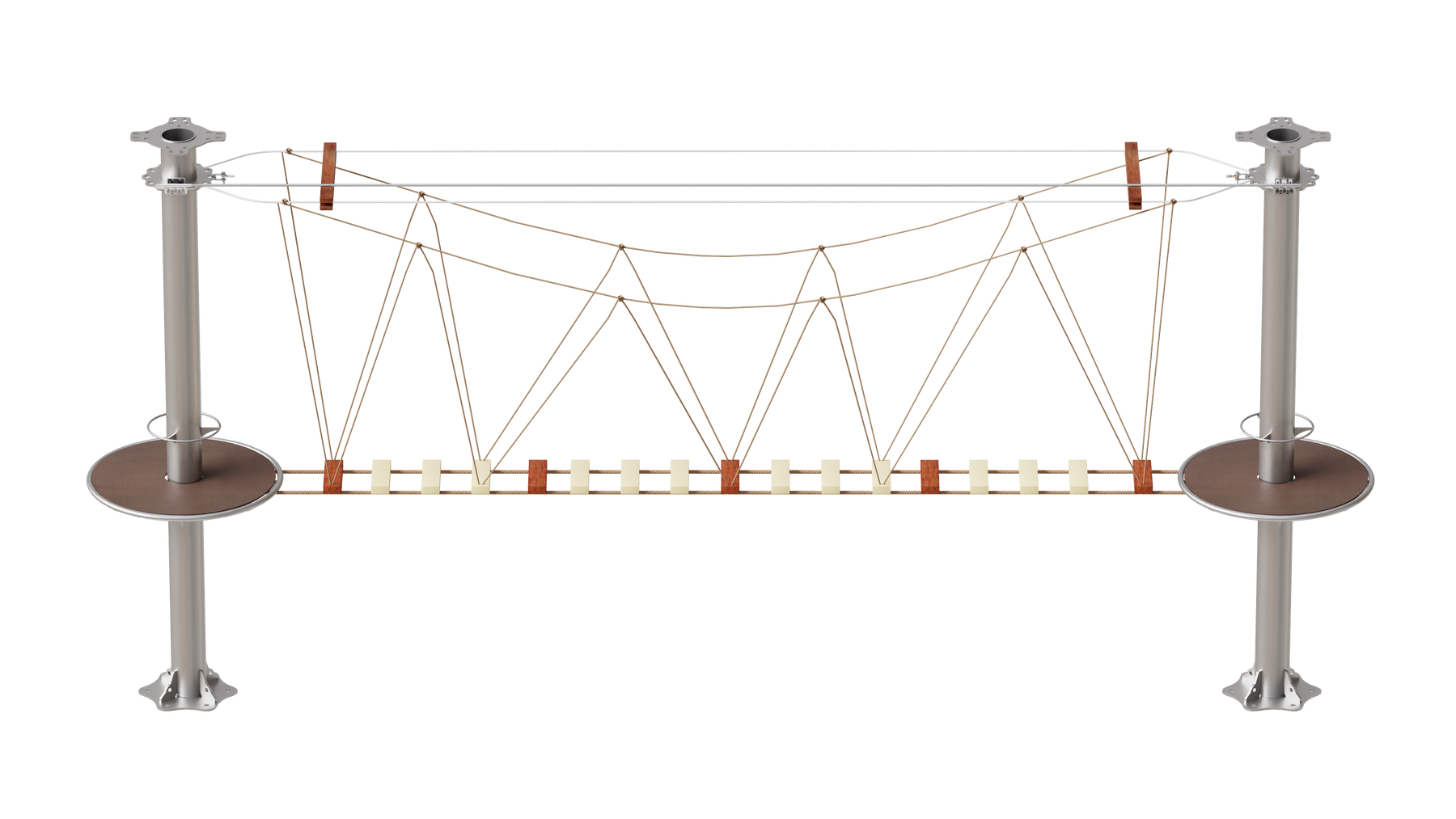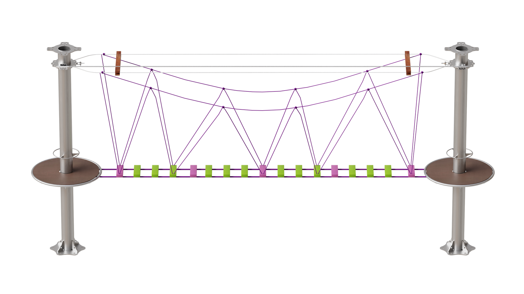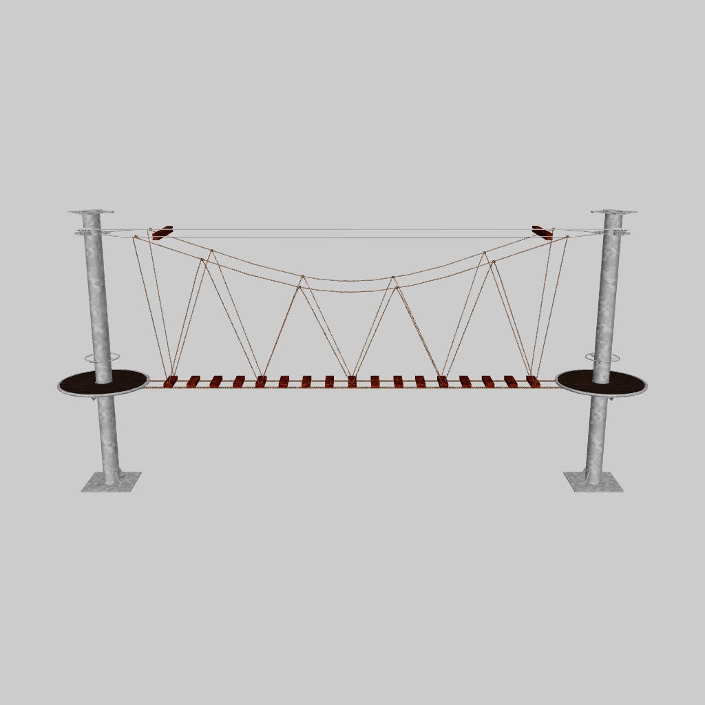 Juego diseñado para parques de aventura, compatible con estructuras de postes de acero o montajes en árboles. Disponible en longitudes estándar de 6 y 7 metros. Para dimensiones personalizadas, consulte con IMN. Anclajes incluidos. Estructura no incluida.