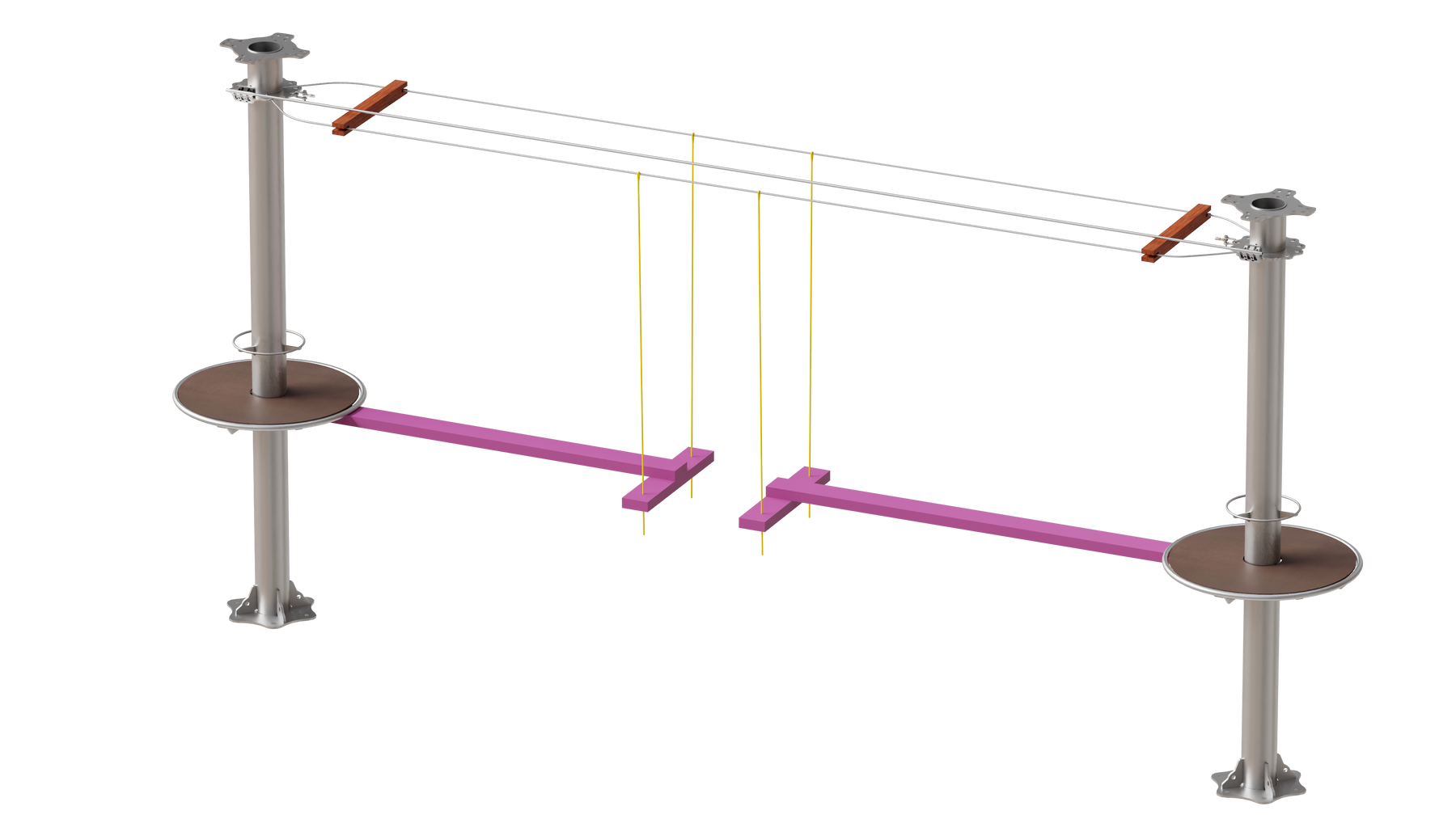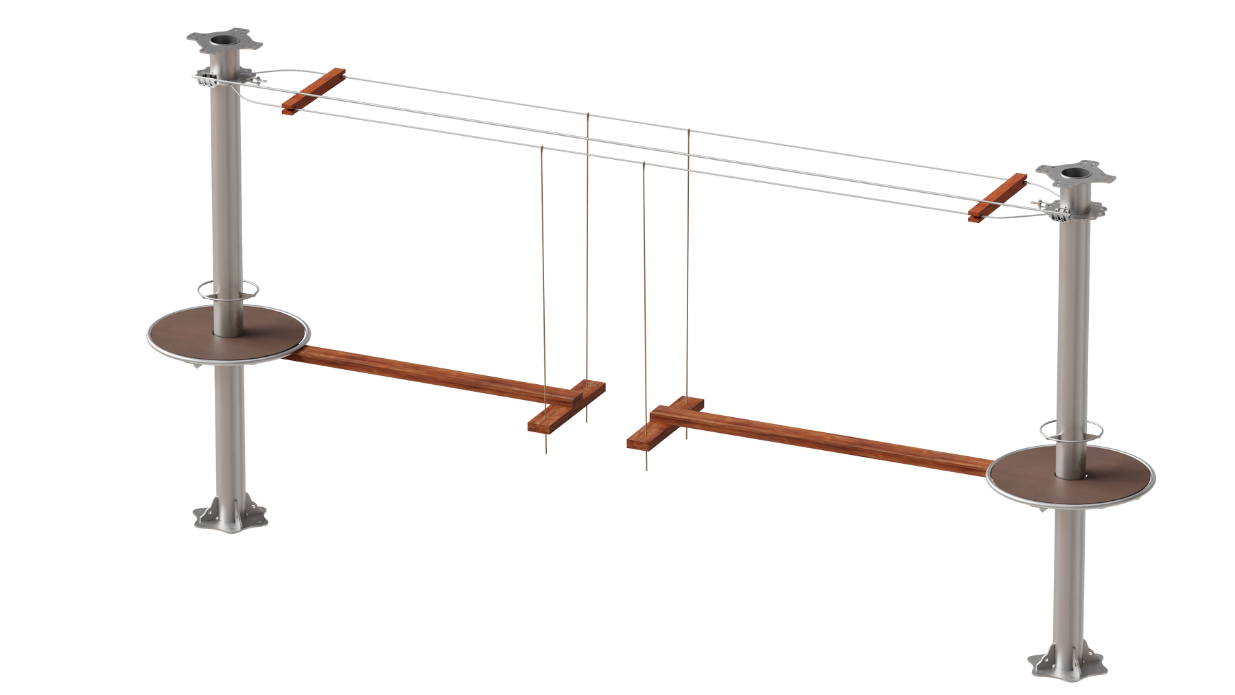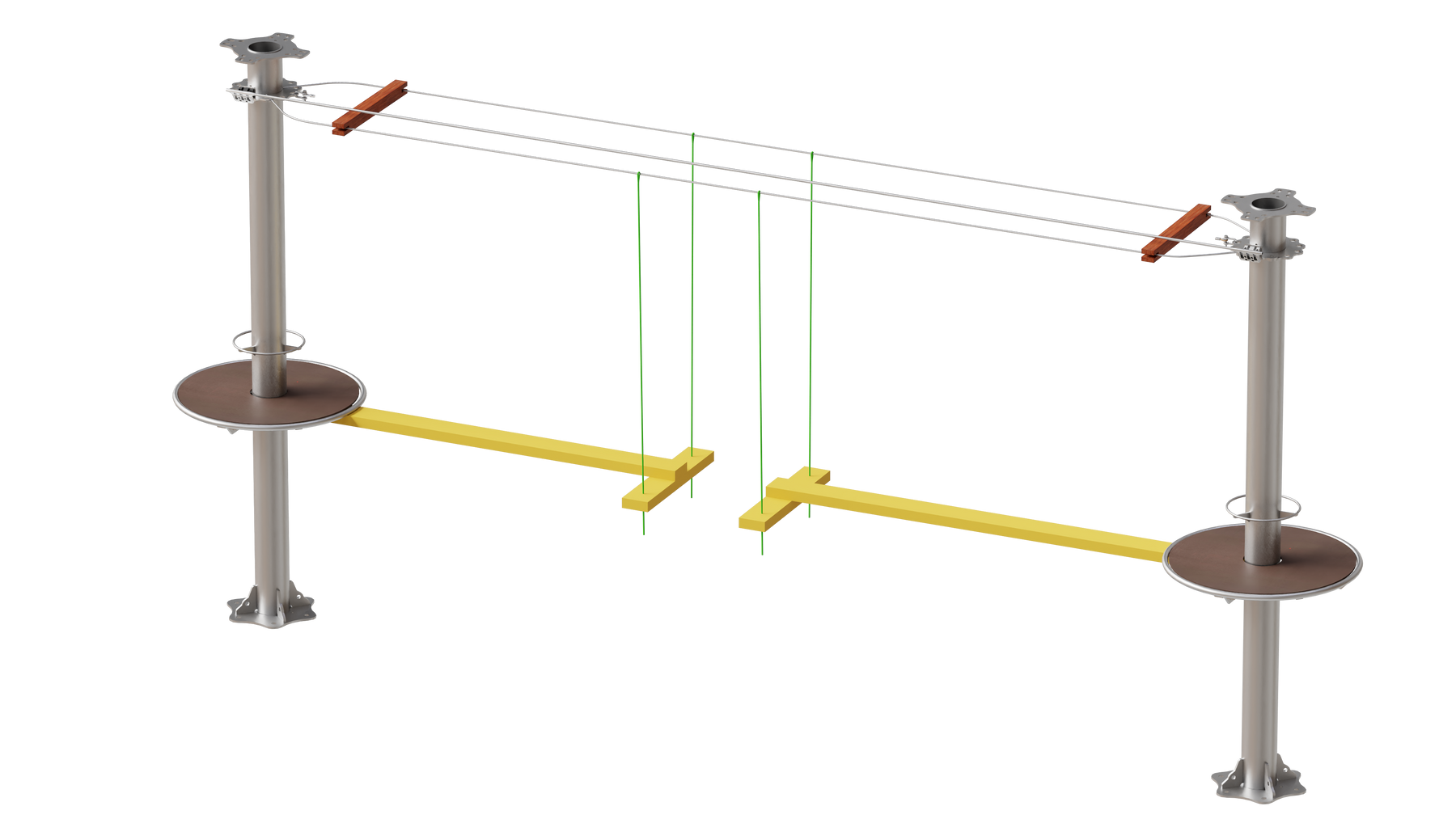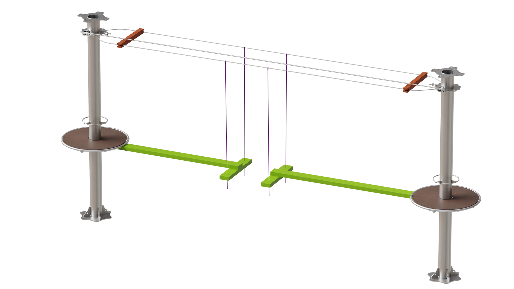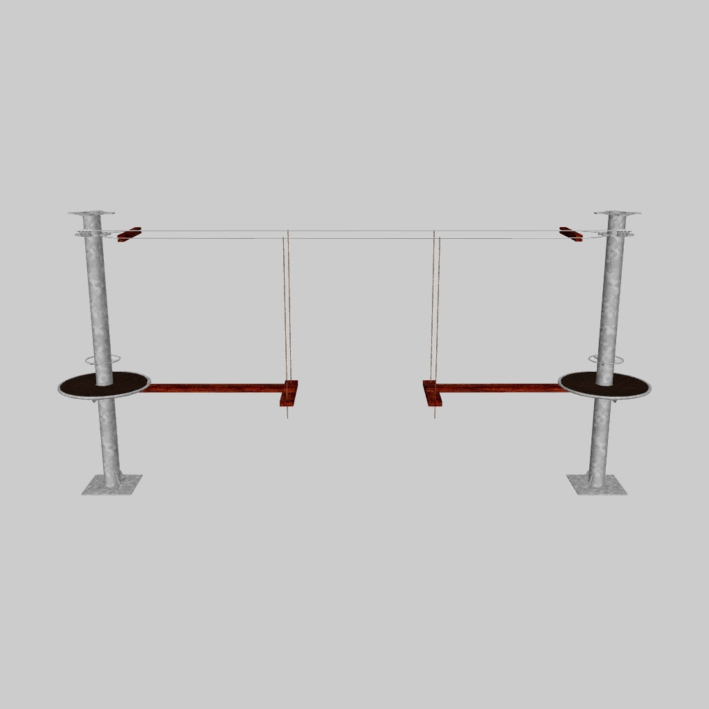 Juego diseñado para parques de aventura, compatible con estructuras de postes de acero o montajes en árboles. Disponible en longitudes estándar de 6 y 7 metros. Para dimensiones personalizadas, consulte con IMN. Anclajes incluidos. Estructura no incluida.