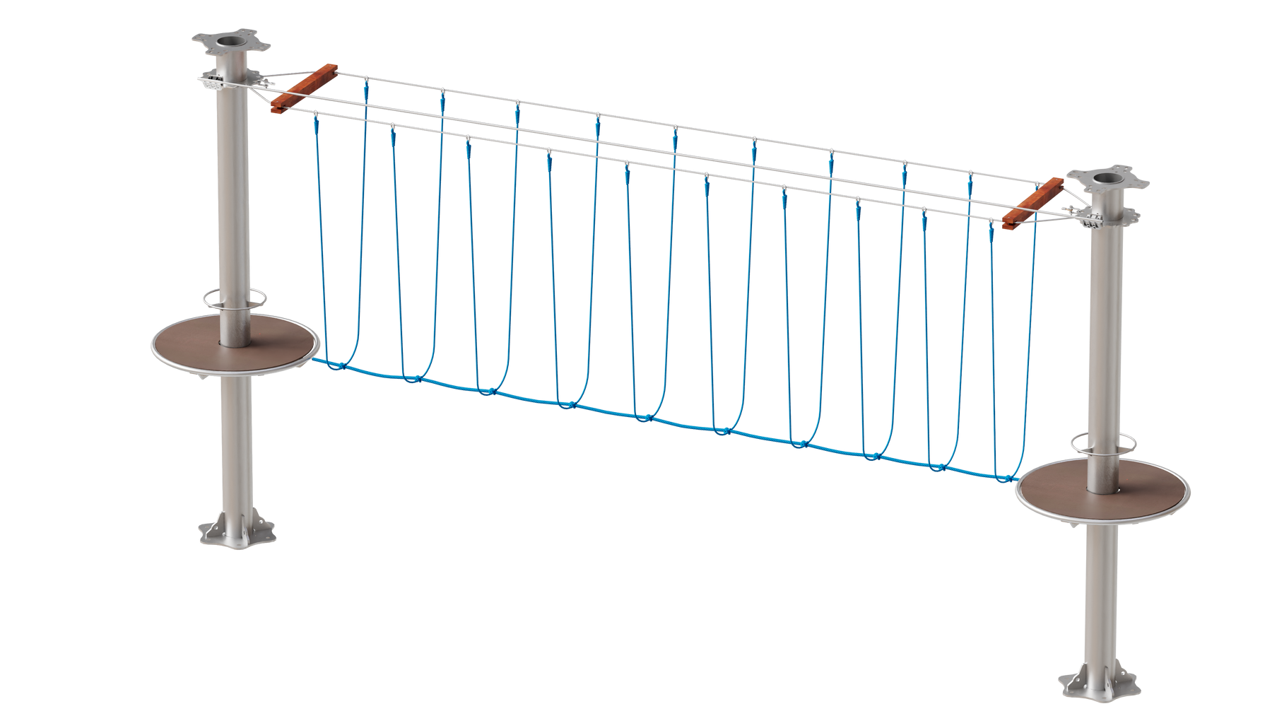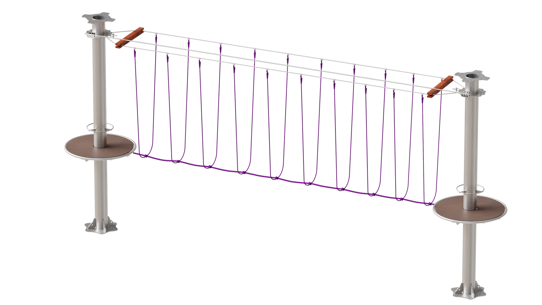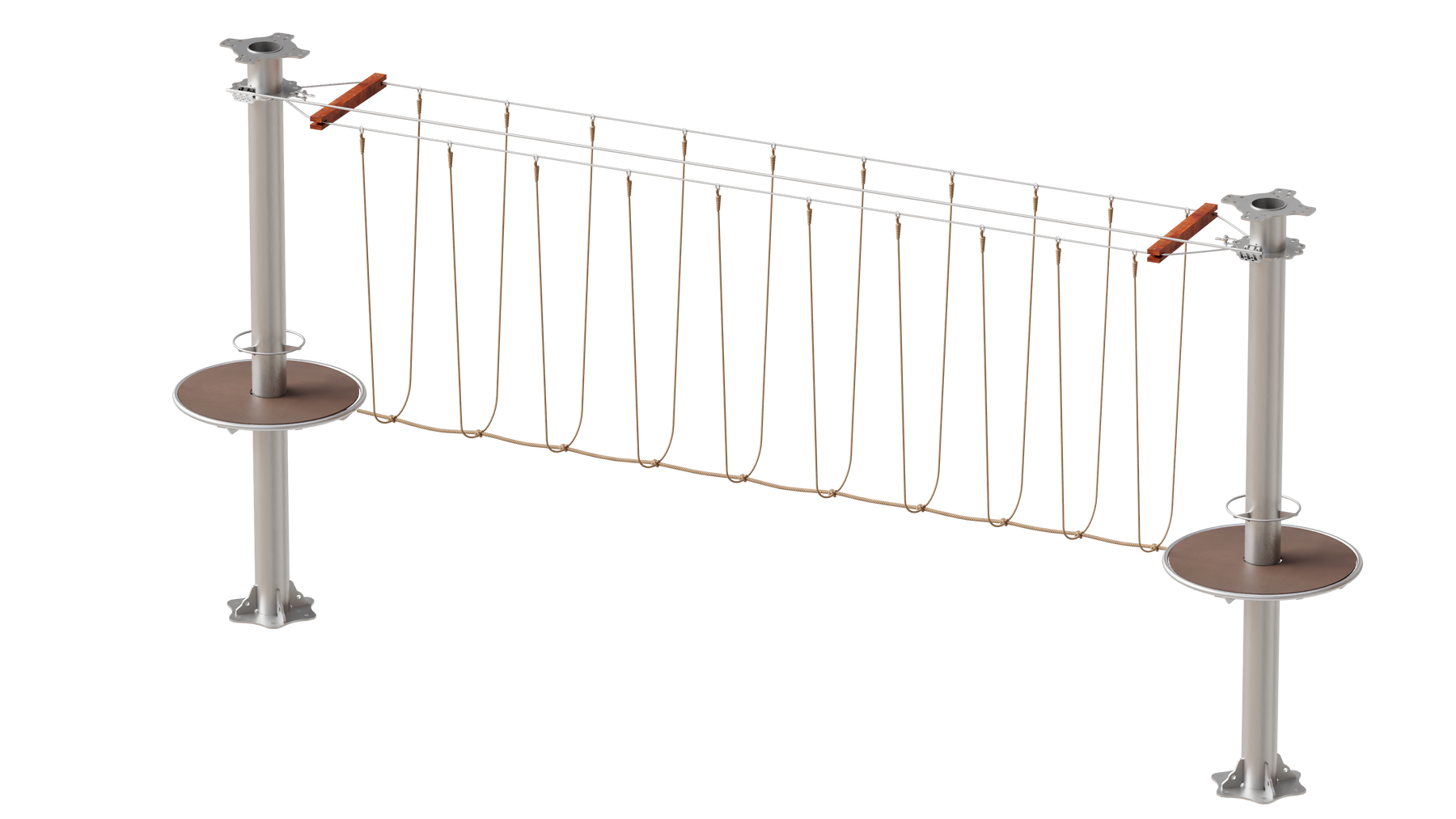 Juego diseñado para parques de aventura, compatible con estructuras de postes de acero o montajes en árboles. Disponible en longitudes estándar de 6 y 7 metros. Para dimensiones personalizadas, consulte con IMN. Anclajes incluidos. Estructura no incluida.