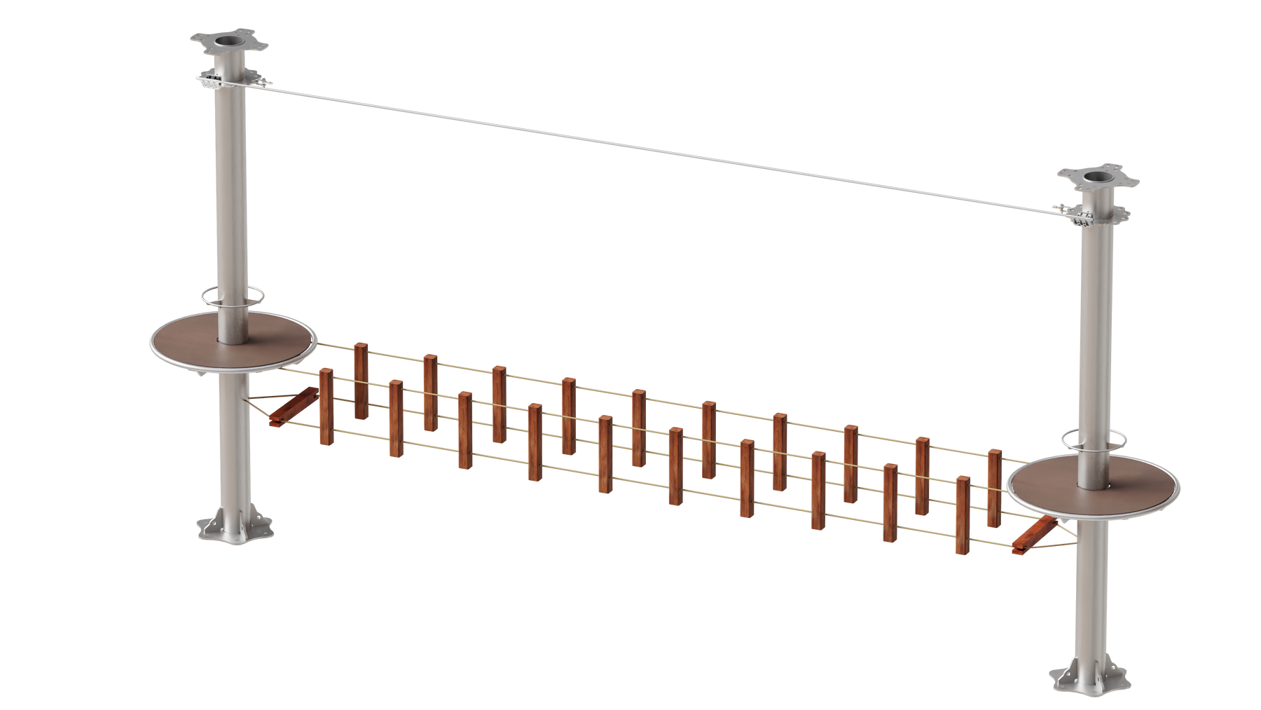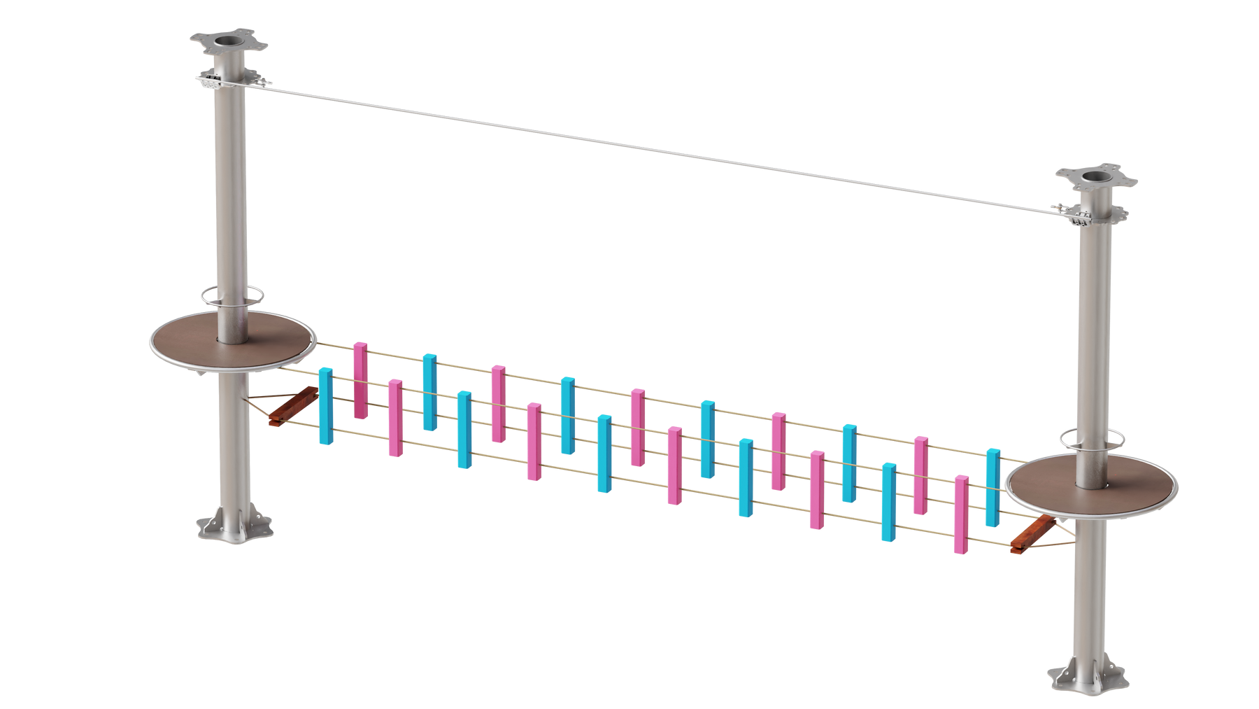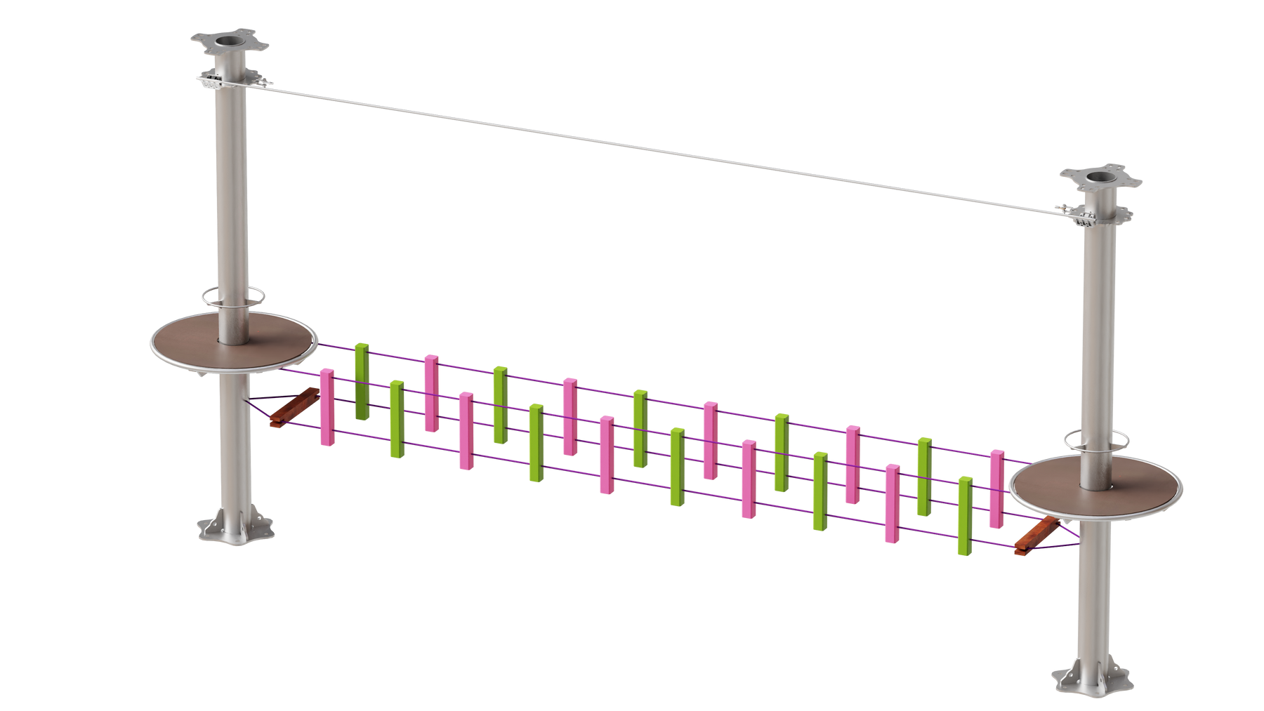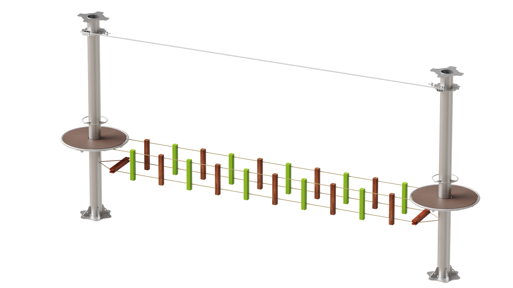 Juego diseñado para parques de aventura, compatible con estructuras de postes de acero o montajes en árboles. Disponible en longitudes estándar de 6 y 7 metros. Para dimensiones personalizadas, consulte con IMN. Anclajes incluidos. Estructura no incluida.