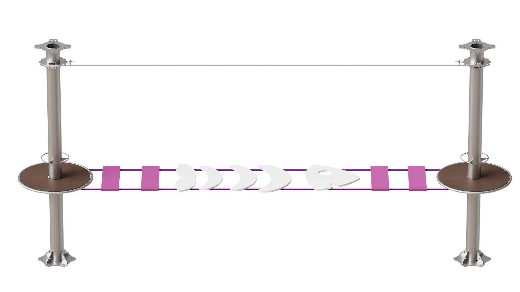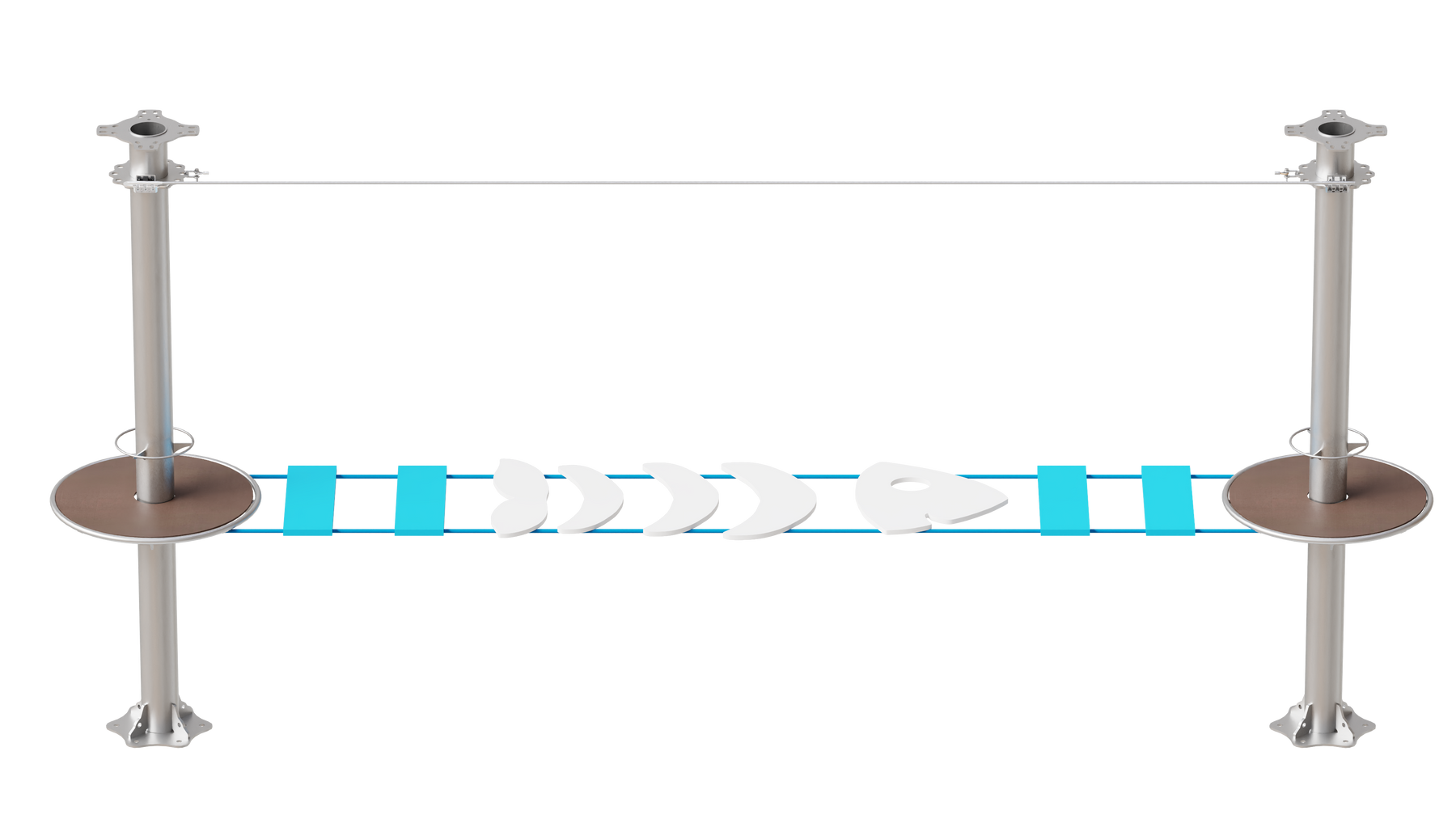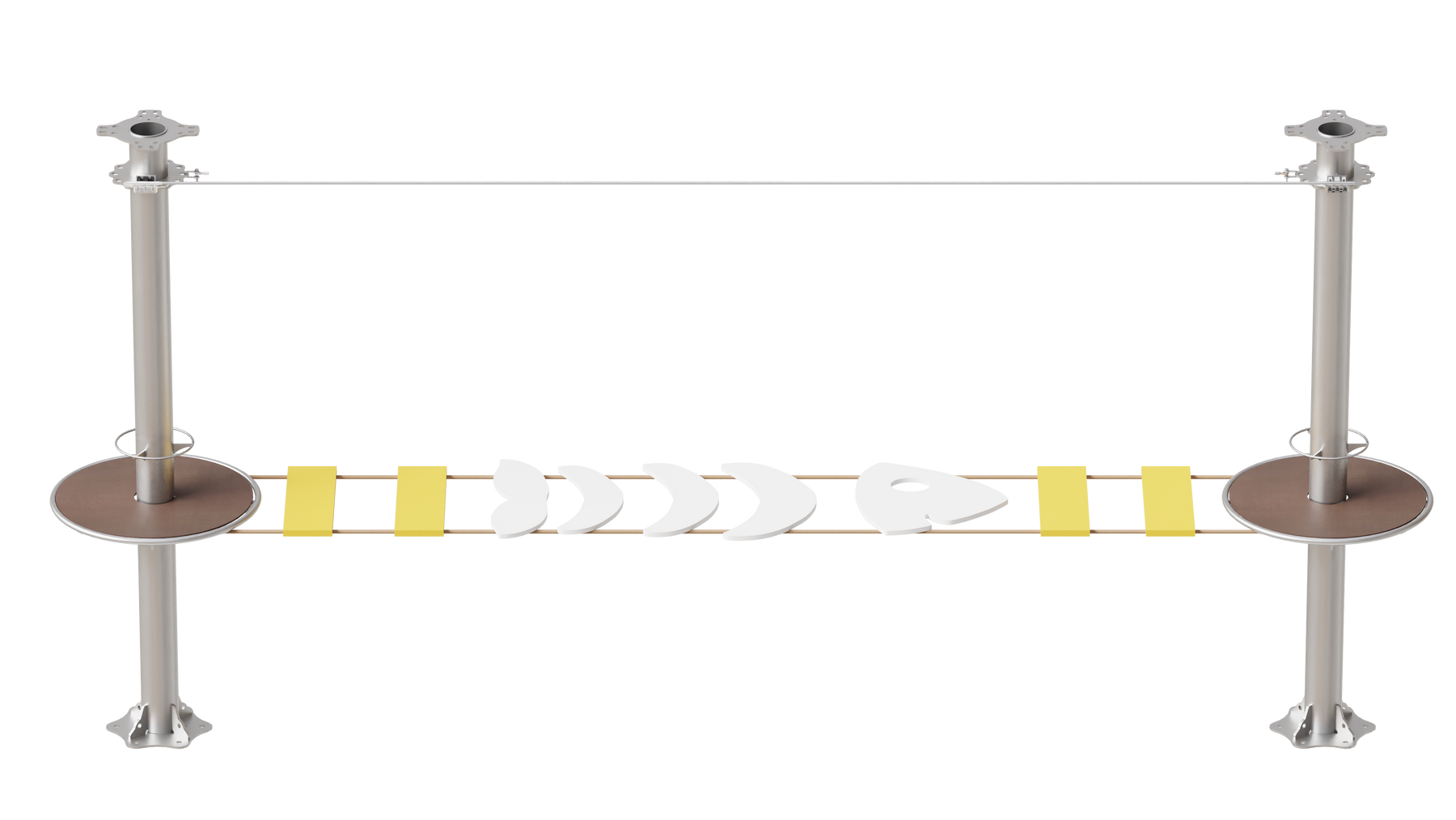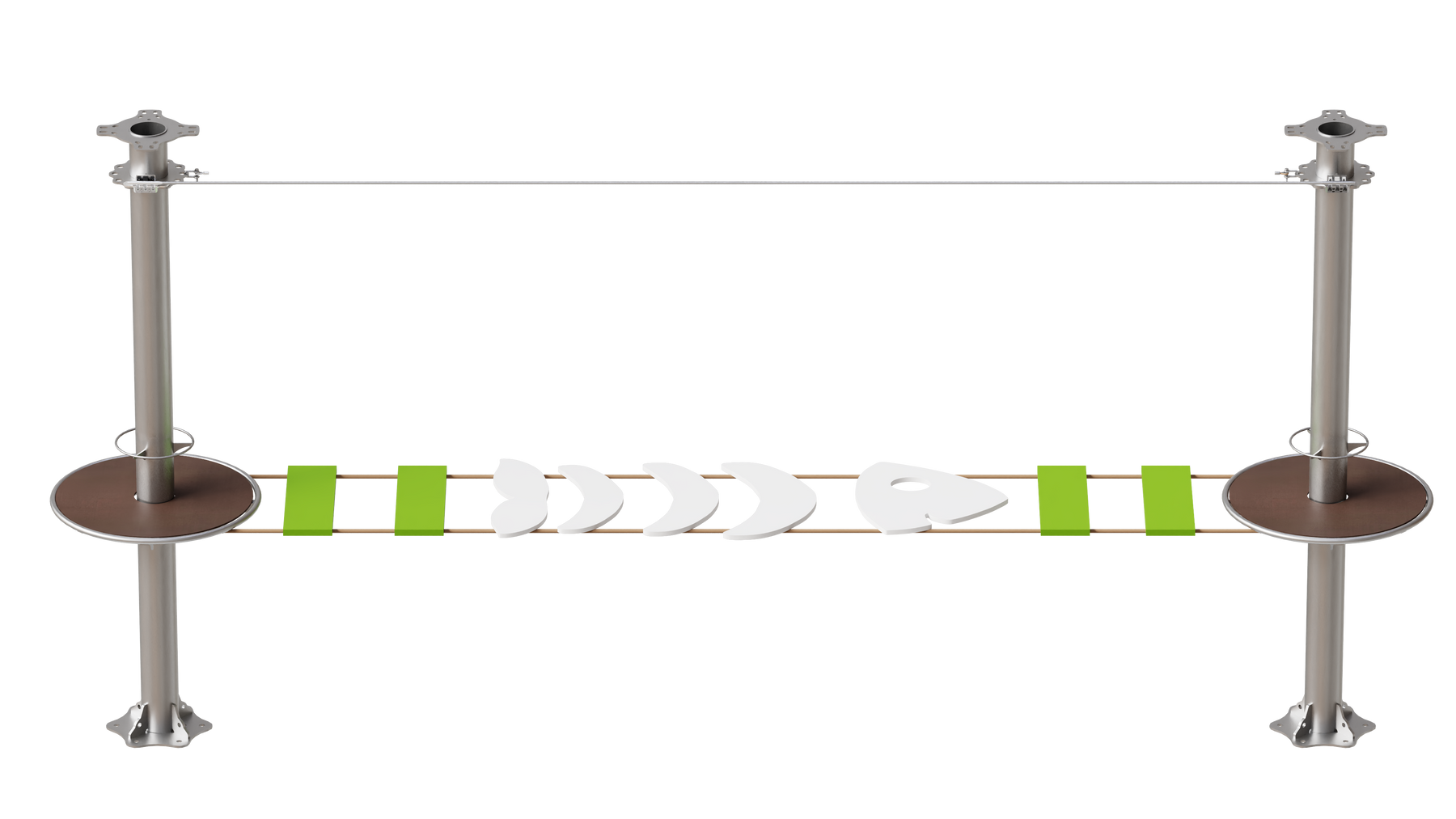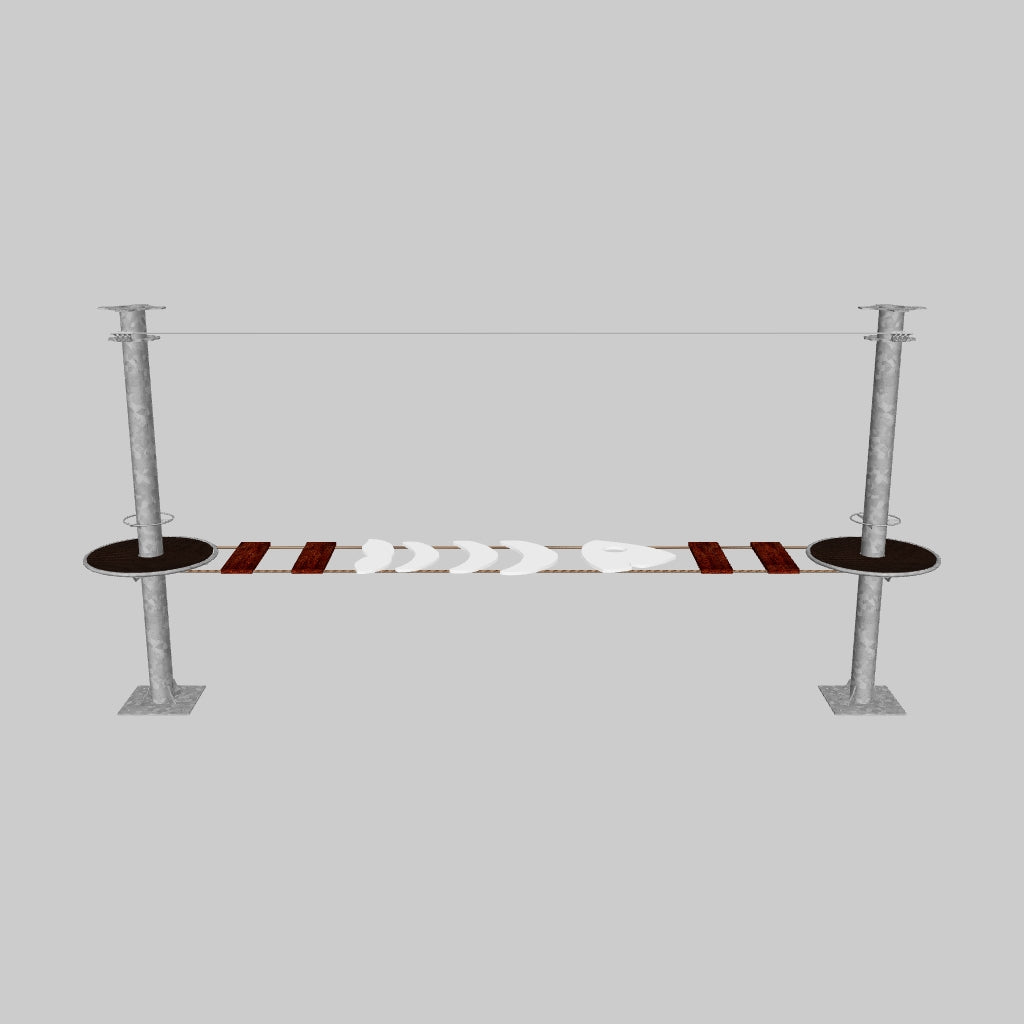 Juego diseñado para parques de aventura, compatible con estructuras de postes de acero o montajes en árboles. Disponible en longitudes estándar de 6 y 7 metros. Para dimensiones personalizadas, consulte con IMN. Anclajes incluidos. Estructura no incluida.