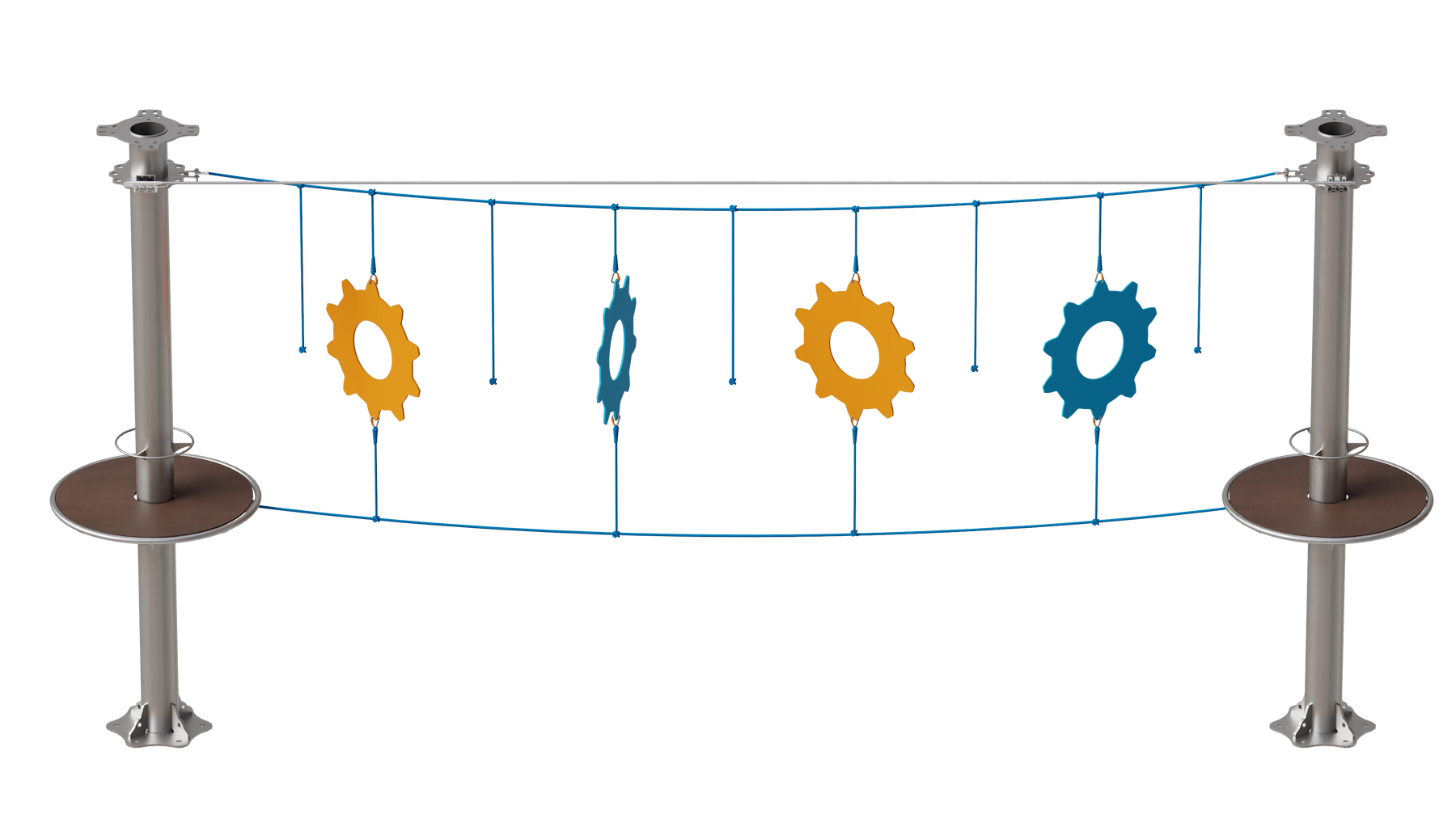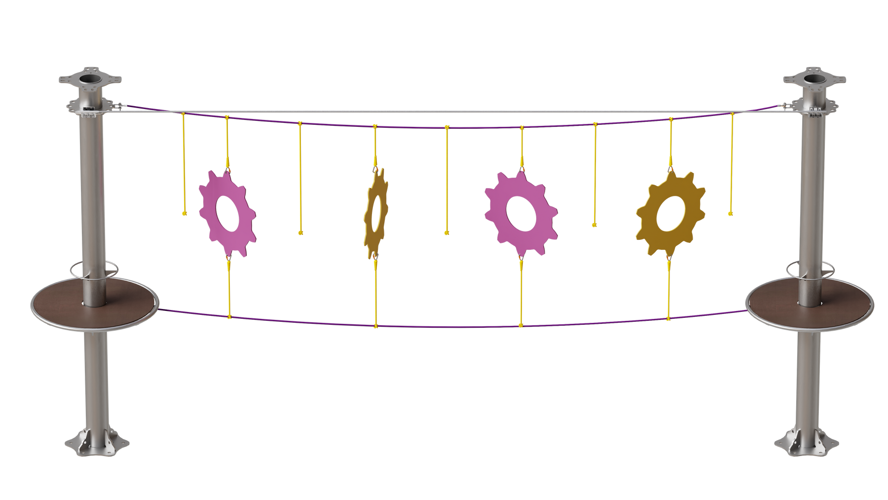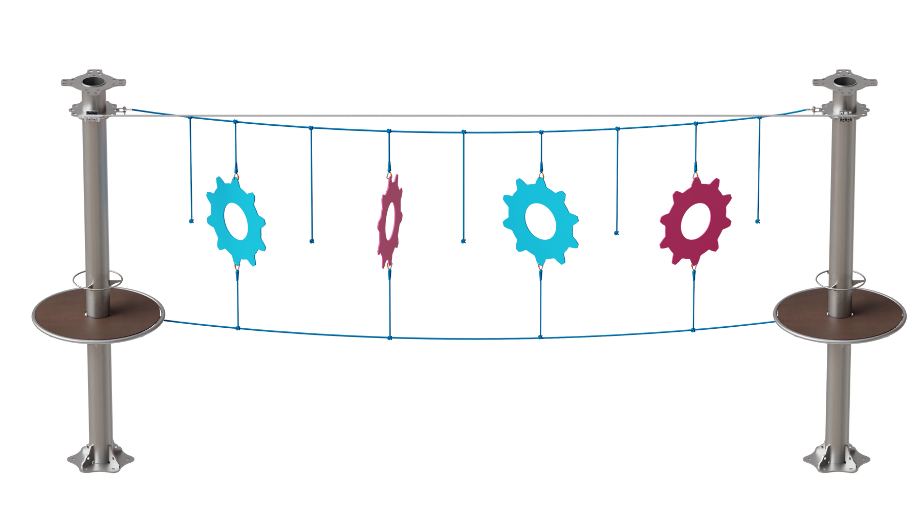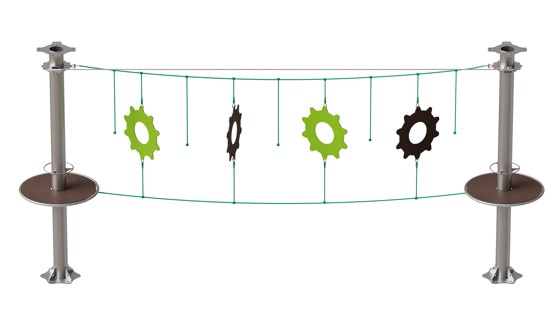 Juego diseñado para parques de aventura, compatible con estructuras de postes de acero o montajes en árboles. Disponible en longitudes estándar de 6 y 7 metros. Para dimensiones personalizadas, consulte con IMN. Anclajes incluidos. Estructura no incluida.