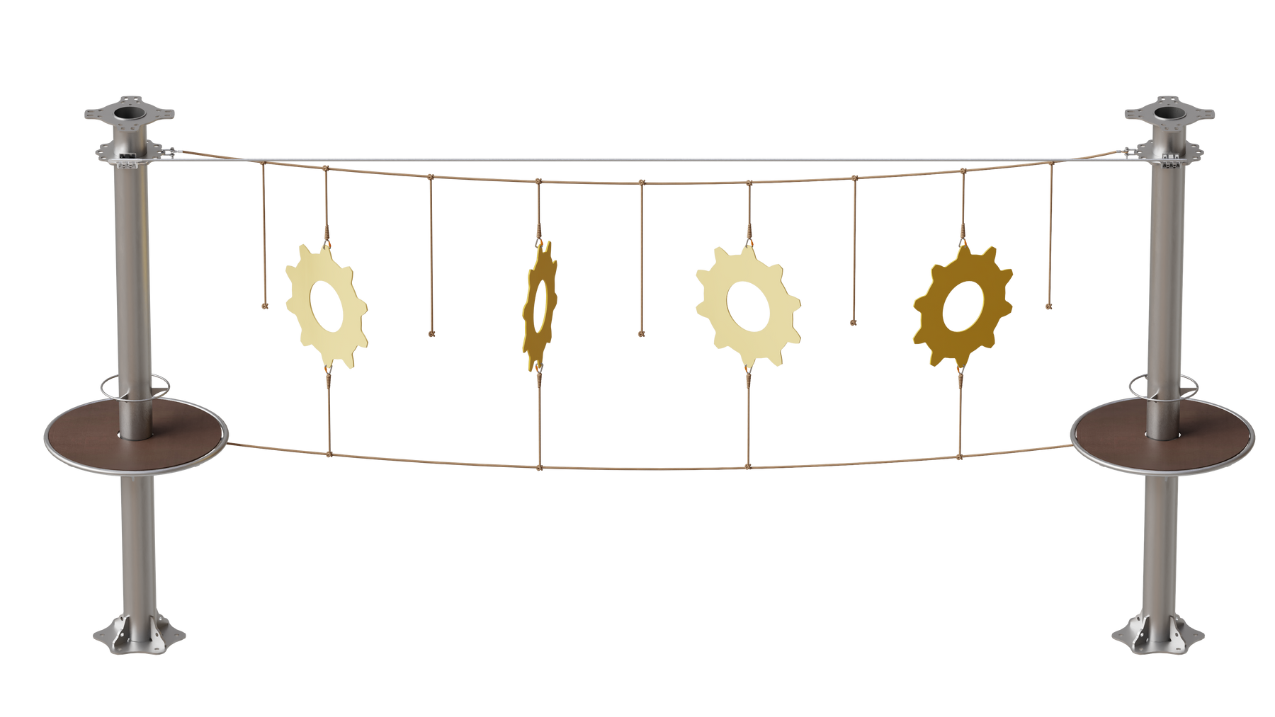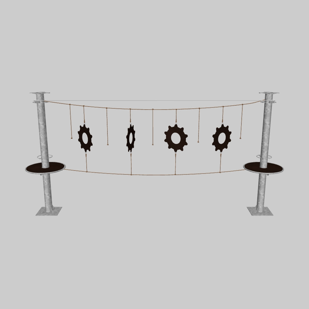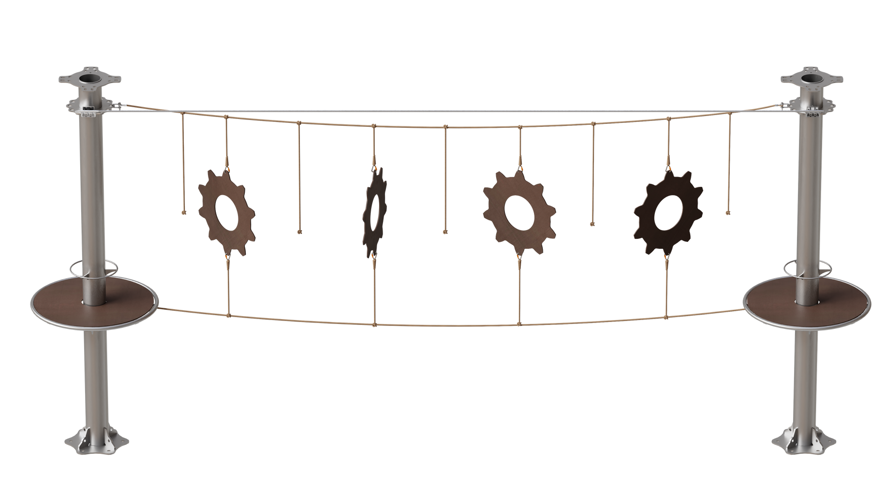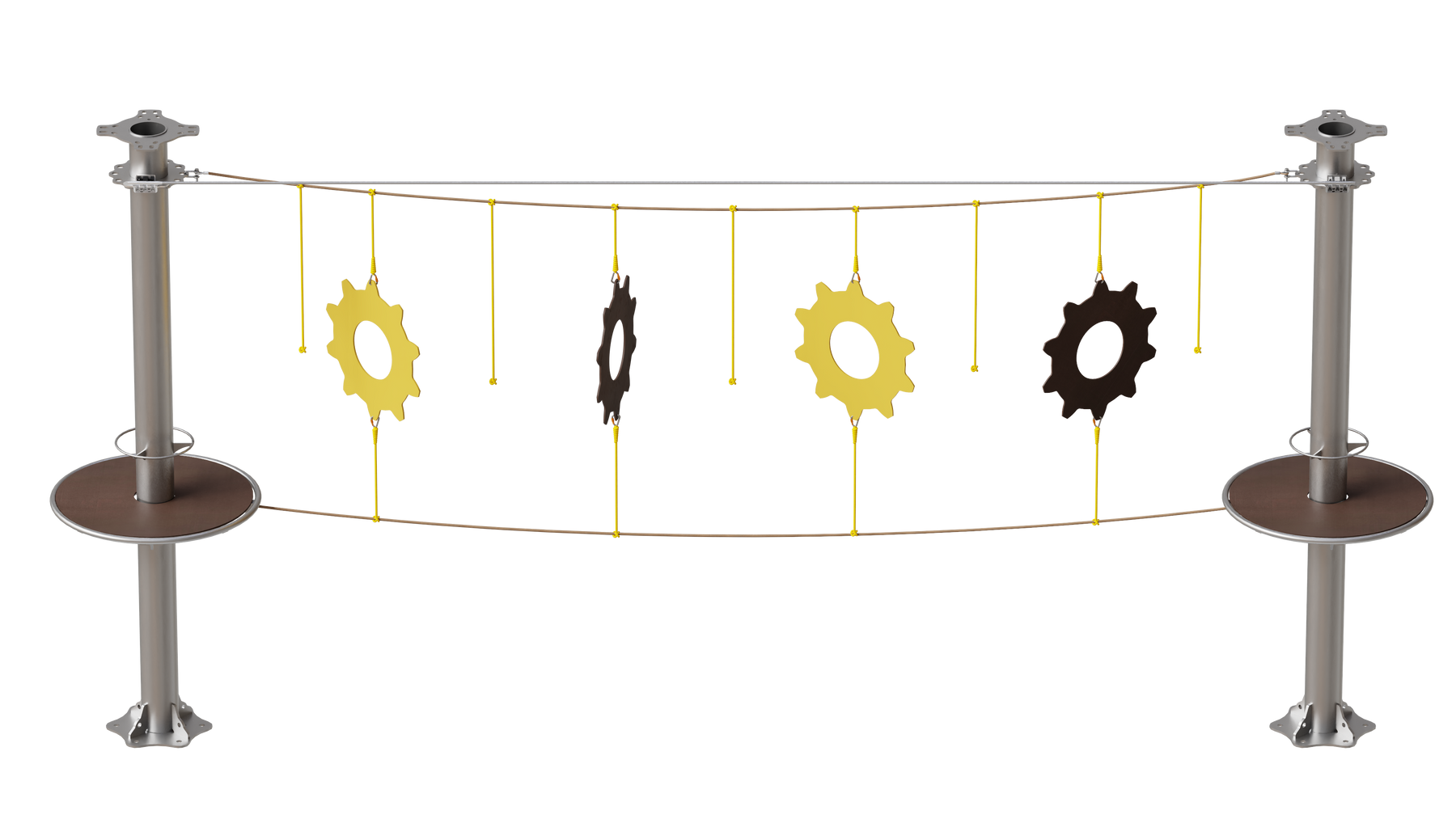 Juego diseñado para parques de aventura, compatible con estructuras de postes de acero o montajes en árboles. Disponible en longitudes estándar de 6 y 7 metros. Para dimensiones personalizadas, consulte con IMN. Anclajes incluidos. Estructura no incluida.