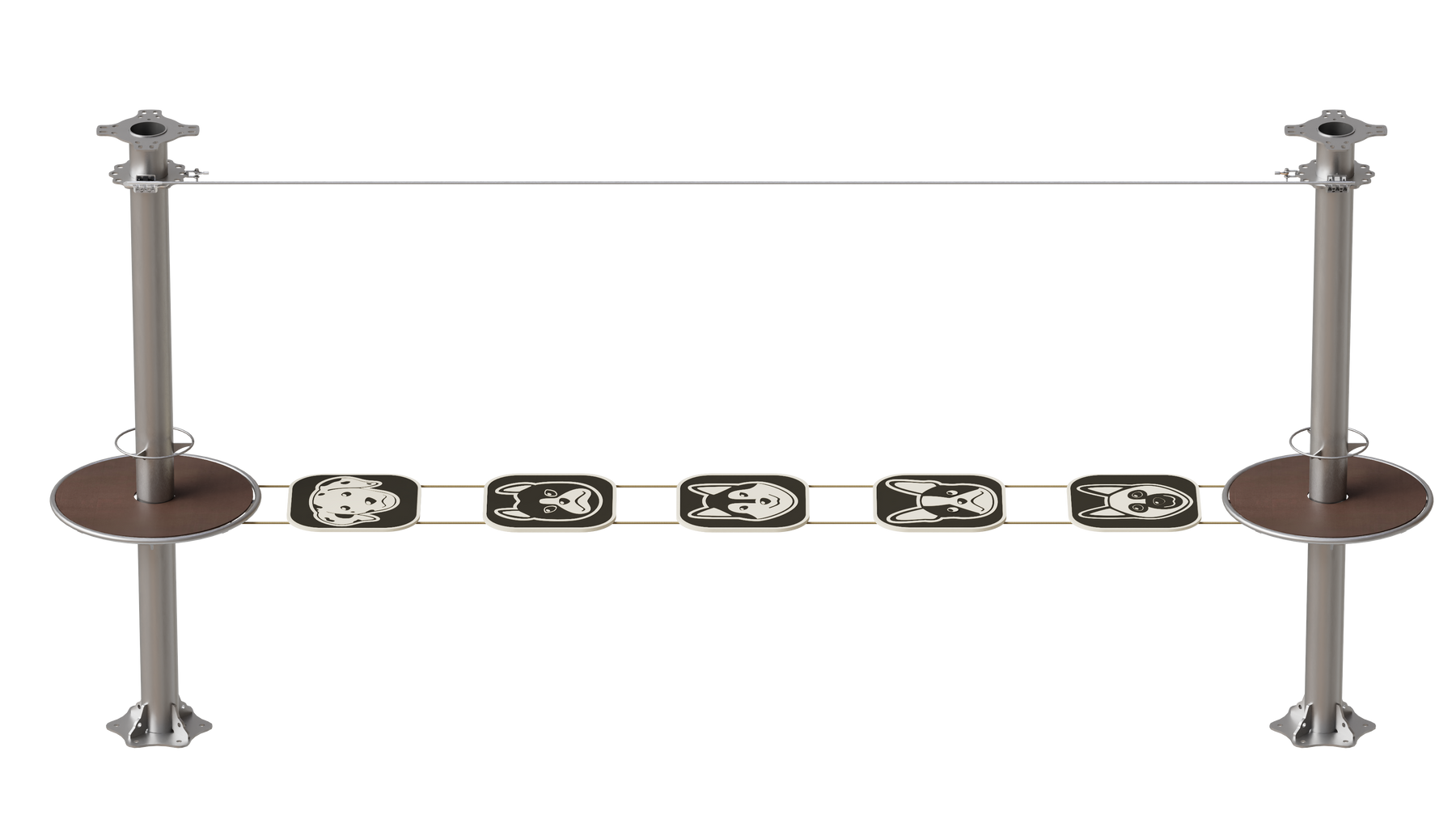 Juego diseñado para parques de aventura, compatible con estructuras de postes de acero o montajes en árboles. Disponible en longitudes estándar de 6 y 7 metros. Para dimensiones personalizadas, consulte con IMN. Anclajes incluidos. Estructura no incluida.