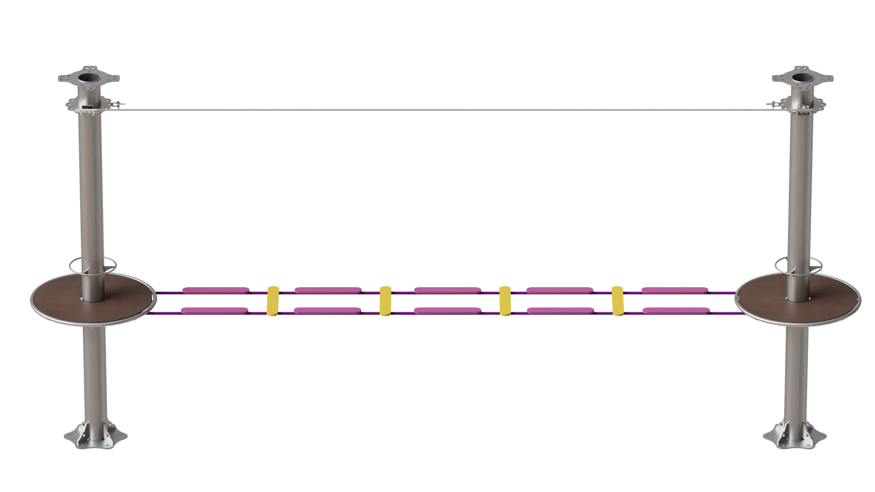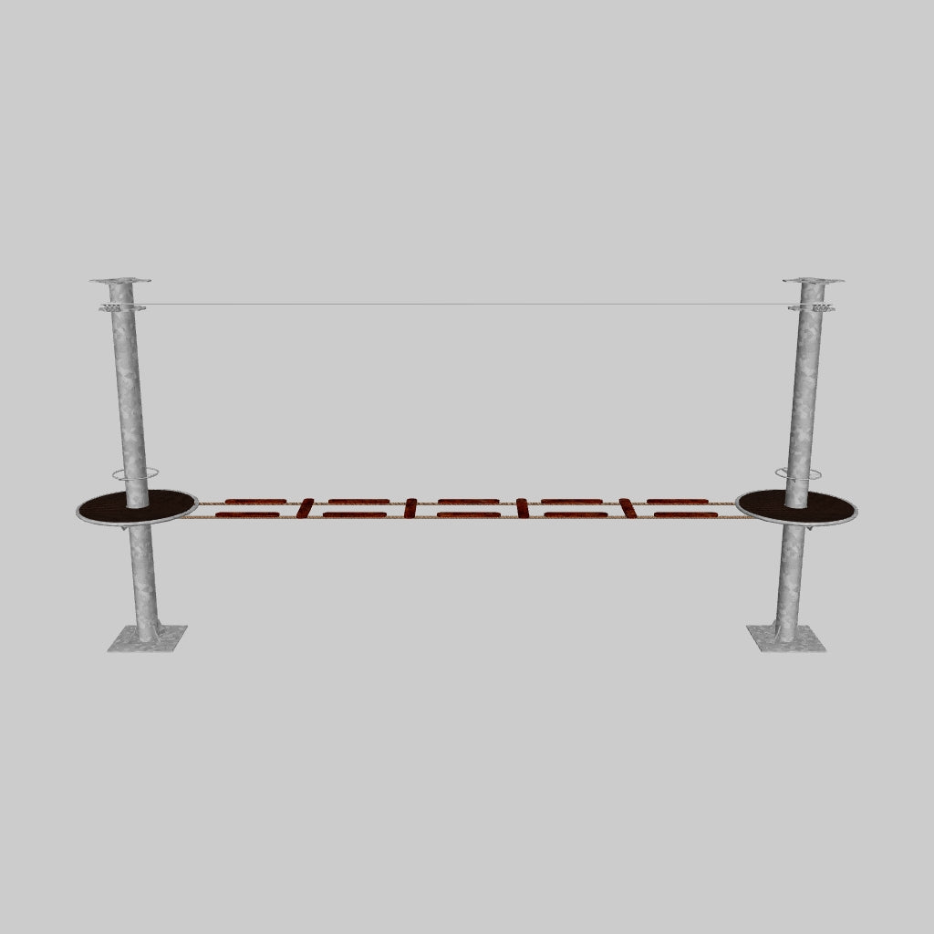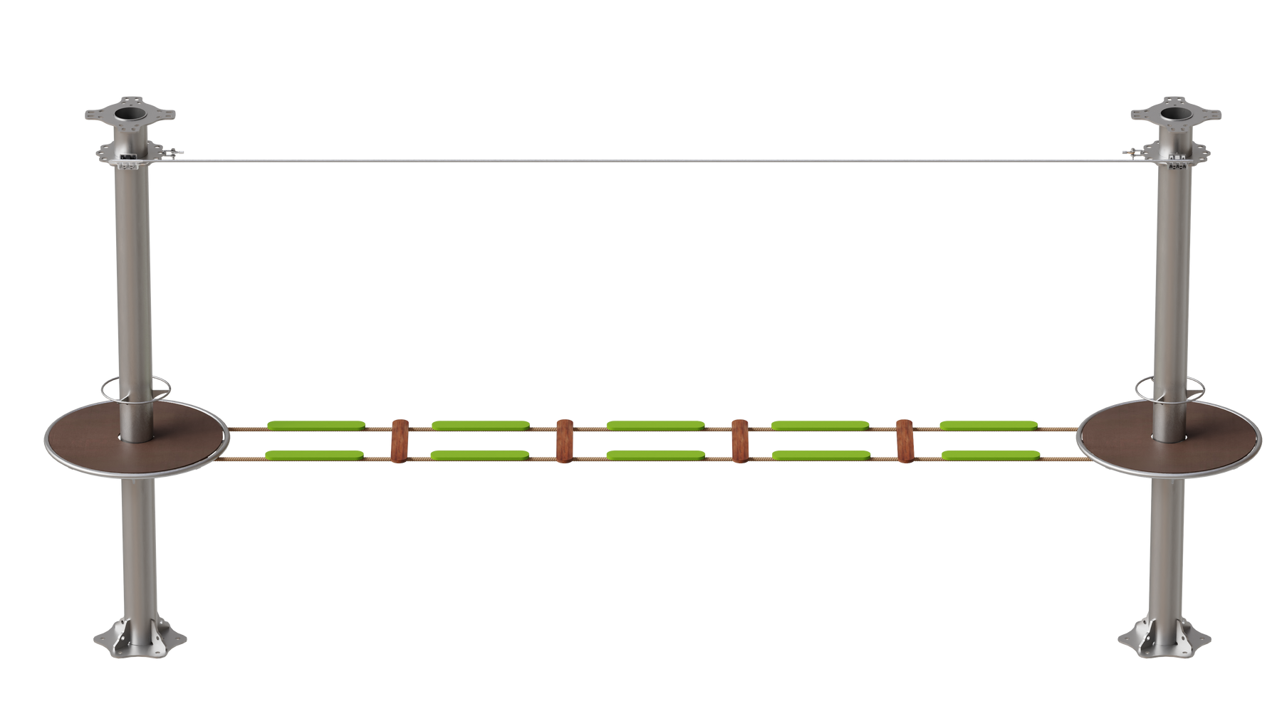 Juego diseñado para parques de aventura, compatible con estructuras de postes de acero o montajes en árboles. Disponible en longitudes estándar de 6 y 7 metros. Para dimensiones personalizadas, consulte con IMN. Anclajes incluidos. Estructura no incluida.