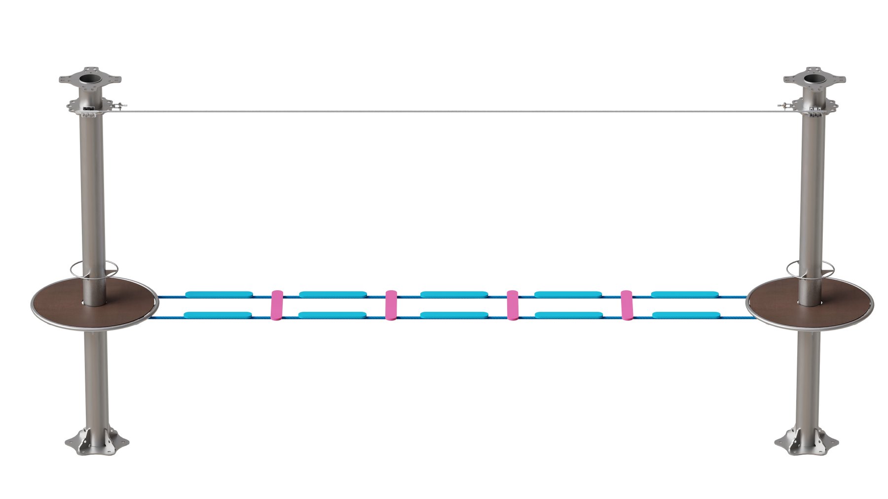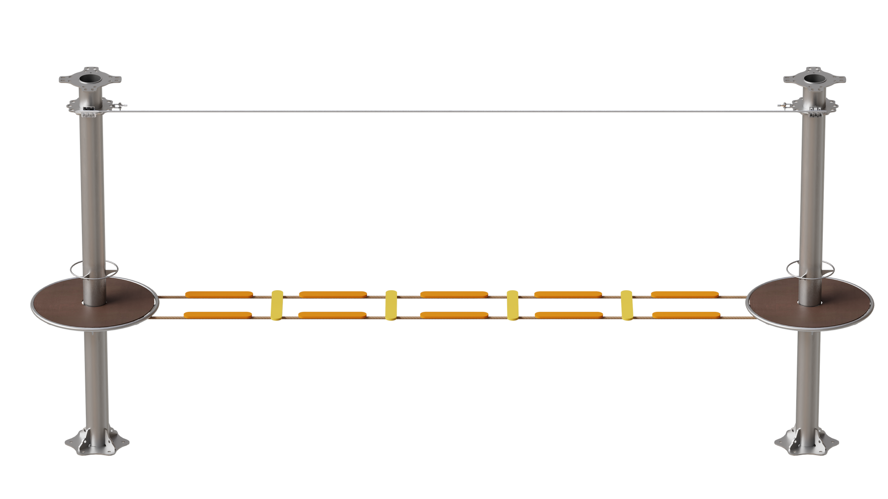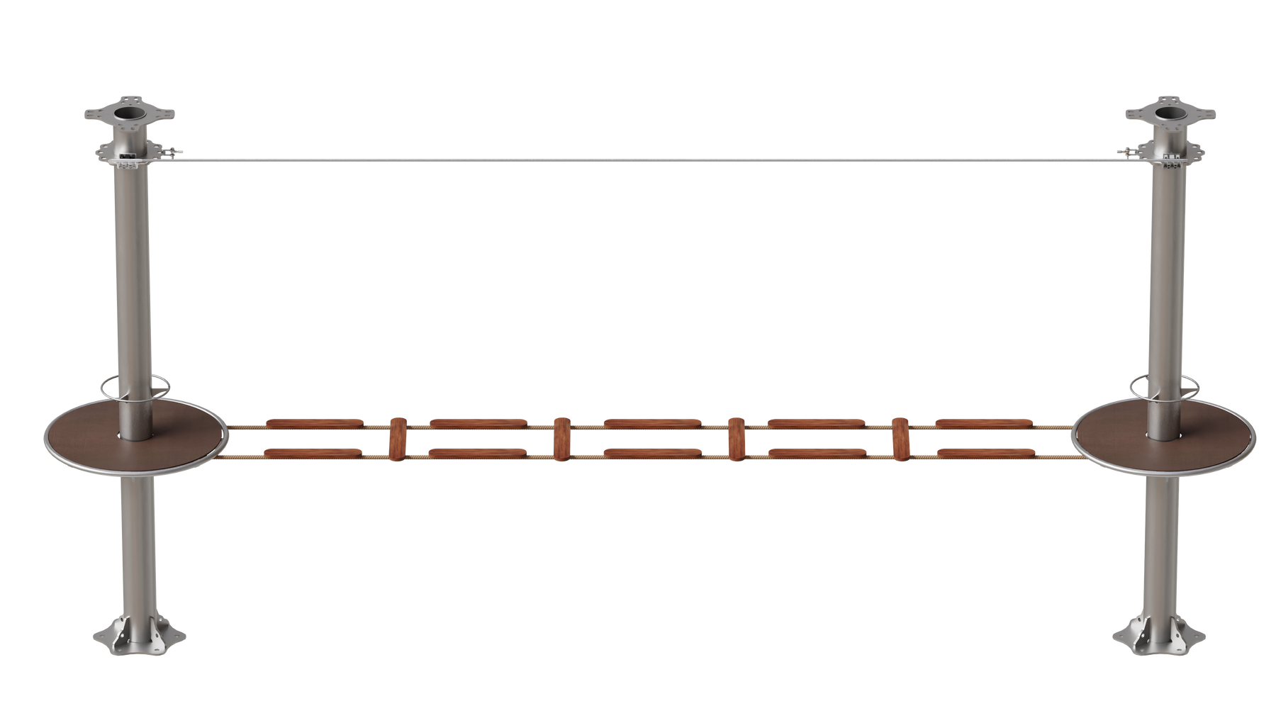 Juego diseñado para parques de aventura, compatible con estructuras de postes de acero o montajes en árboles. Disponible en longitudes estándar de 6 y 7 metros. Para dimensiones personalizadas, consulte con IMN. Anclajes incluidos. Estructura no incluida.