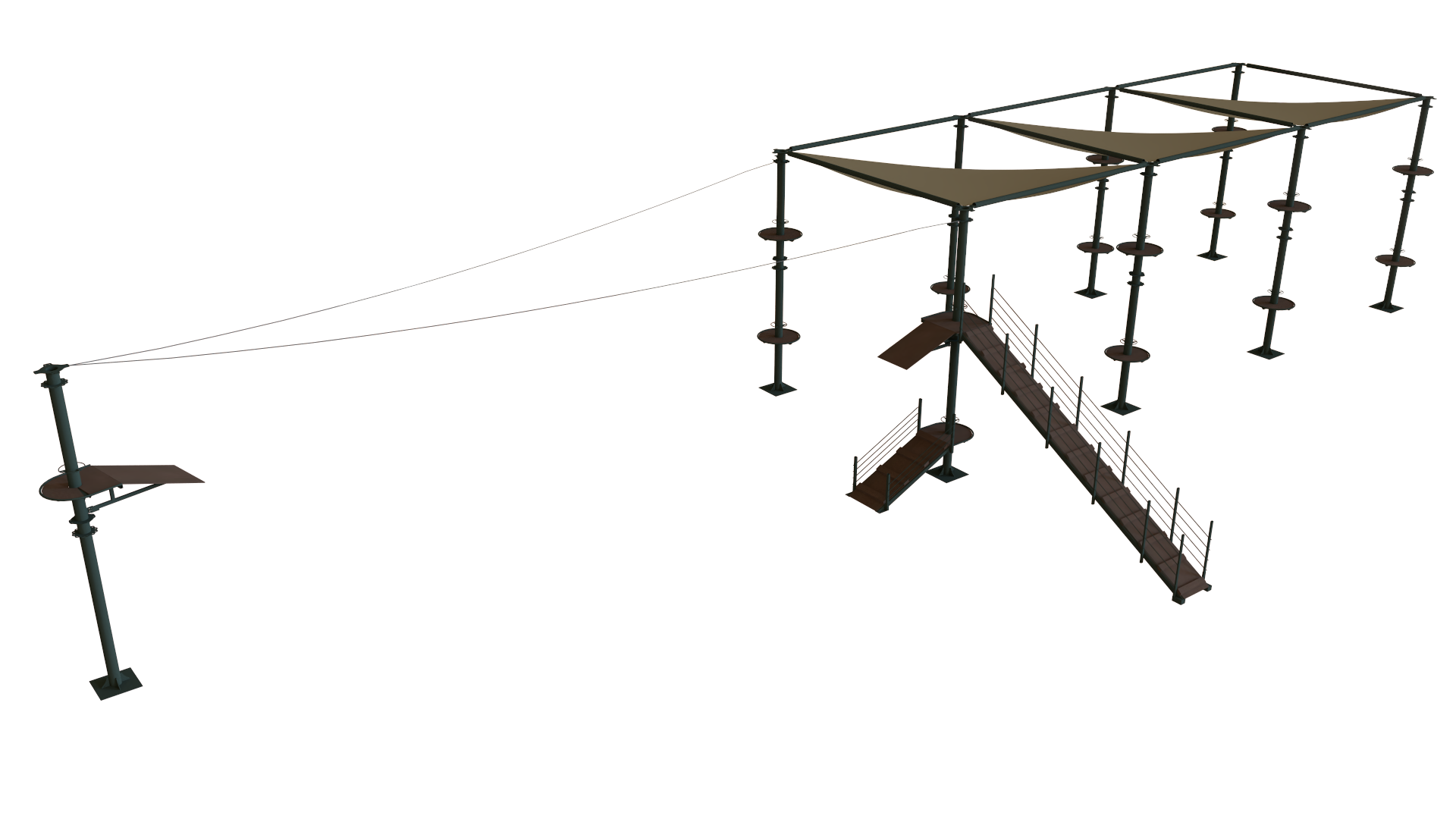 Parque de aventura formado por 8 postes más dos tirolinas y 16 juegos entre pasarelas, puentes, elementos colgantes y muchos más.