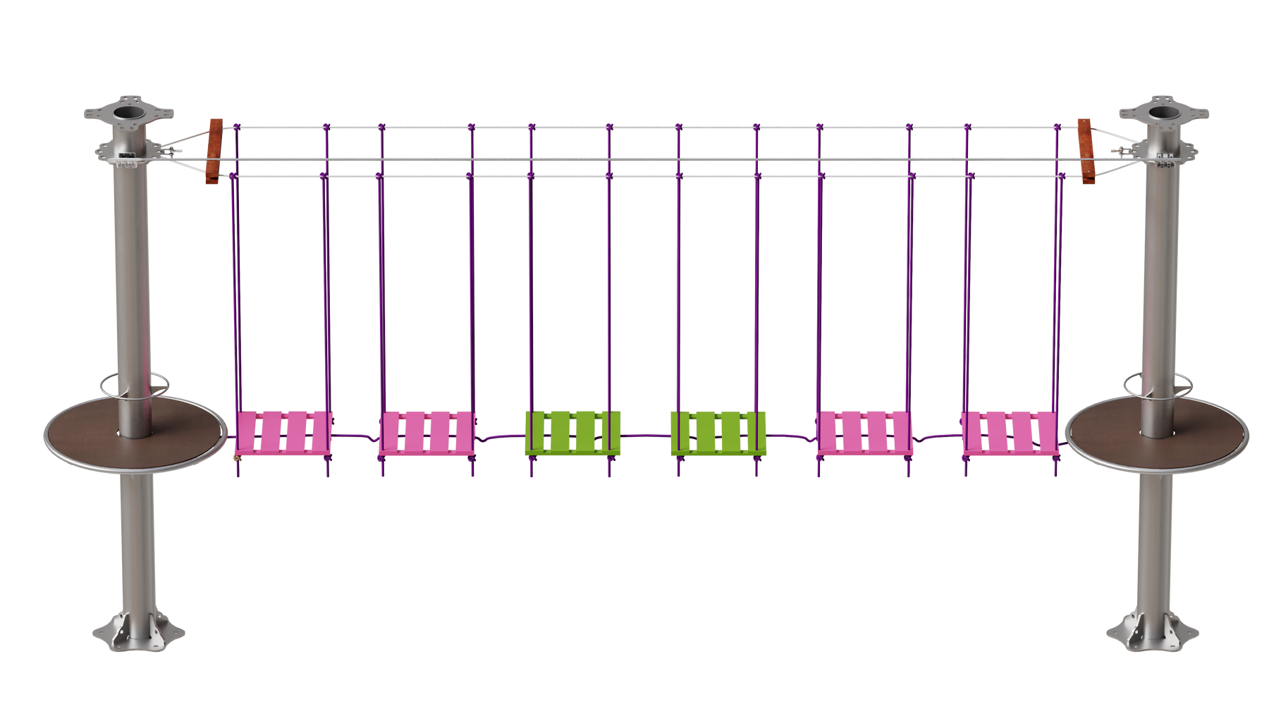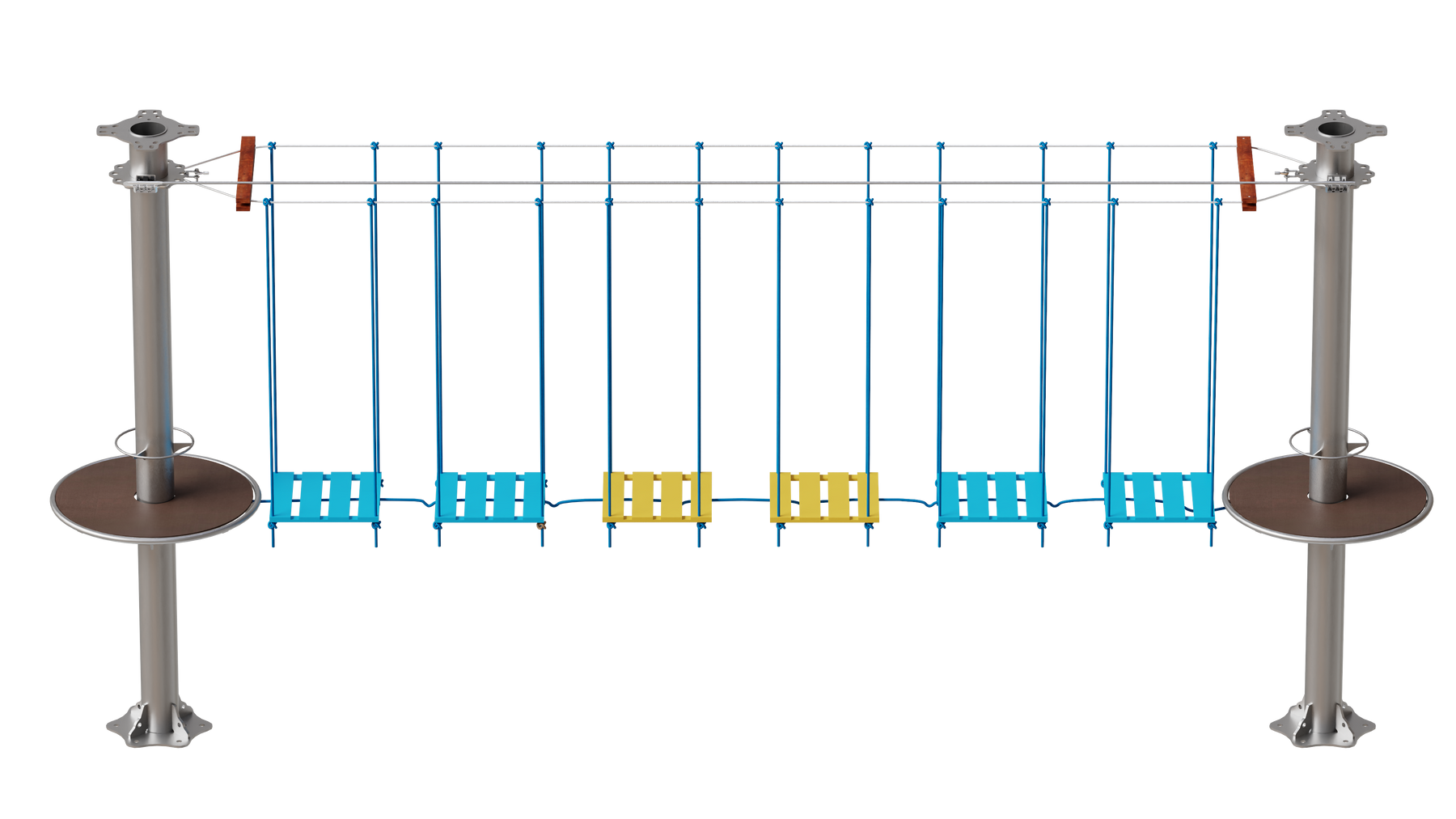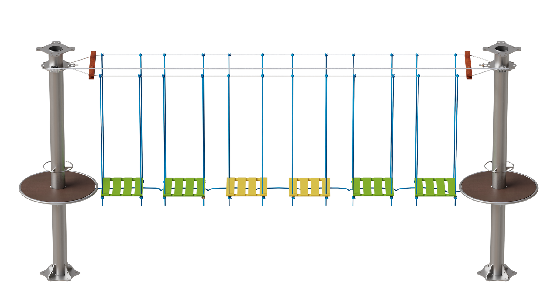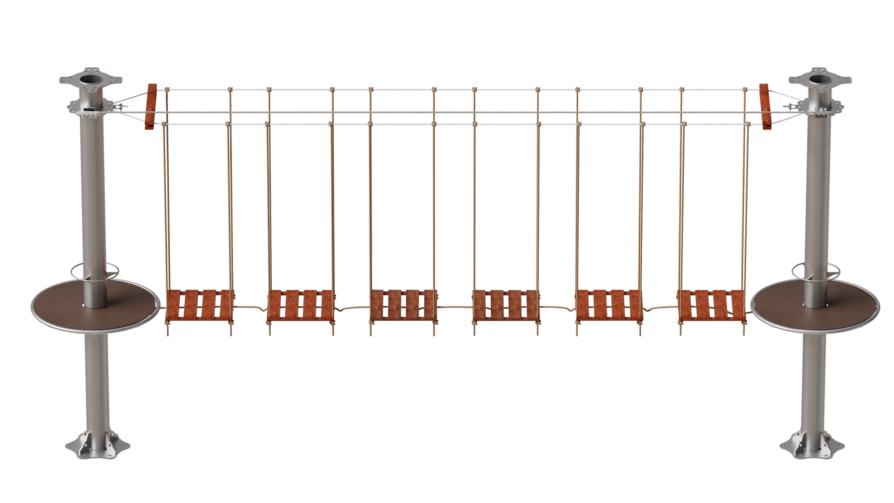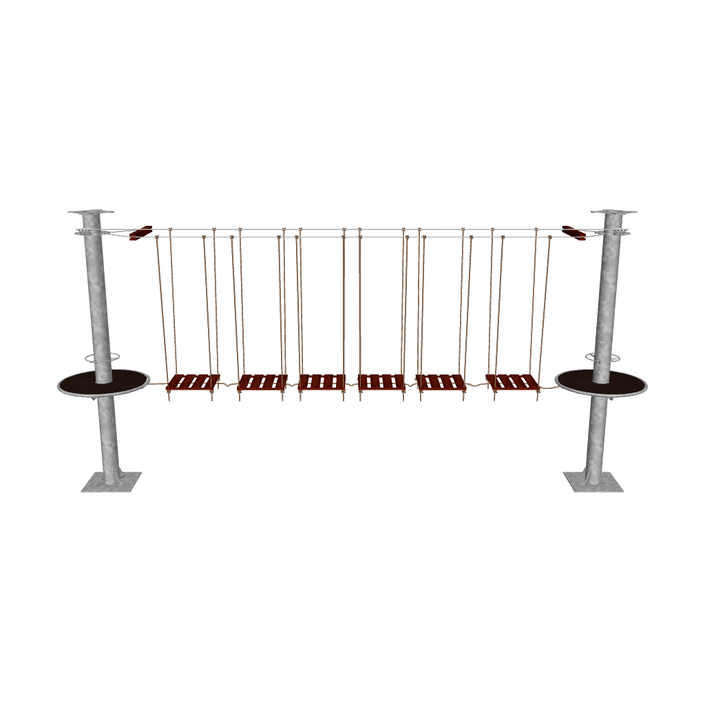Juego diseñado para parques de aventura, compatible con estructuras de postes de acero o montajes en árboles. Disponible en longitudes estándar de 6 y 7 metros. Para dimensiones personalizadas, consulte con IMN. Anclajes incluidos. Estructura no incluida.