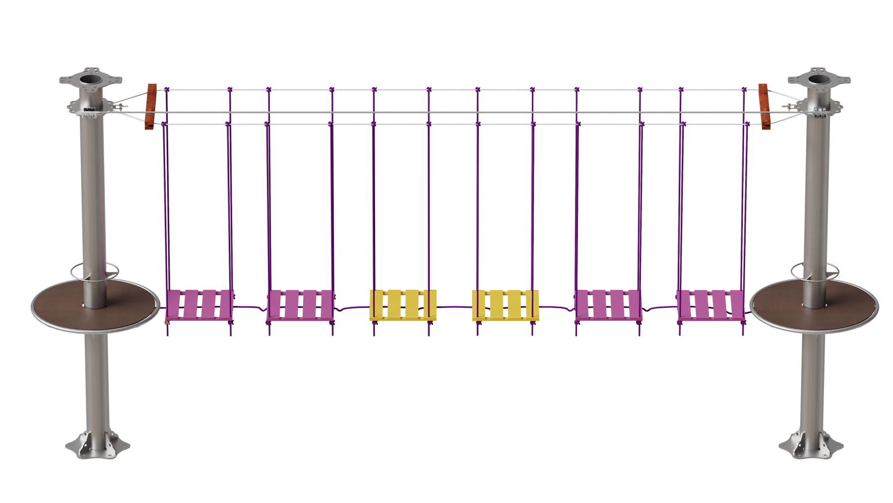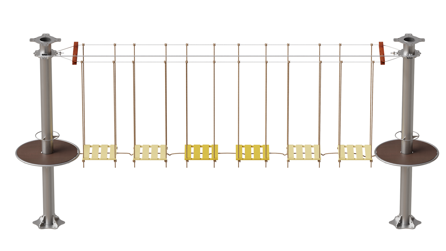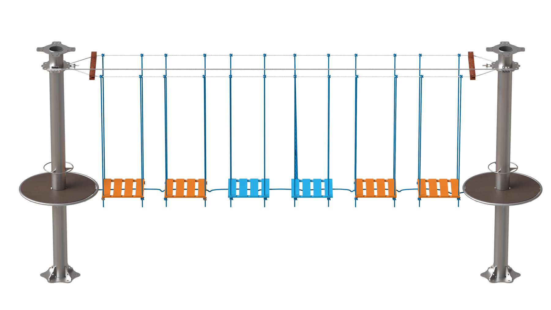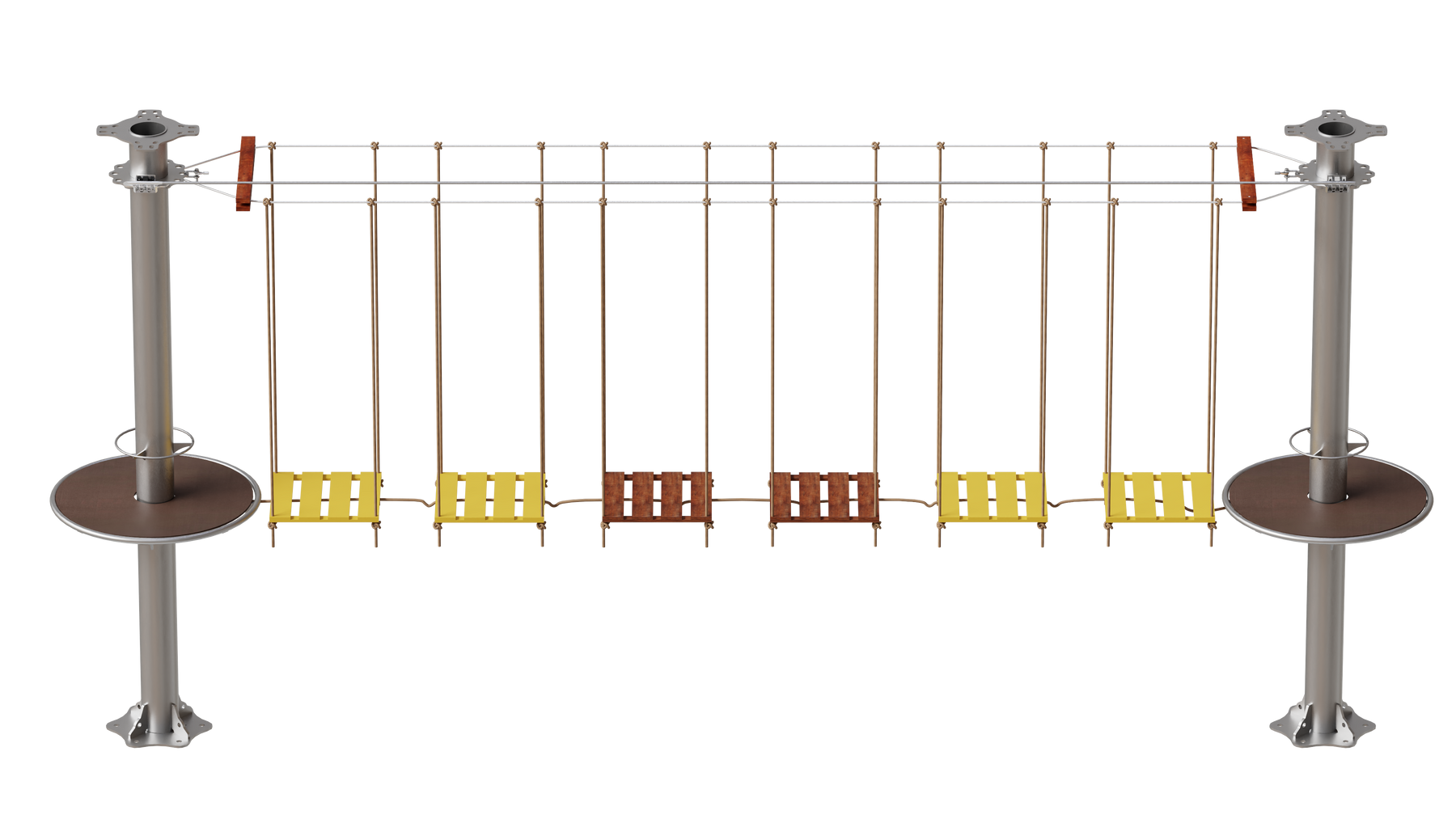 Juego diseñado para parques de aventura, compatible con estructuras de postes de acero o montajes en árboles. Disponible en longitudes estándar de 6 y 7 metros. Para dimensiones personalizadas, consulte con IMN. Anclajes incluidos. Estructura no incluida.